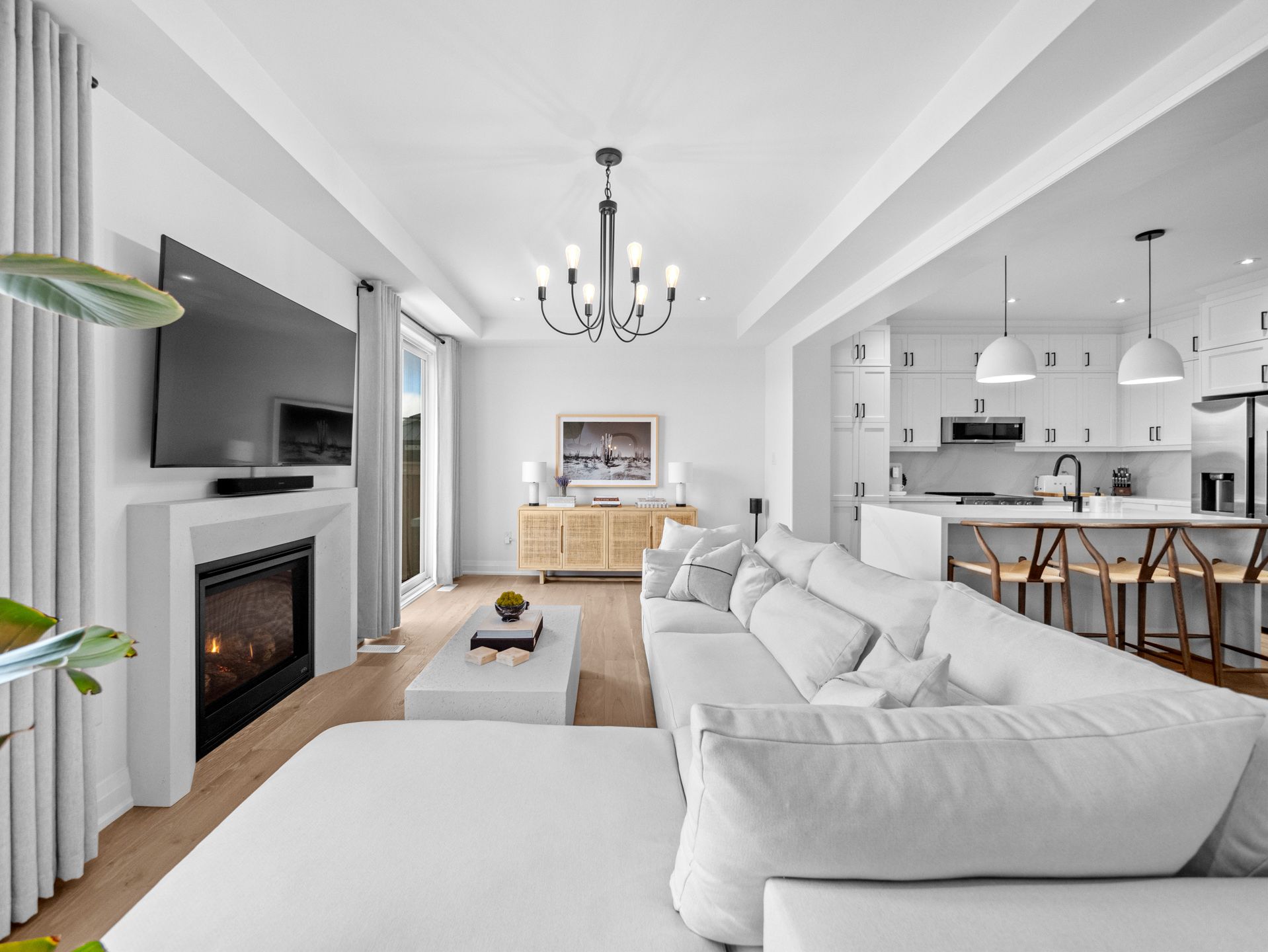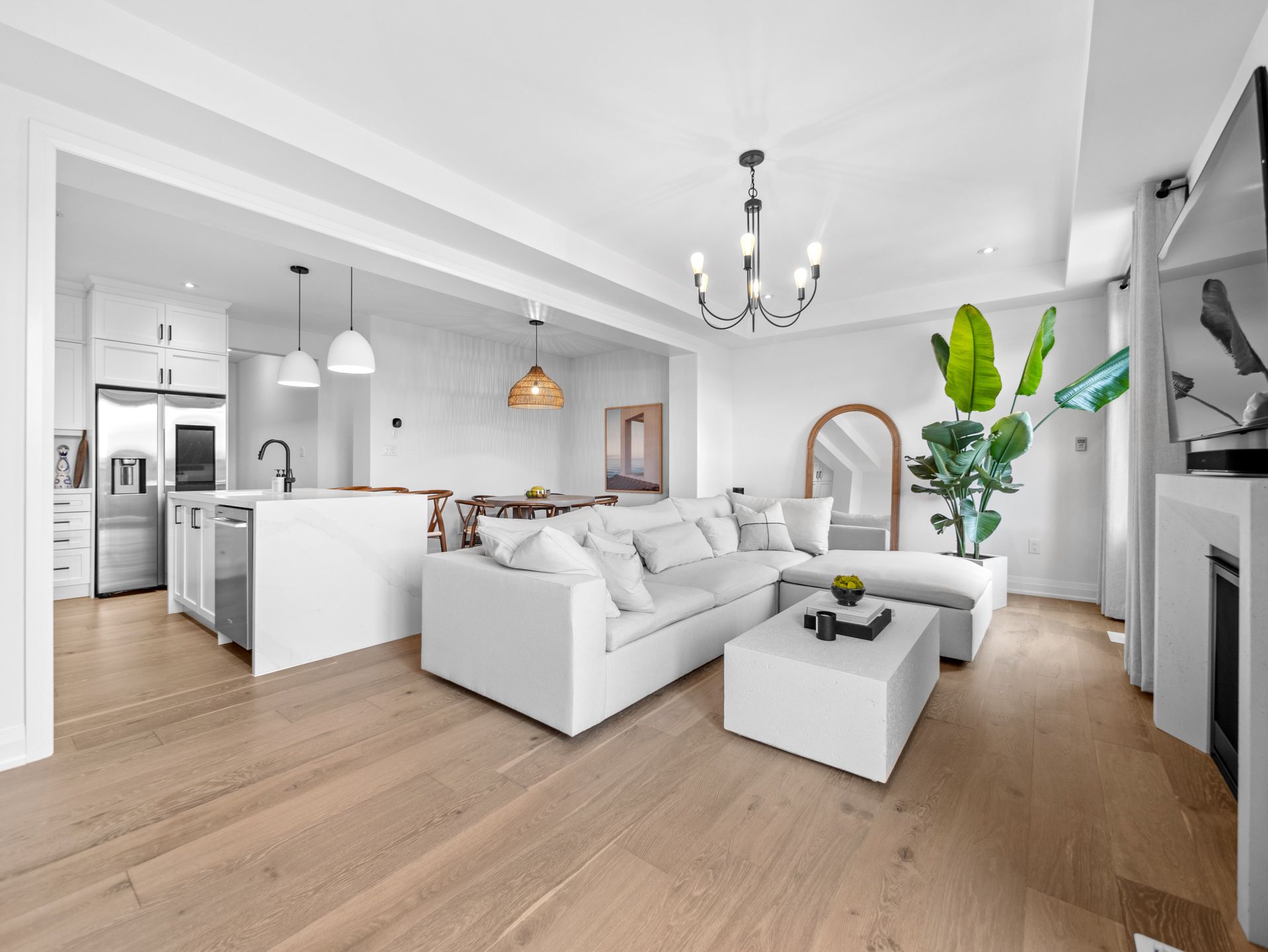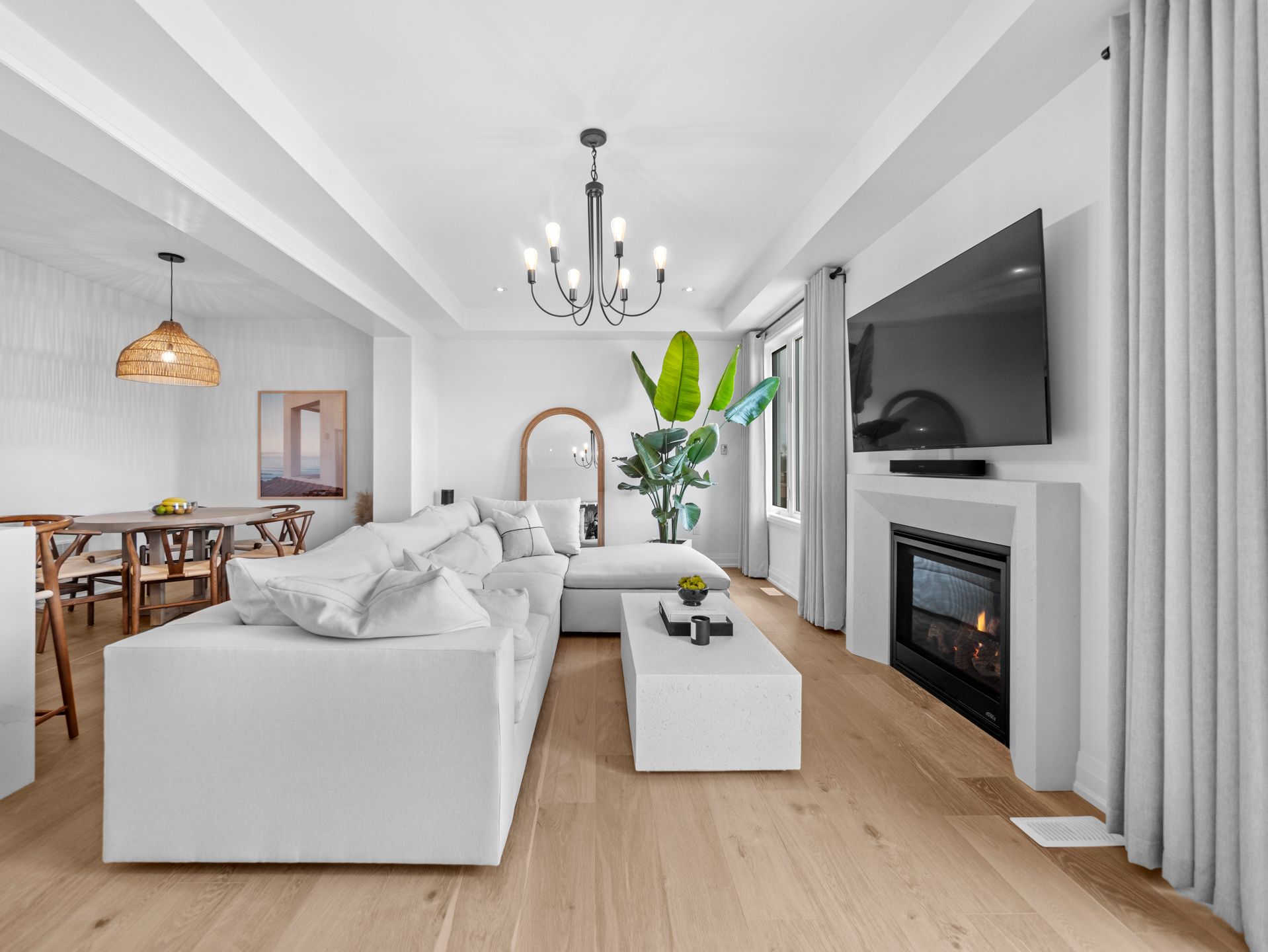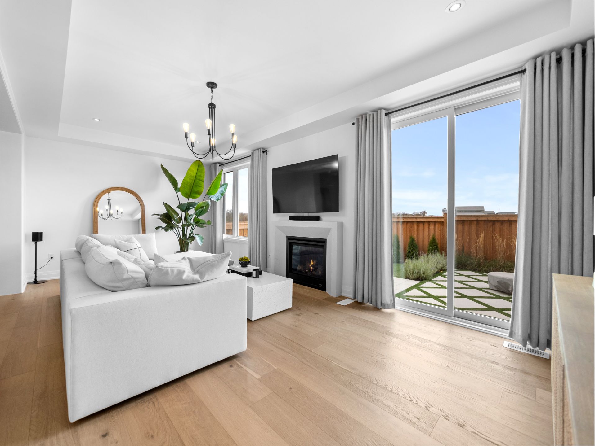 • Open concept main floor with engineered oak hardwood and custom stone fireplace.
