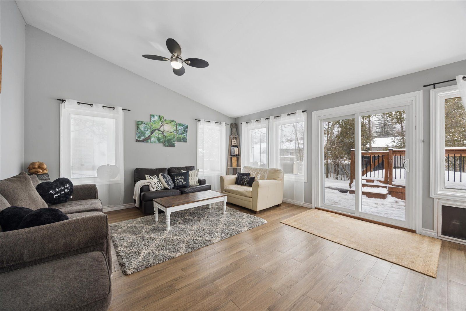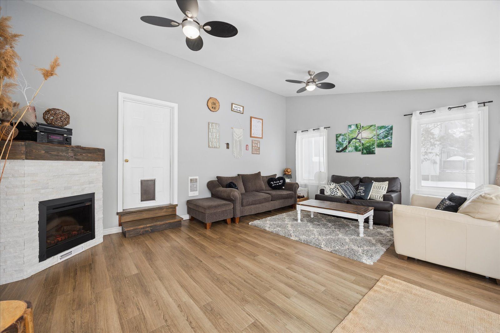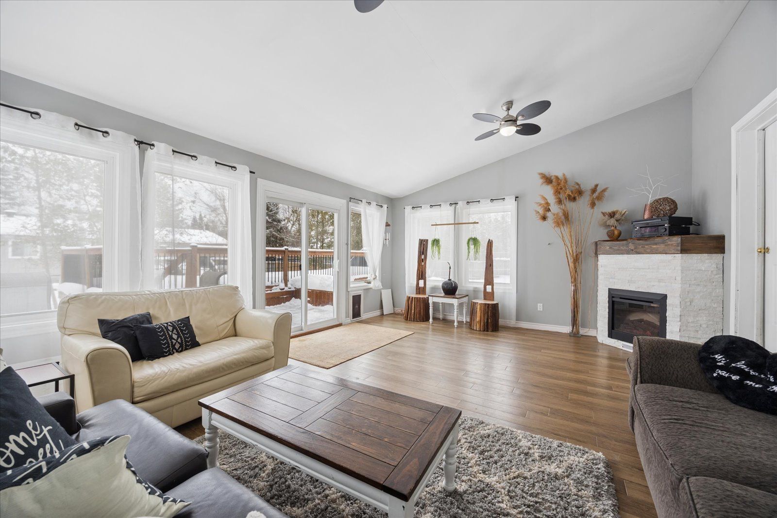• Bright family room with vaulted ceiling and electric fireplace.