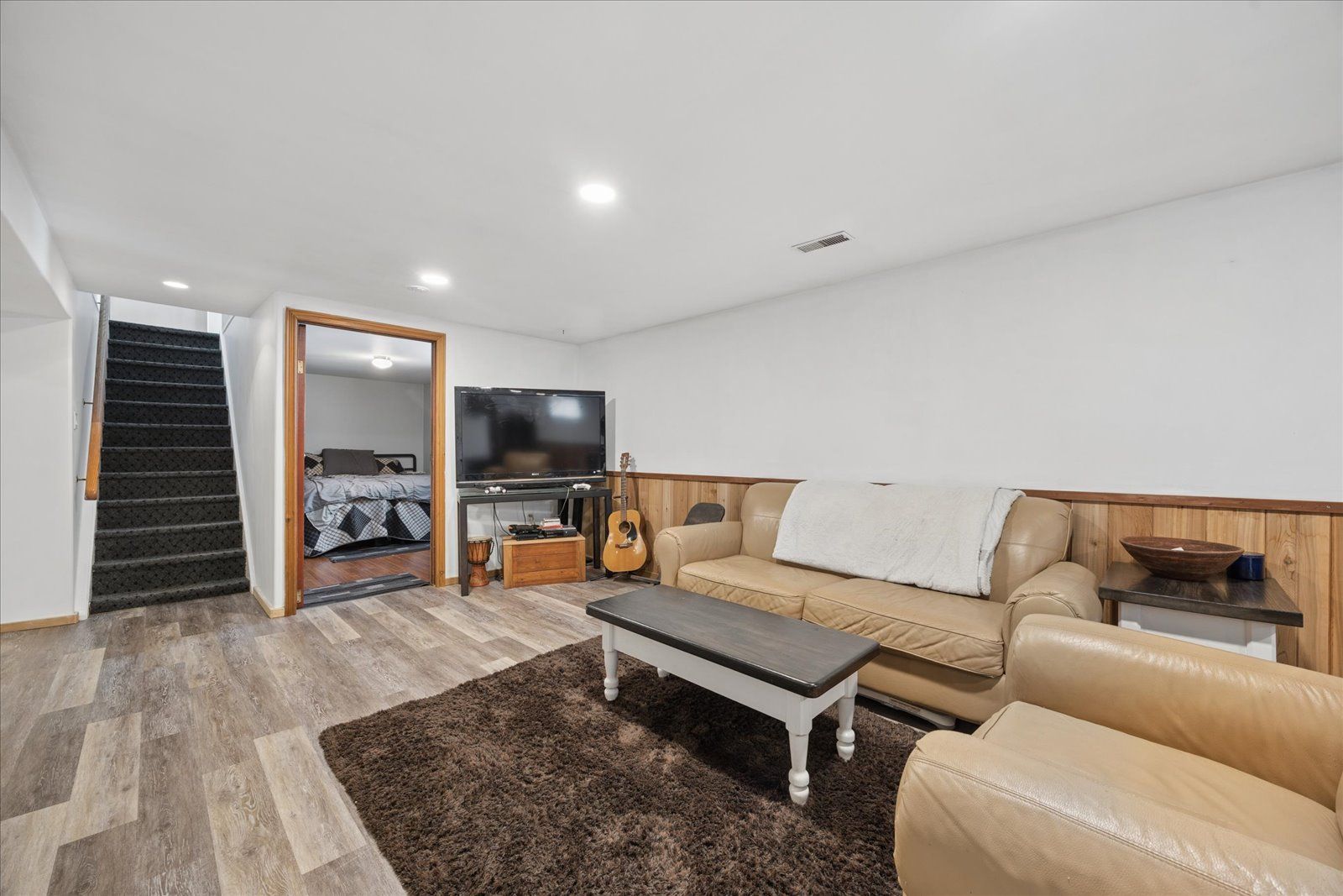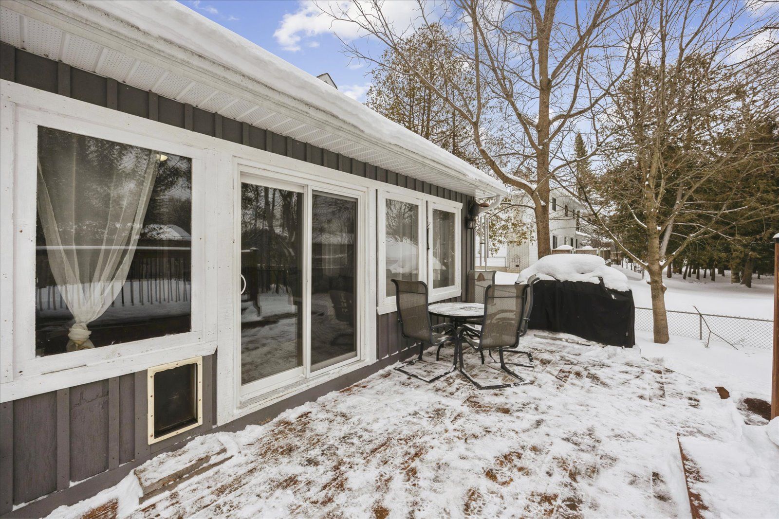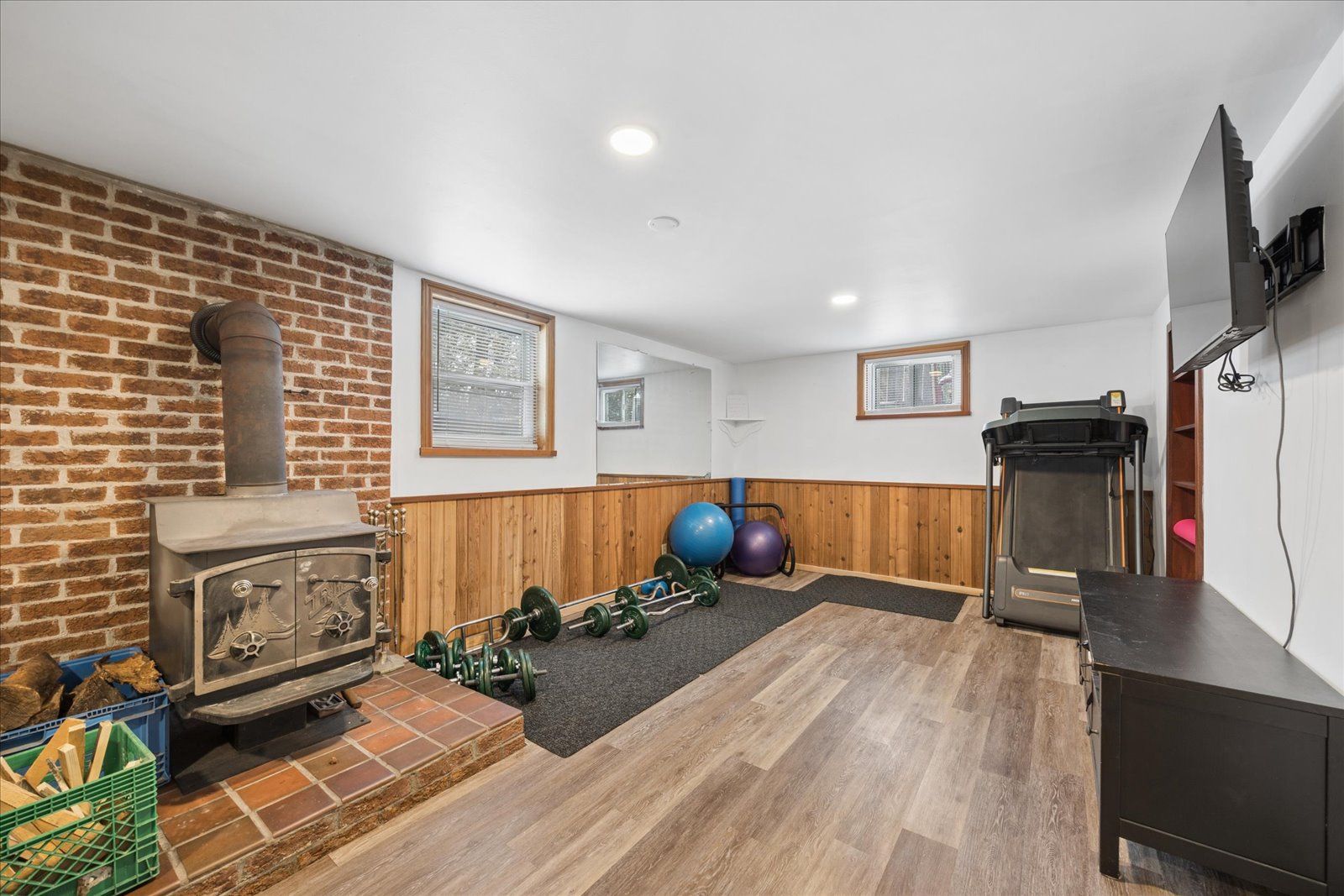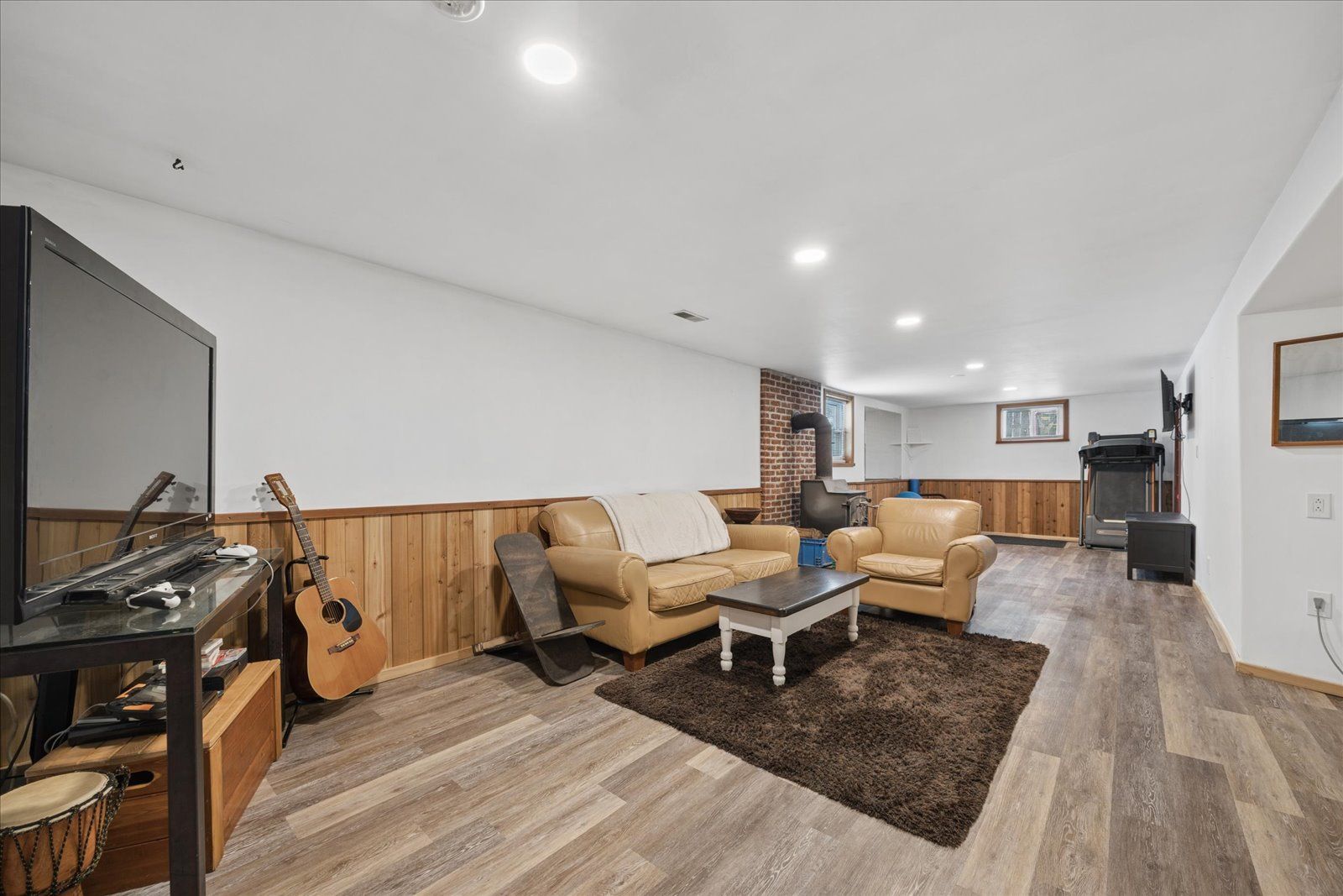 • Bright family room with vaulted ceiling and electric fireplace.