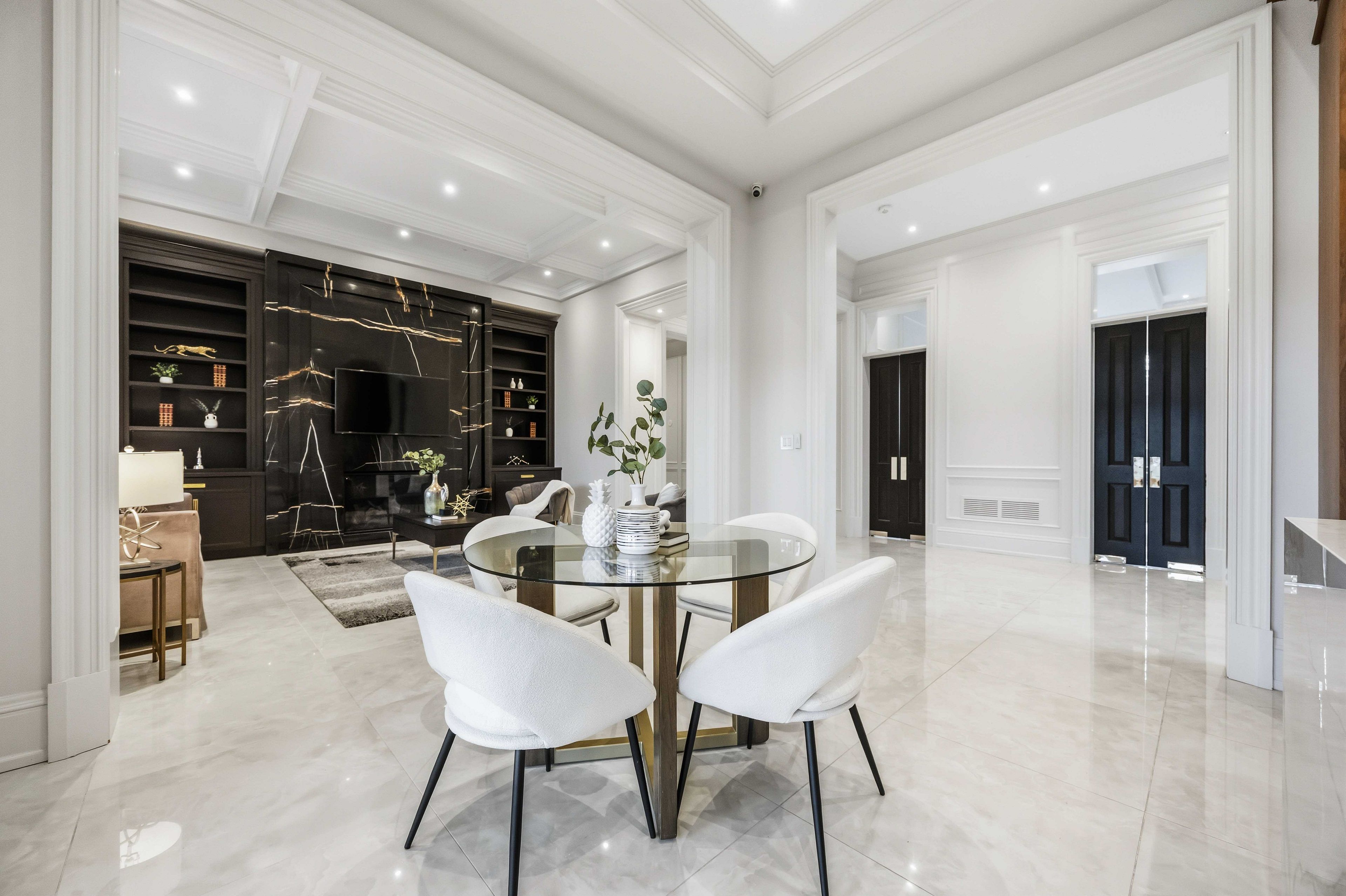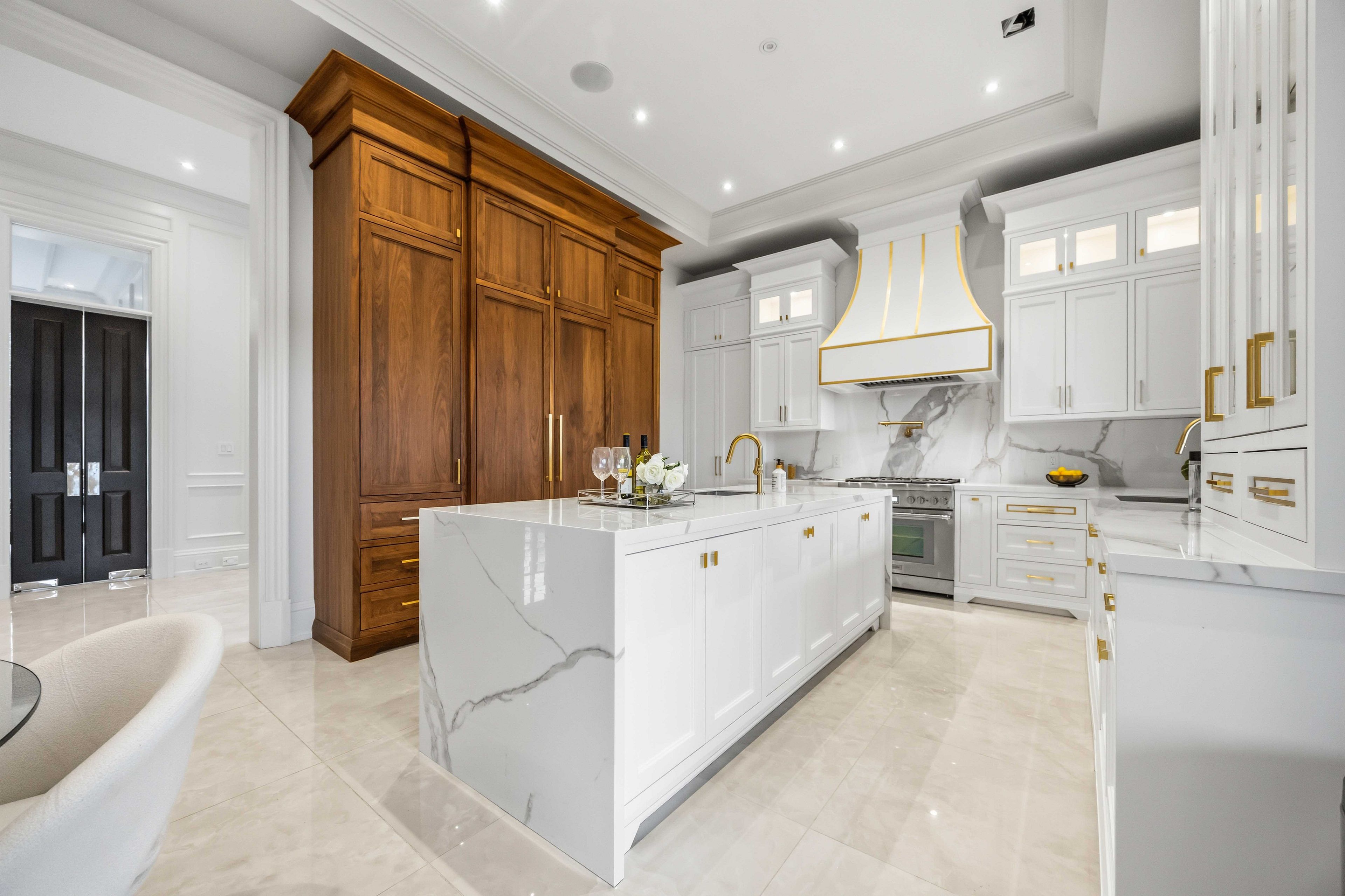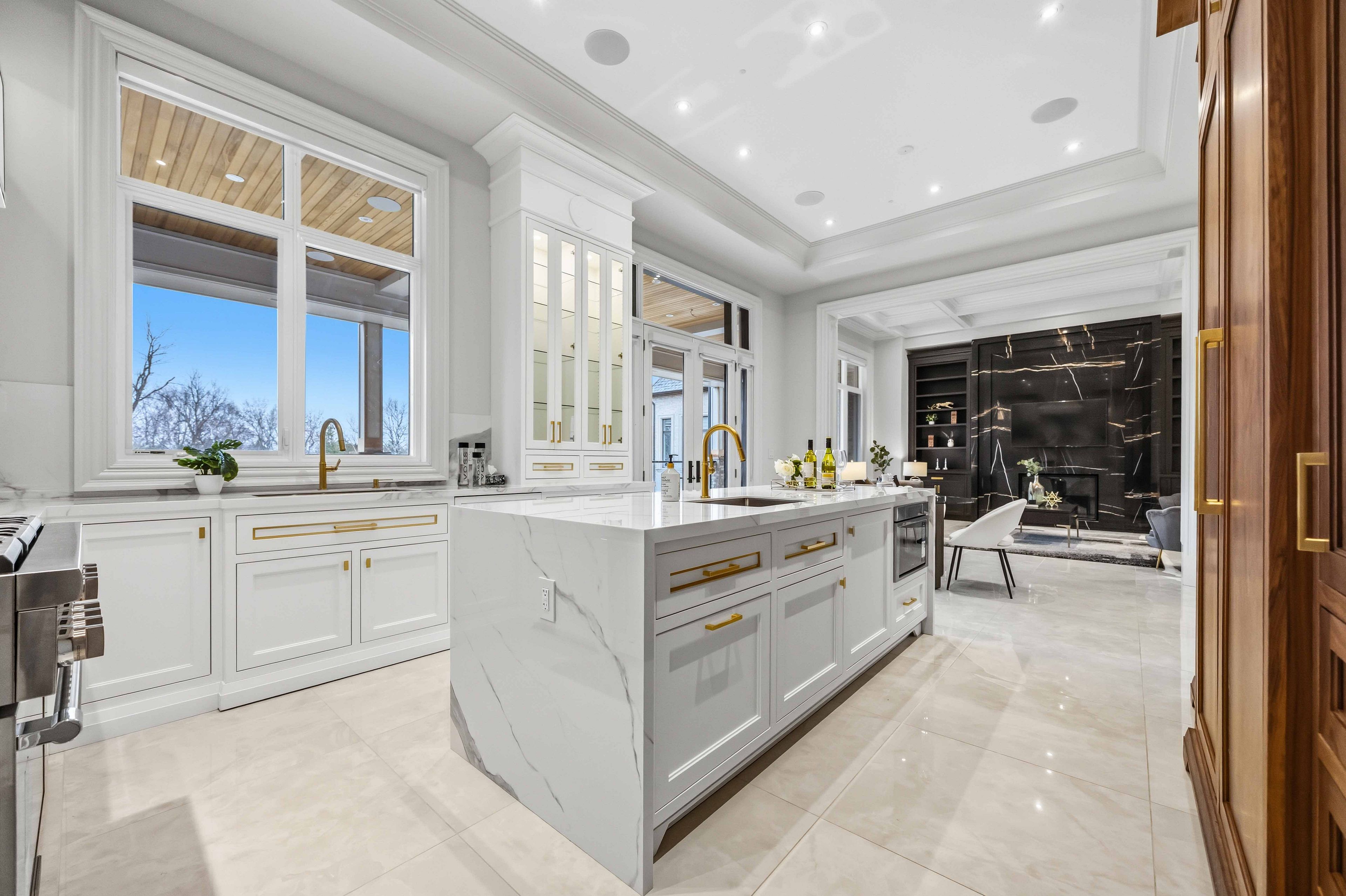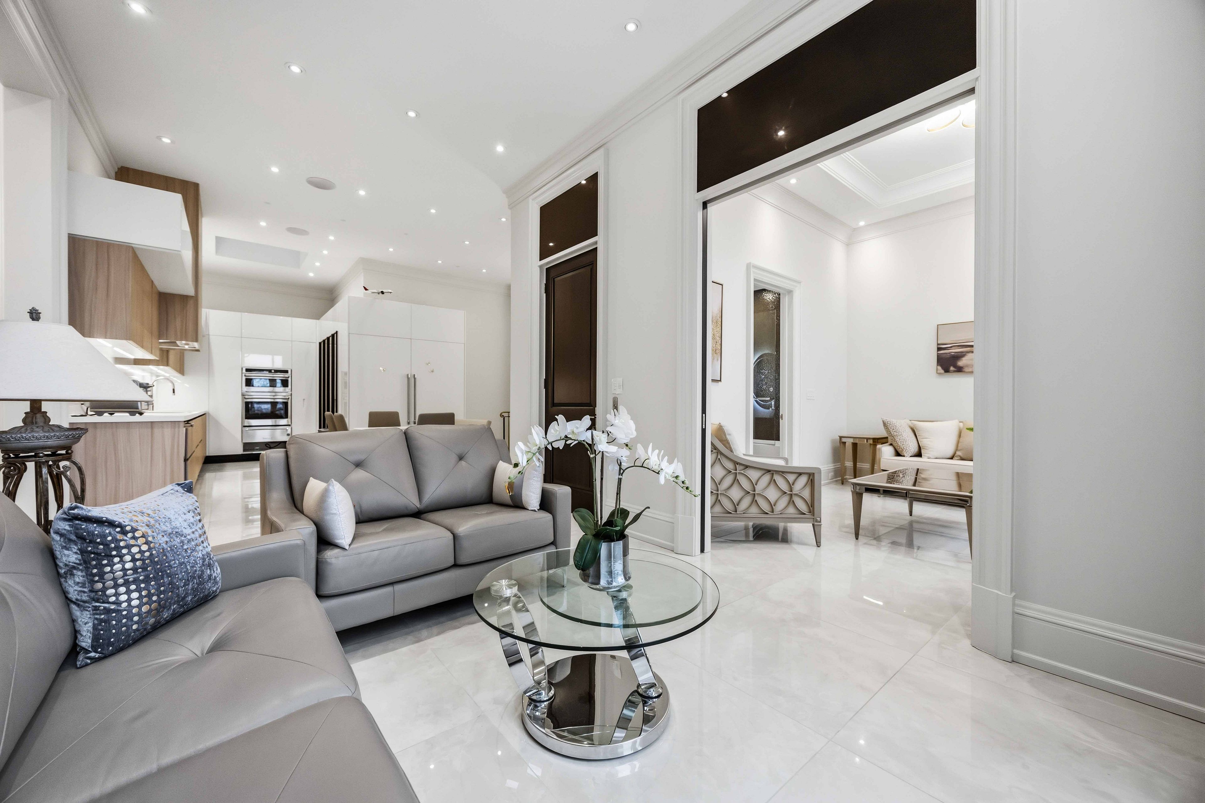• Main estate features dramatic ceilings, formal spaces, and a luxurious kitchen.