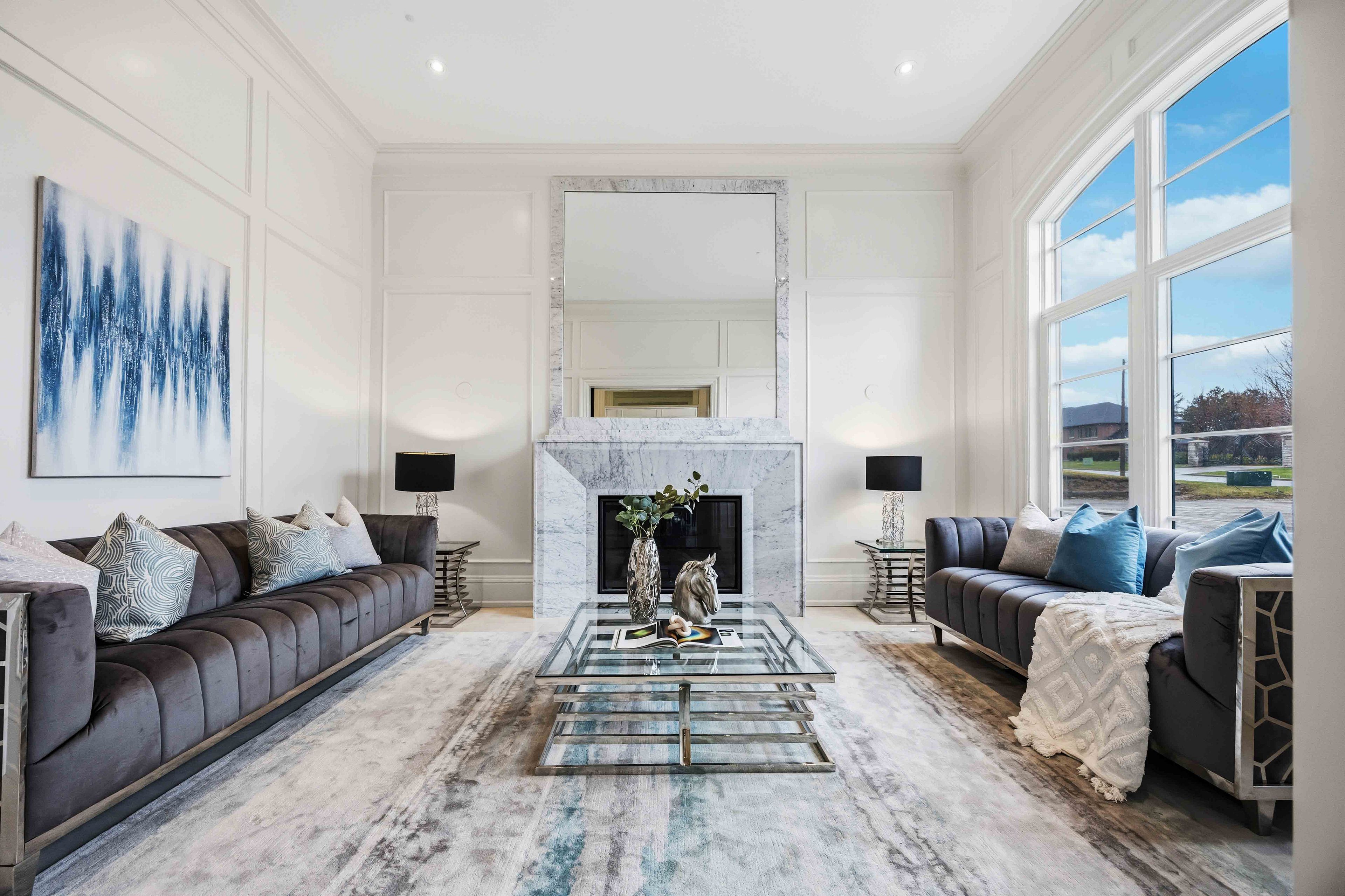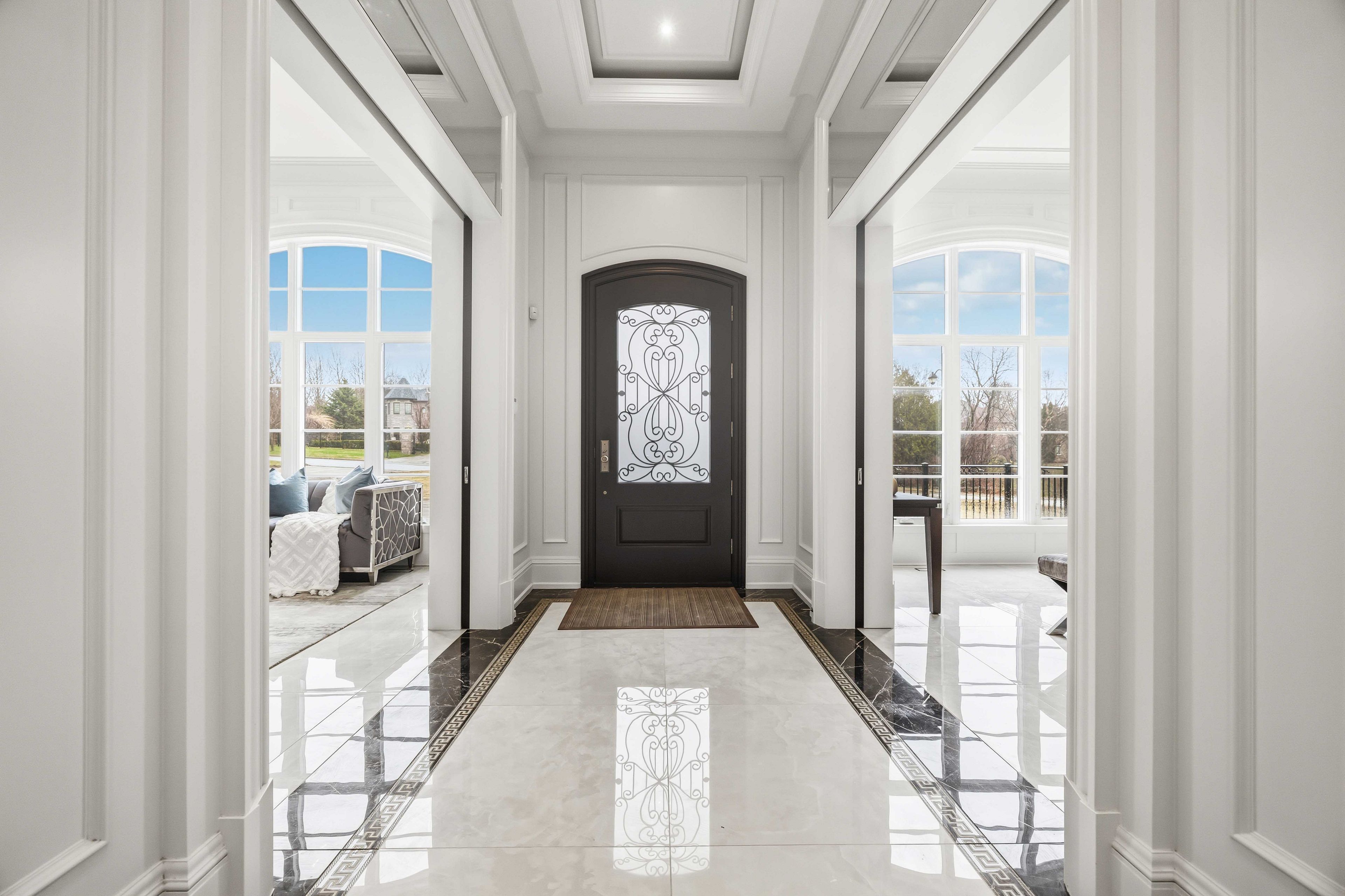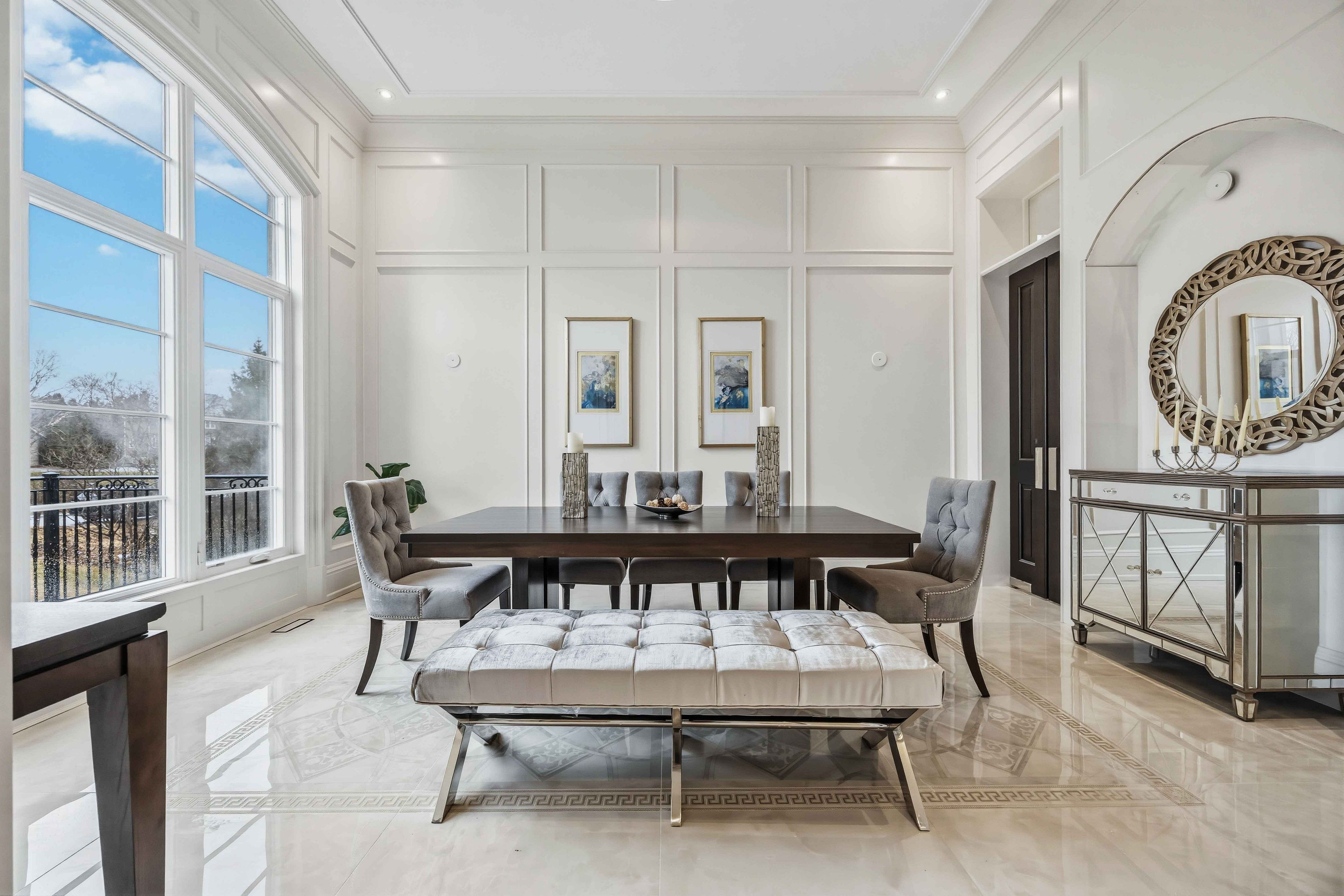 • Main estate features dramatic ceilings, formal spaces, and a luxurious kitchen.