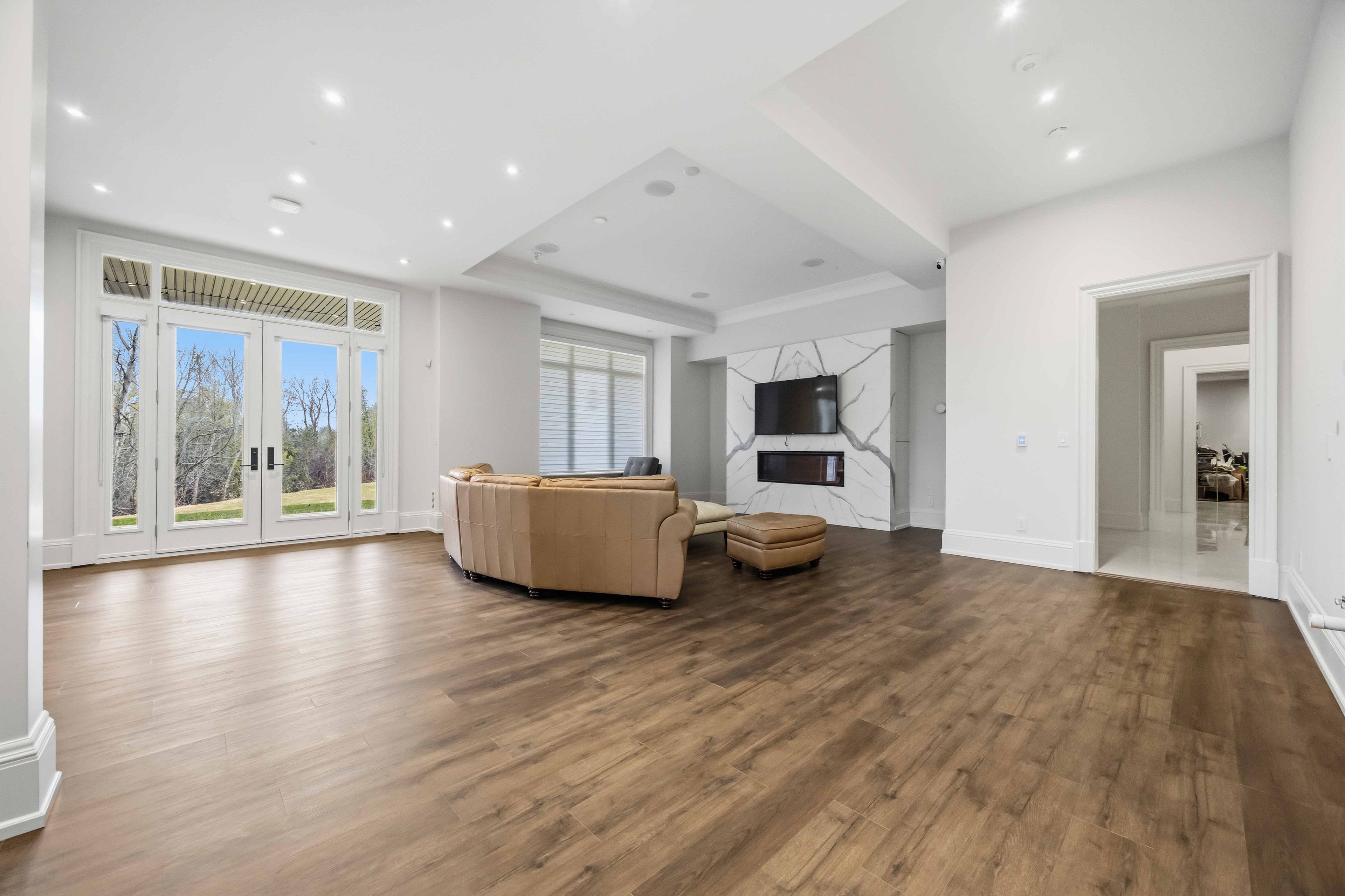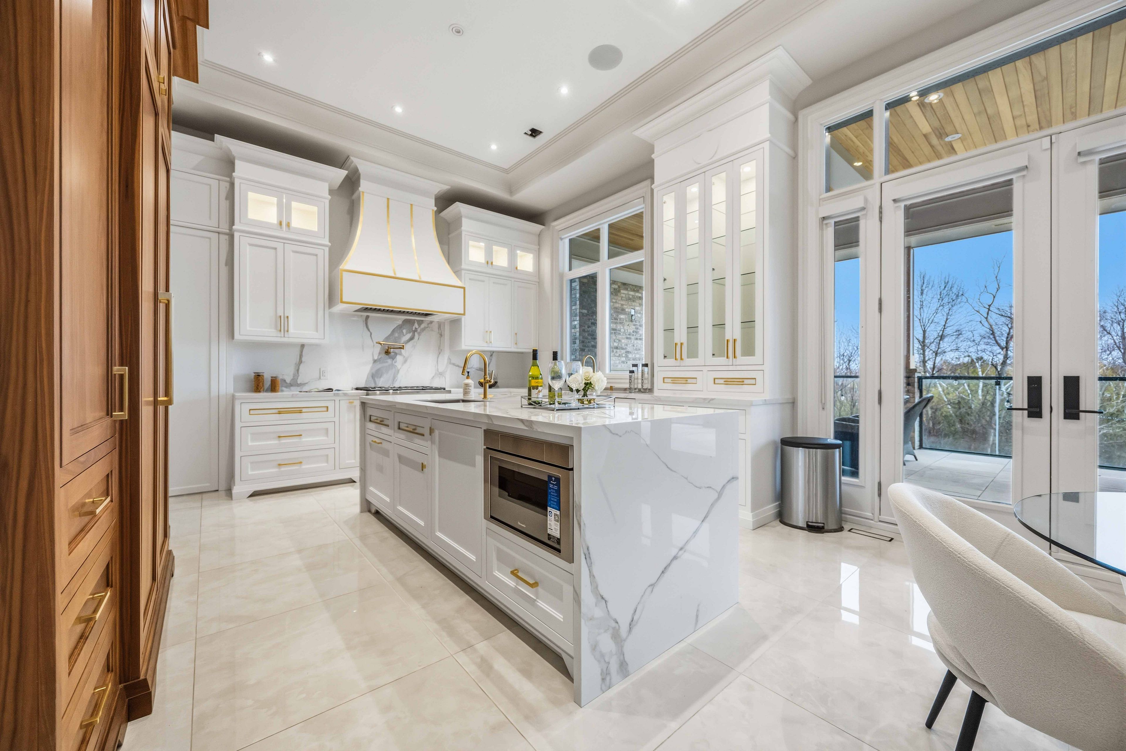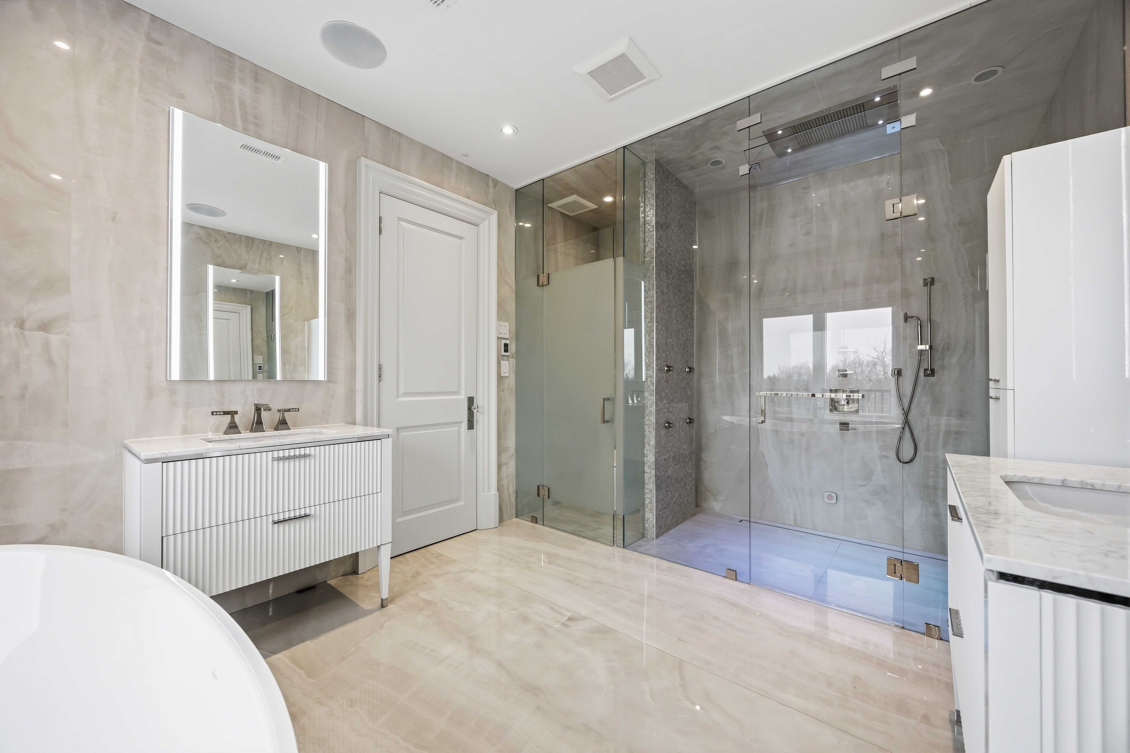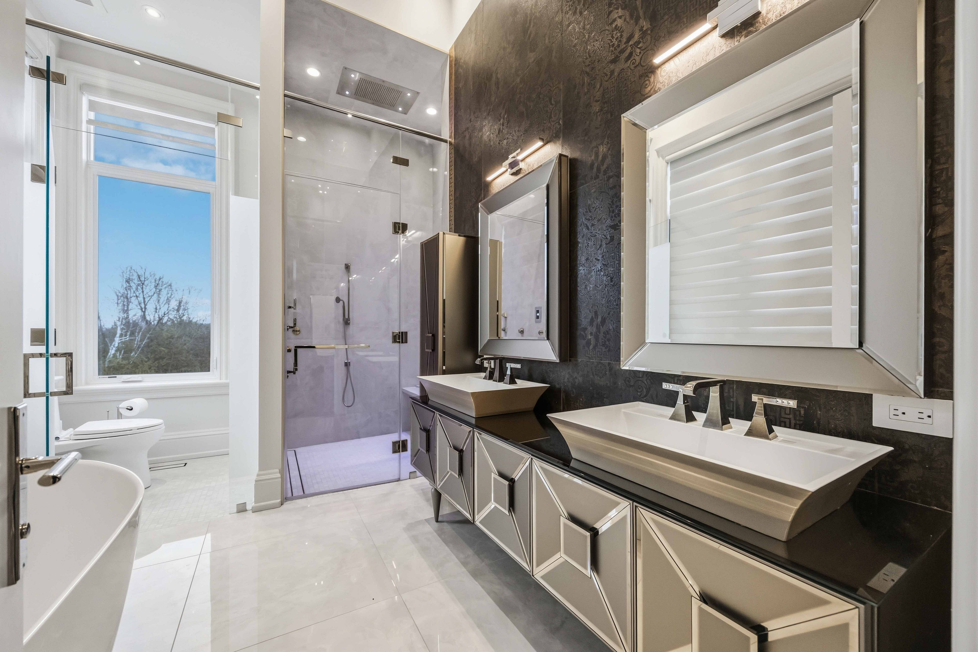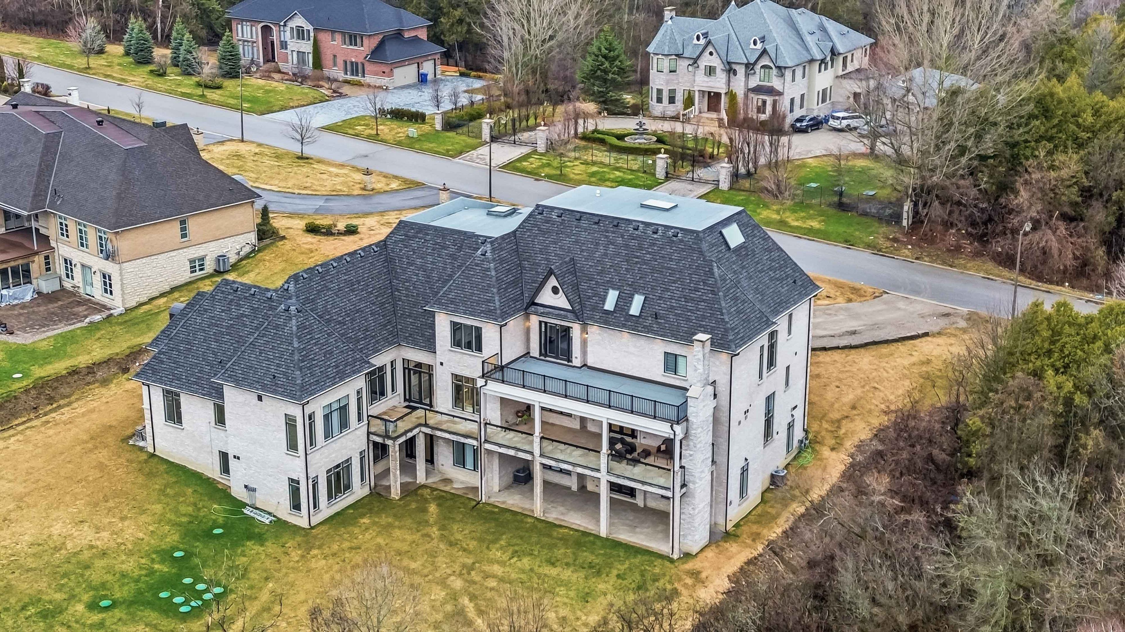 Some homes are built. This one is composed. Bethesda forest estates is one of york region's most distinguished custom estate enclaves - private conservation ravine lots, minutes to highway 404, forty minutes to downtown toronto. 76 cedar ridge road sits on two private acres within it: years in the making, complete as of this spring. The build announces its standard before you step inside. Natural indiana limestone facade. Belden brick. Copper roof. Solid mahogany doors. Sherle wagner plumbing fittings in every washroom of both residences. The materials were chosen once and held throughout. It is not one home. It is two - each complete, each private, each extraordinary - built for the exceptional family that refuses to ask its members to choose between closeness and independence. The main estate unfolds across four levels. Ceilings climb form twelve to twenty feet. Versace porcelain tile underfoot. A formal sitting room centered on a marble gas fireplace. The kitchen is anchored by a thermador six-burner range - brand new, never cooked on - with a waterfall island and custom gold-motif hood. And concealed behind seamless cabinetry: a fully equipped prep kitchen with its own stove, fridge, and dishwasher, waiting for the evenings when everyone is here. The lower level refuses to be called a basement: twelve-foot ceilings, radiant-heated tile, marble fireplace, full walkout to the cedar-lined heated loggia with wood-burning fireplace and ravine beyond. The primary suite soars to twenty feet - private balcony, spa ensuite, skylit walk-in. Five ensuite bedrooms. Three-car heated garage with car lift. The second residence earns its plural: two complete apartments - each with its own pedini italian kitchen, fireplace, and spa ensuite. Connected by private elevator. Versace tile and sherle wagner fittings throughout. Private entrance. Two-car heated garage. Completely independent. Quietly connected. Immediate possession.