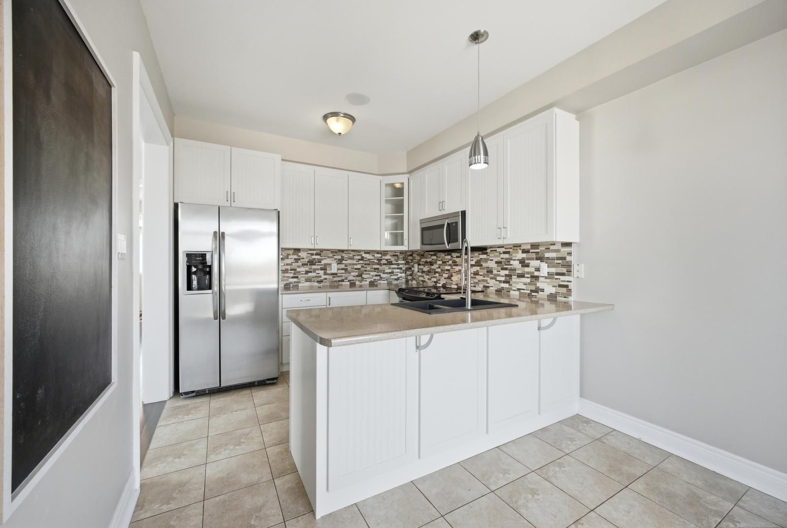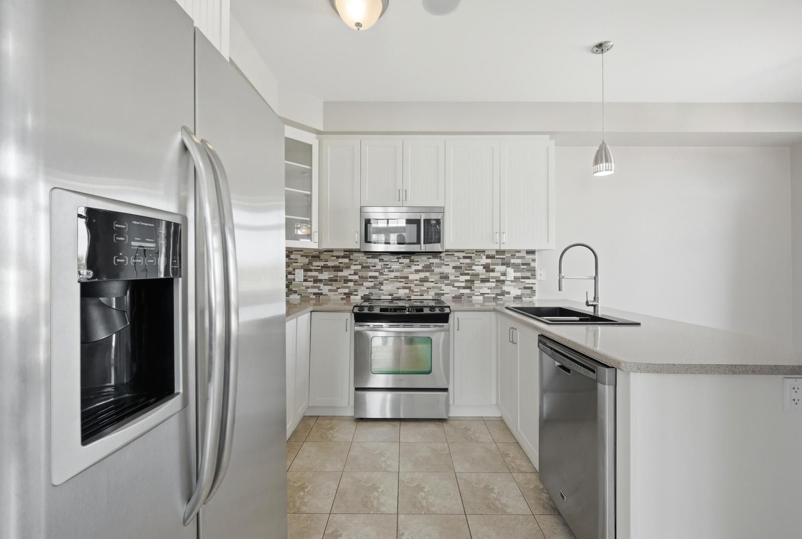 • Modern kitchen with stainless steel appliances and a breakfast area.