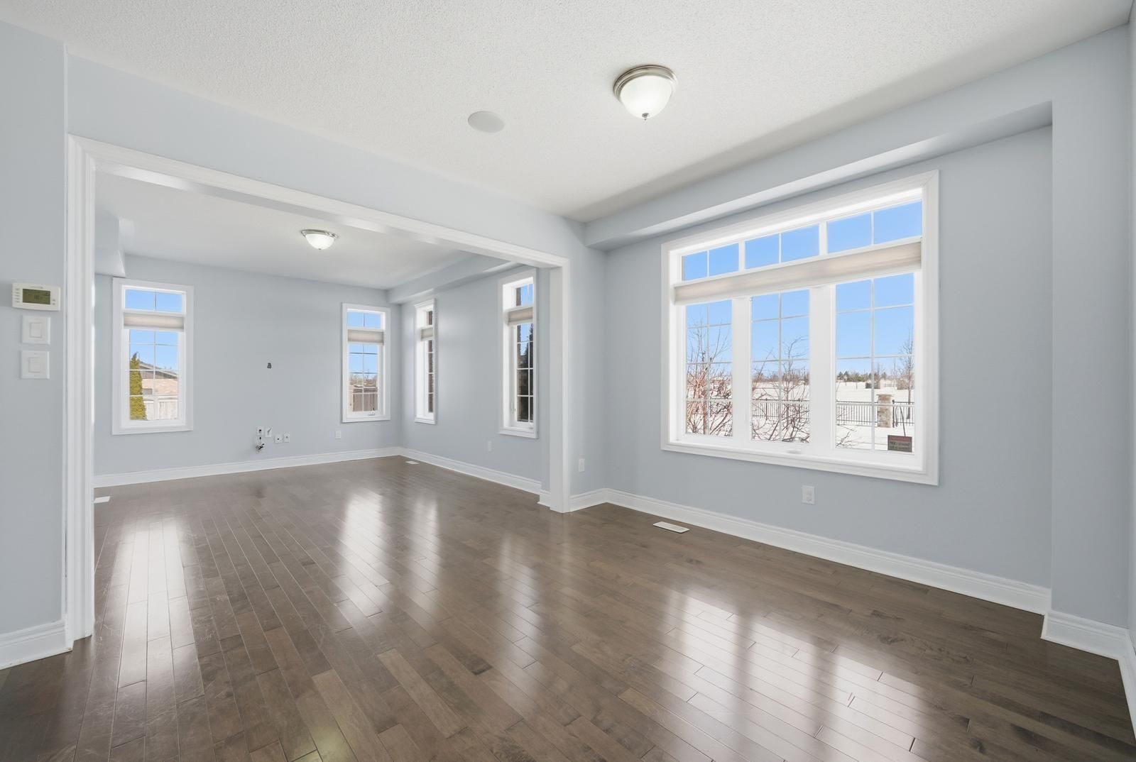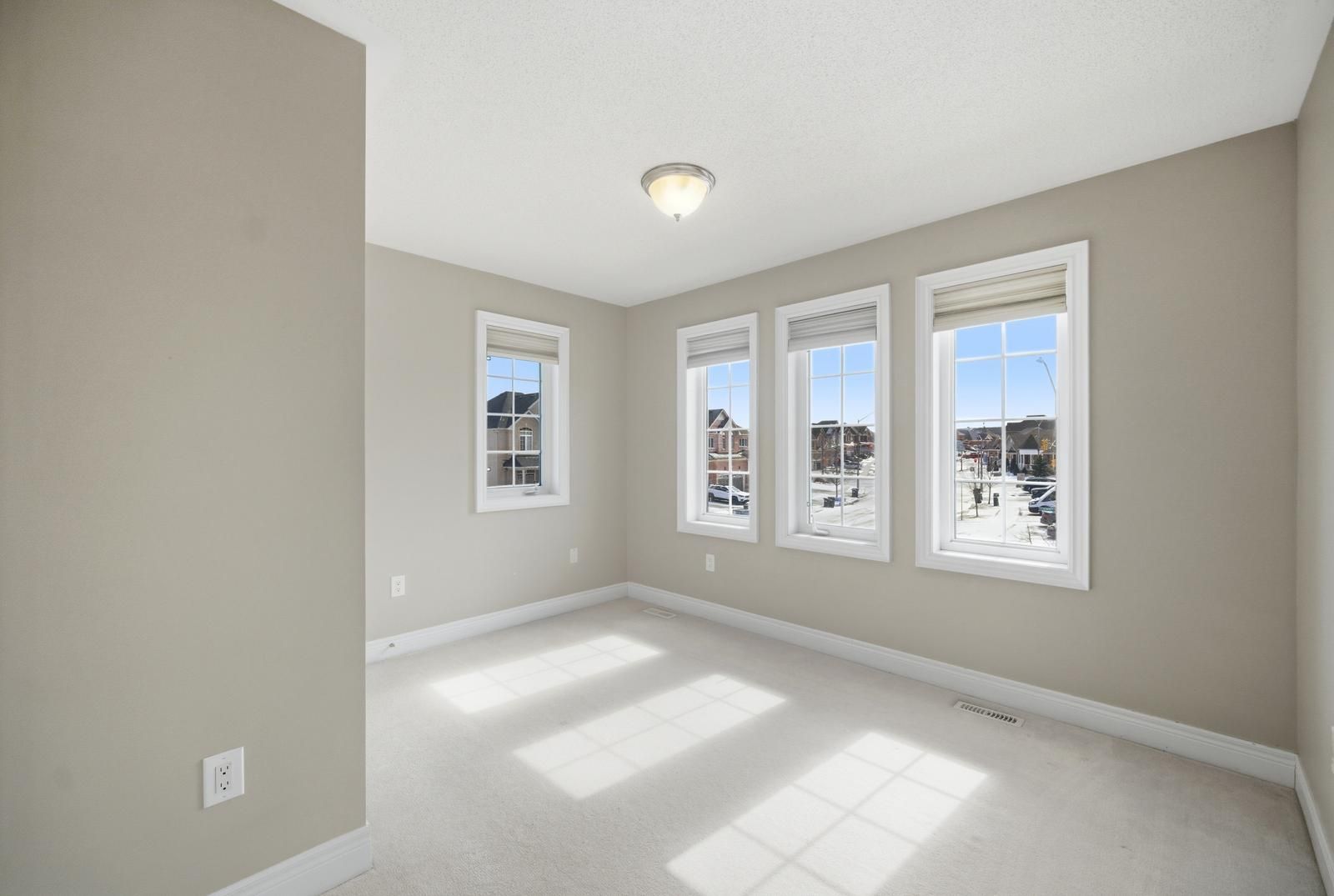 • Spacious living area with large windows and 9 ft ceilings for natural light.