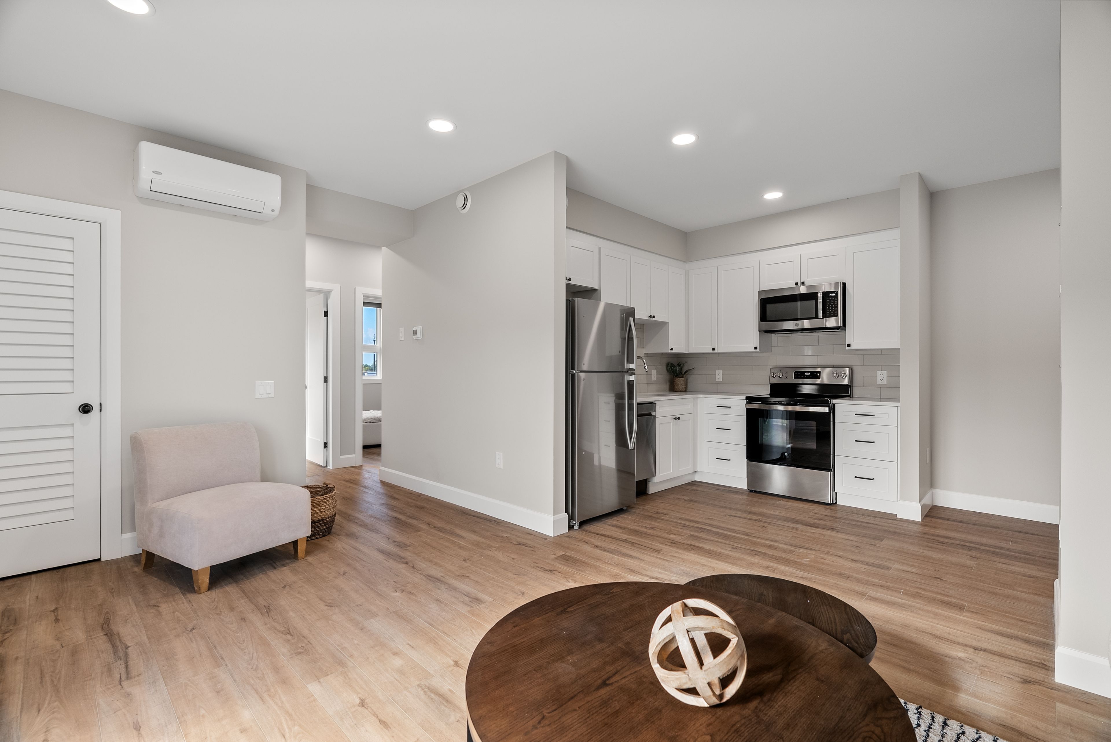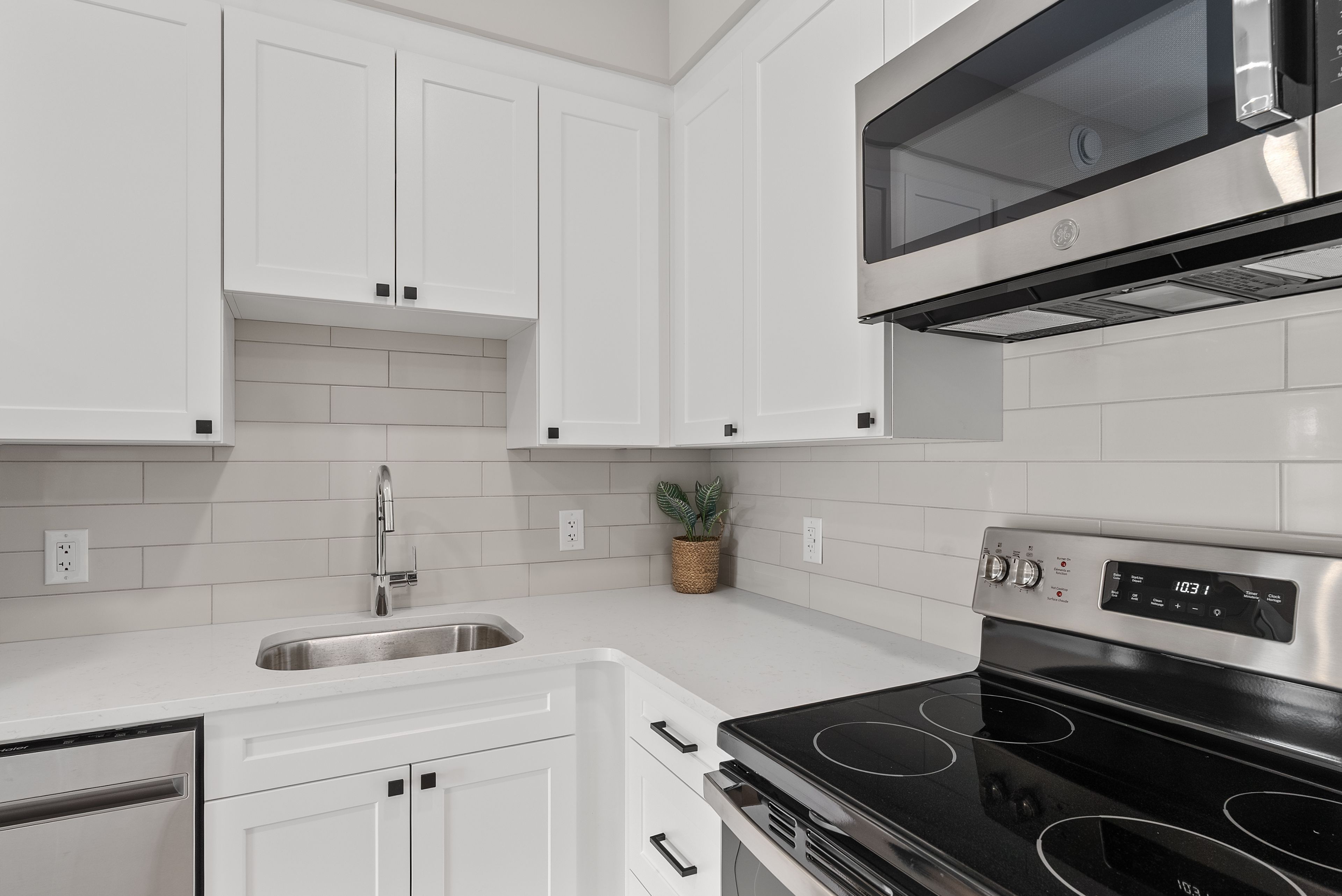 • Elevated finishes include quartz countertops and white shaker-style cabinetry.
