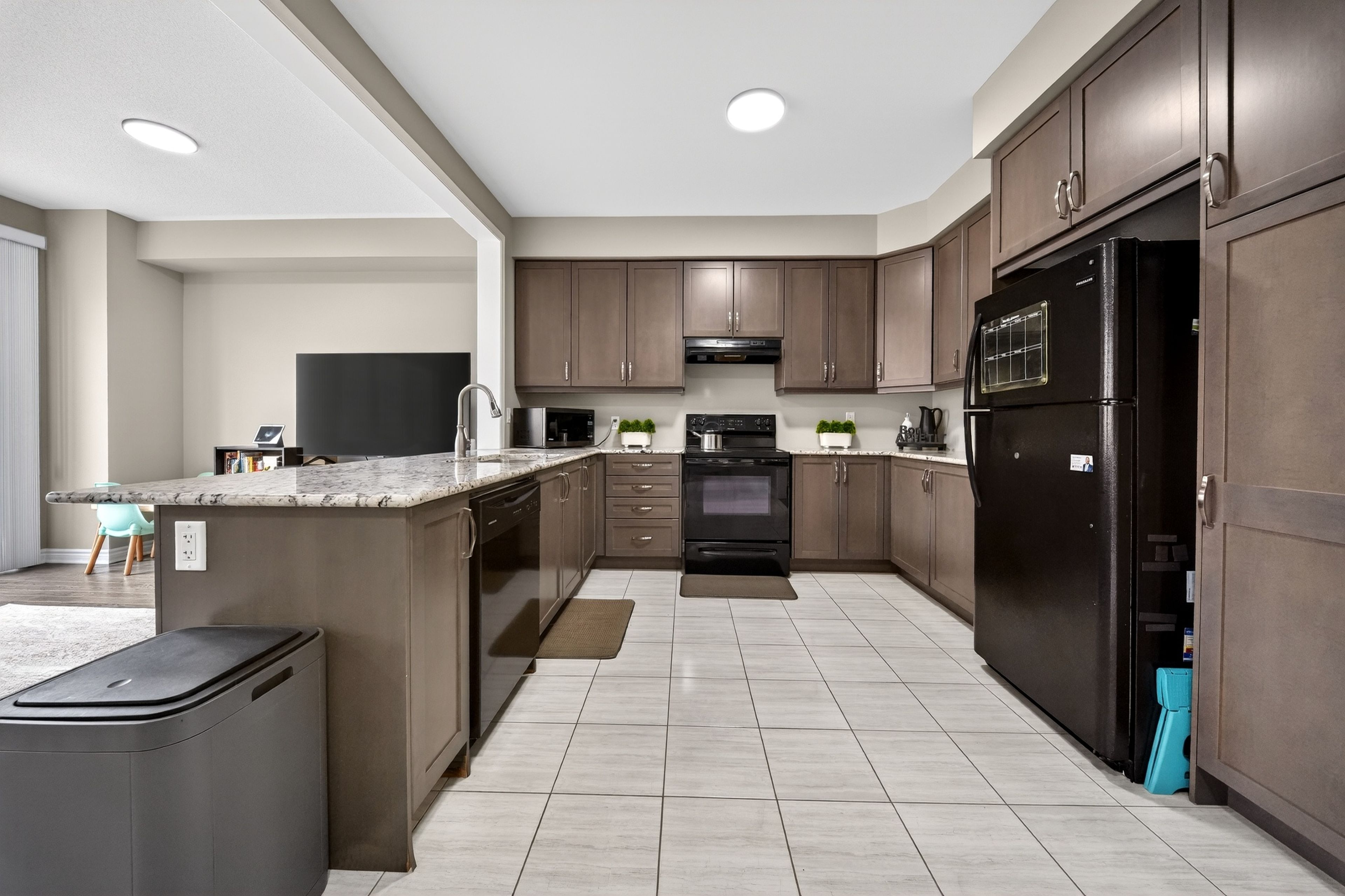 • Modern kitchen featuring granite countertops and wooden cabinetry.