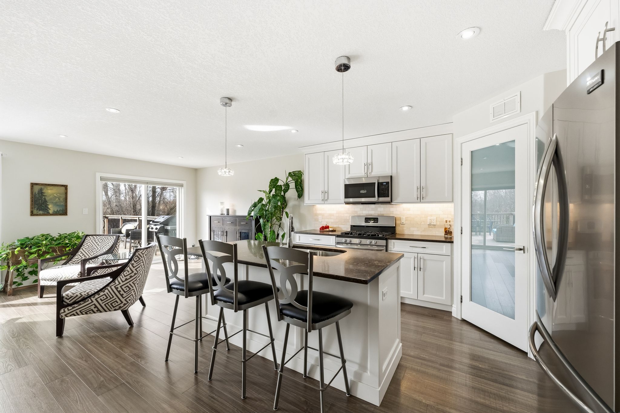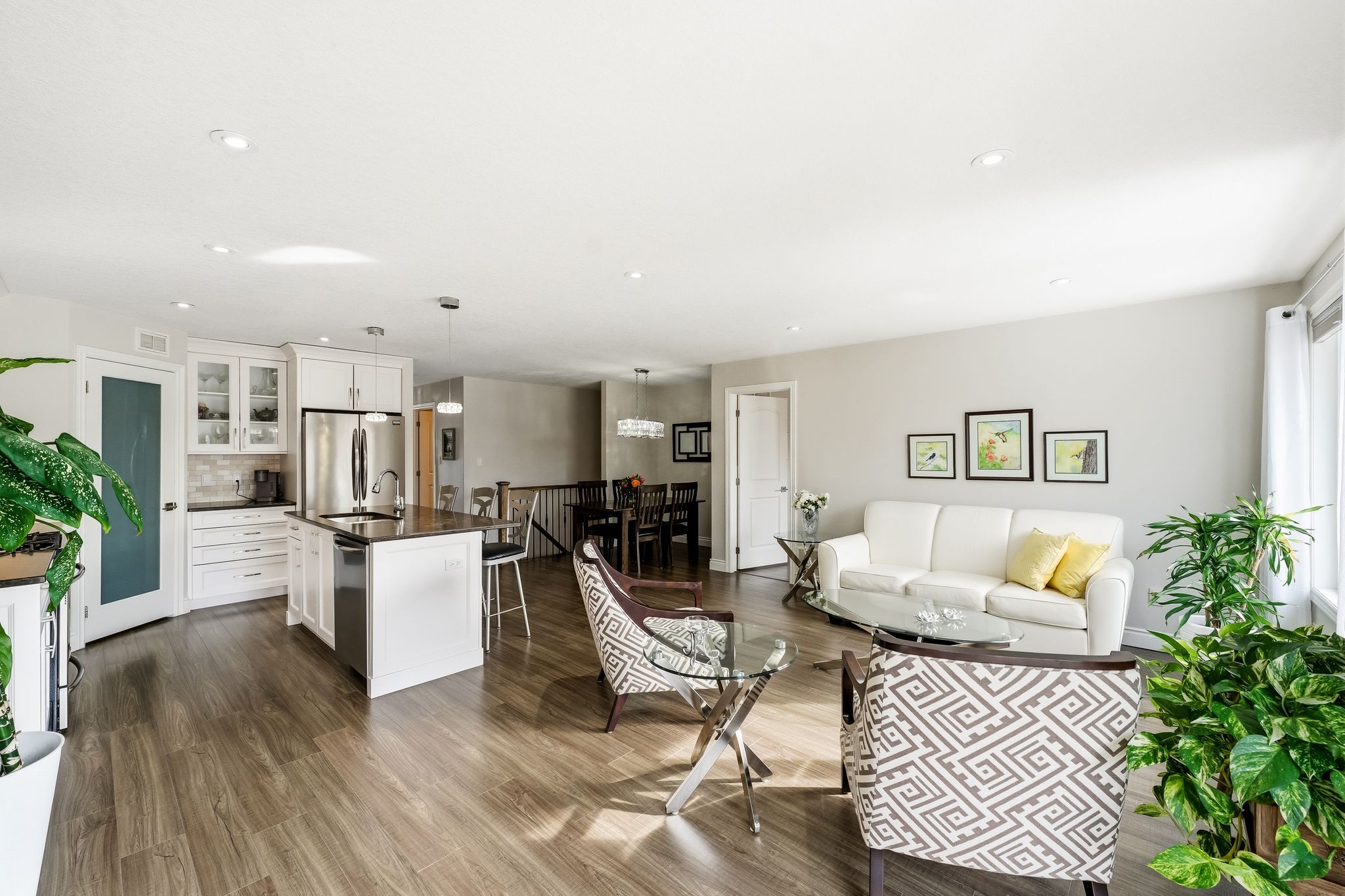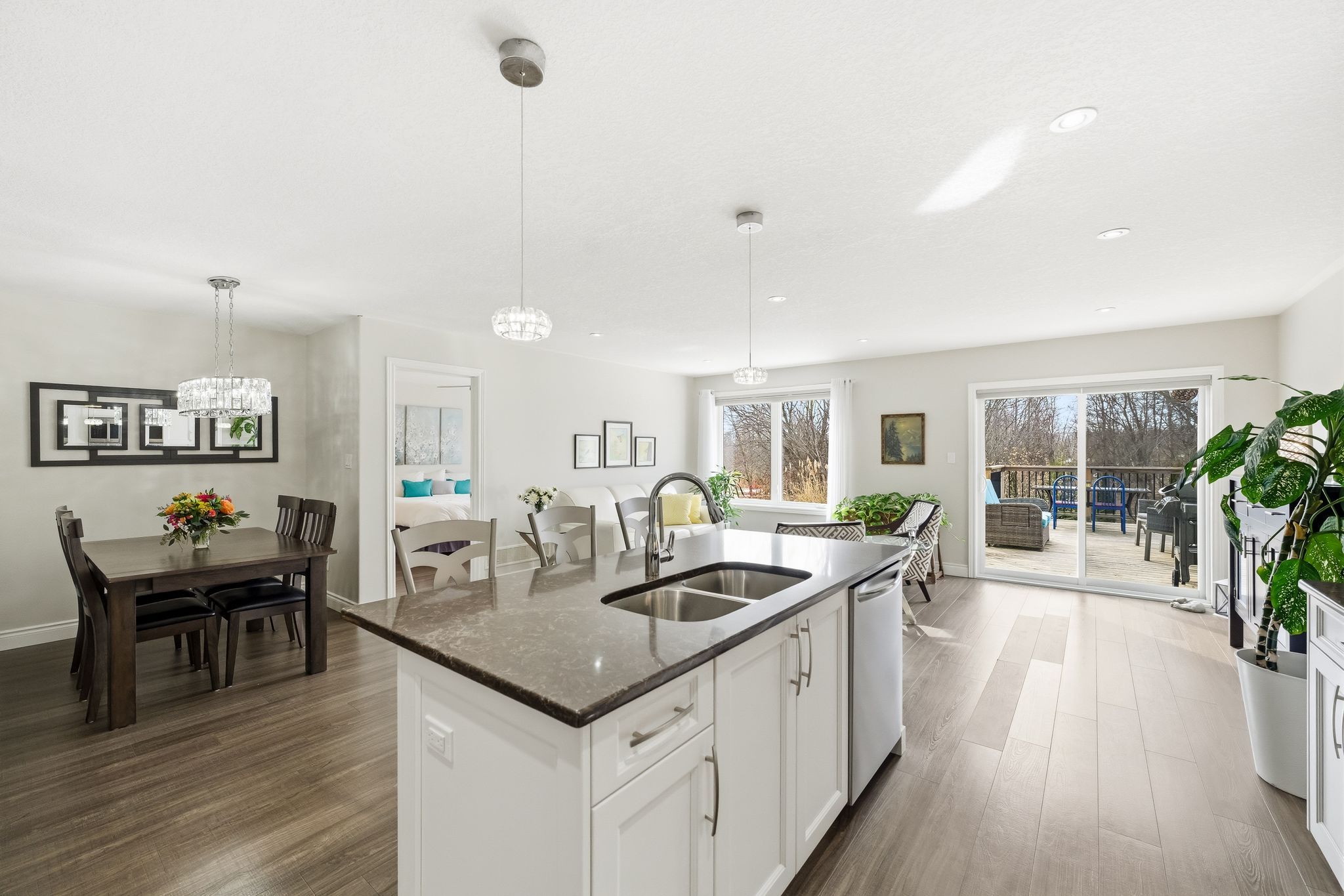 • Open-concept living area with dining space and stylish kitchen featuring quartz countertops.
