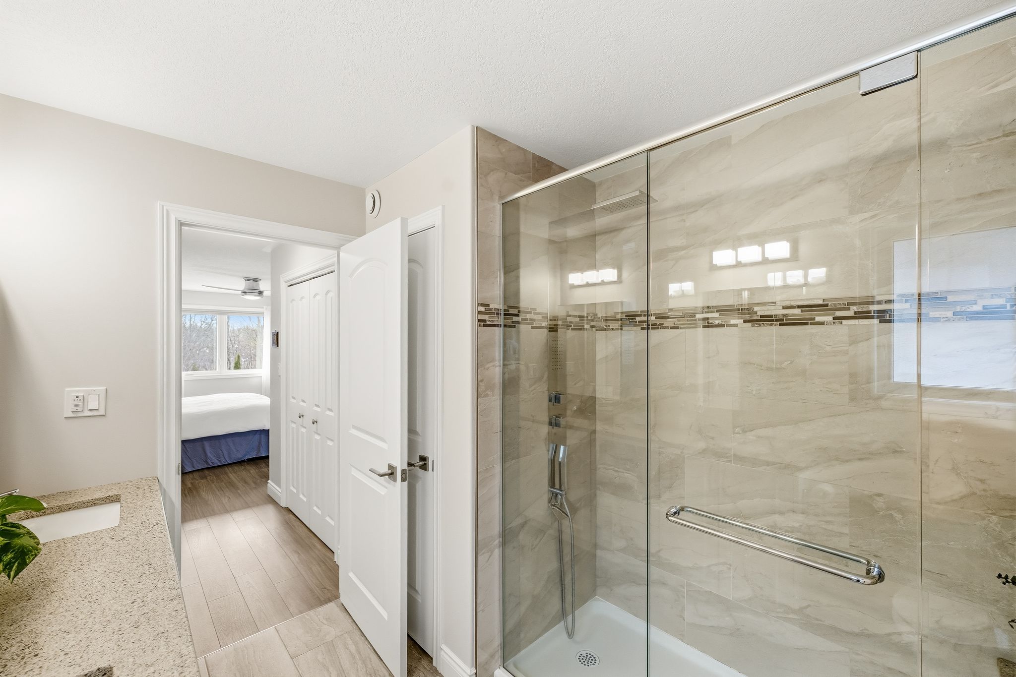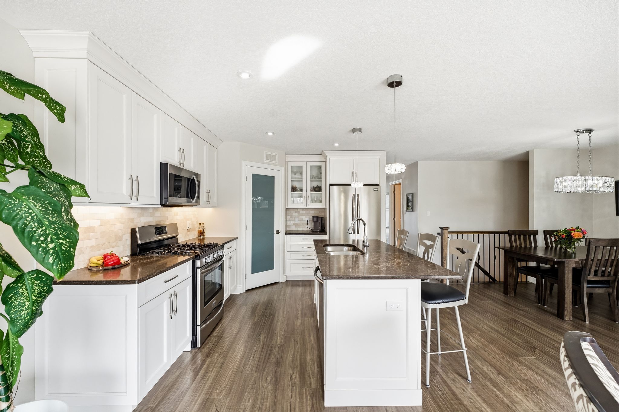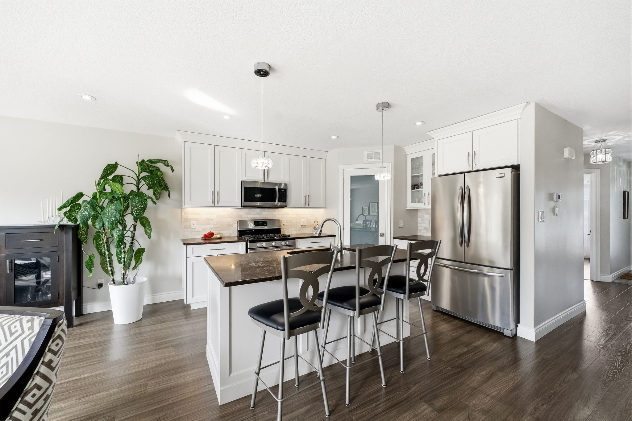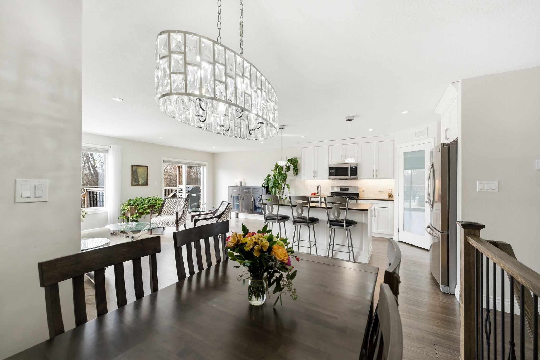 • Open-concept living area with dining space and stylish kitchen featuring quartz countertops.
