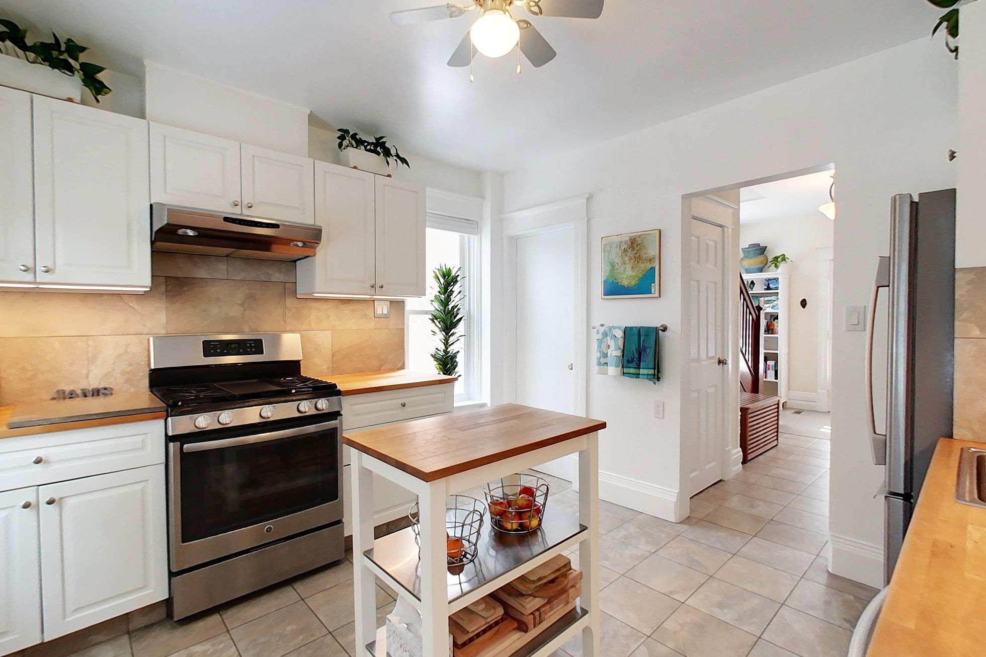 • Beautifully renovated kitchen with white cabinetry and wood counters.