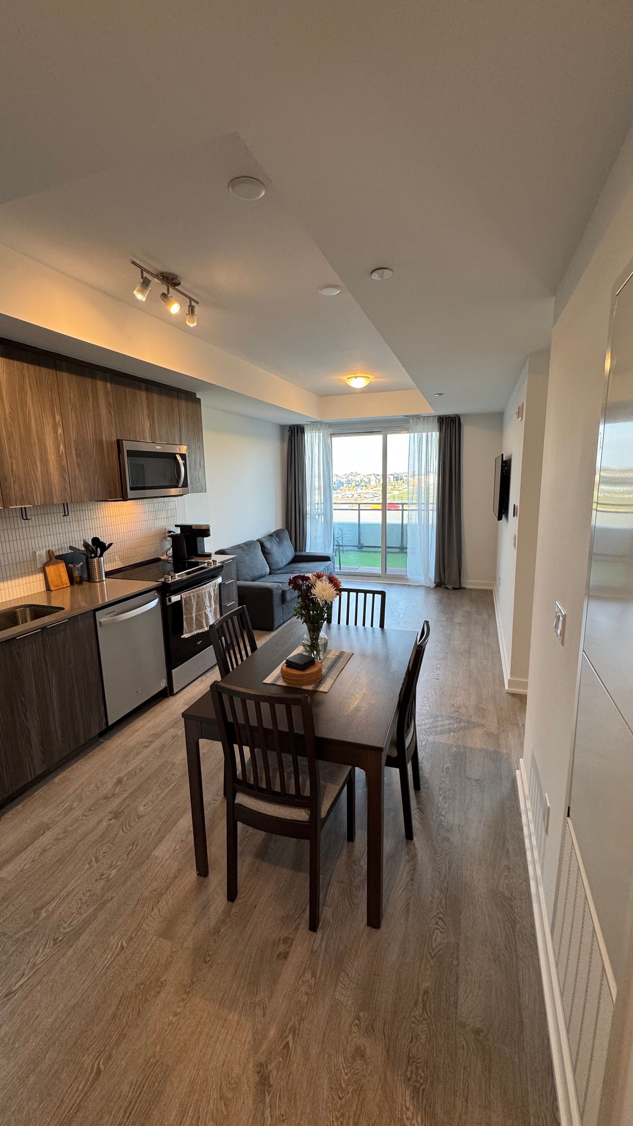 Modern 1 + 1 bedroom condo for lease bright, spacious & convenientwelcome to your new home in this beautiful newly constructed 1+1 bedroom condo offering contemporary living in a prime location. The open-concept layout is thoughtfully designed, featuring abundant natural light and a private balcony perfect for relaxing or enjoying your morning coffee. The modern kitchen boasts sleek finishes and storage space. The den provides the flexibility to use as a home office or study area ideal for today's lifestyle. Additional features include in-suite laundry, air conditioning, and one underground parking space for your convenience. Building amenities may include a fitness centre, lounge, rooftop terrace, and concierge service. Situated close to shopping, dining and major highways, this condo offers both comfort and connectivity perfect for professionals, couples, or small families looking for modern urban living. Don't miss out schedule a viewing today!