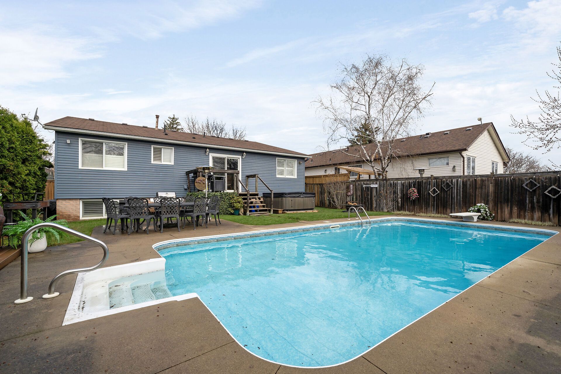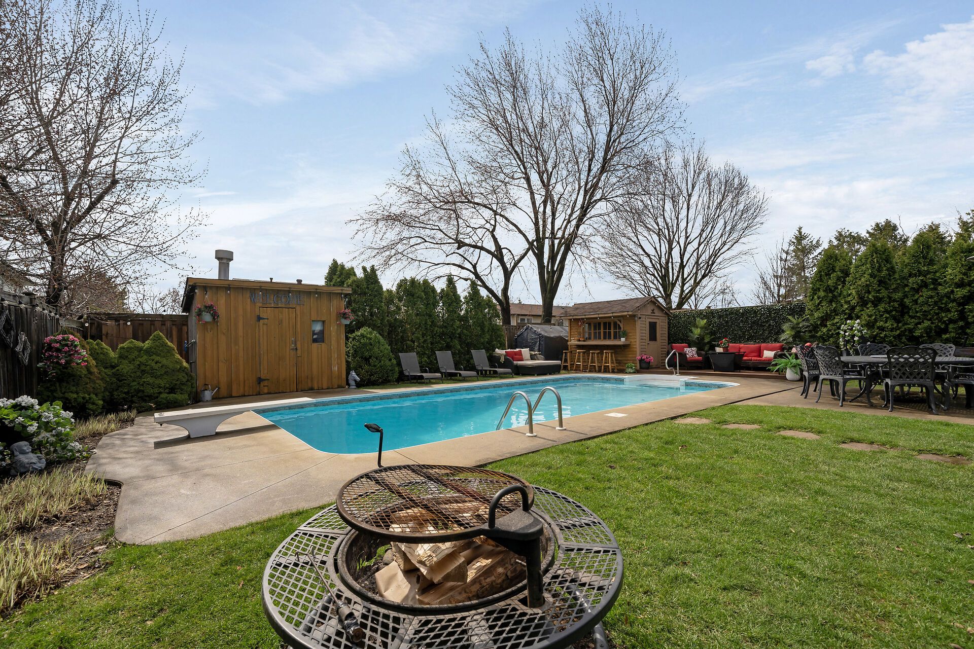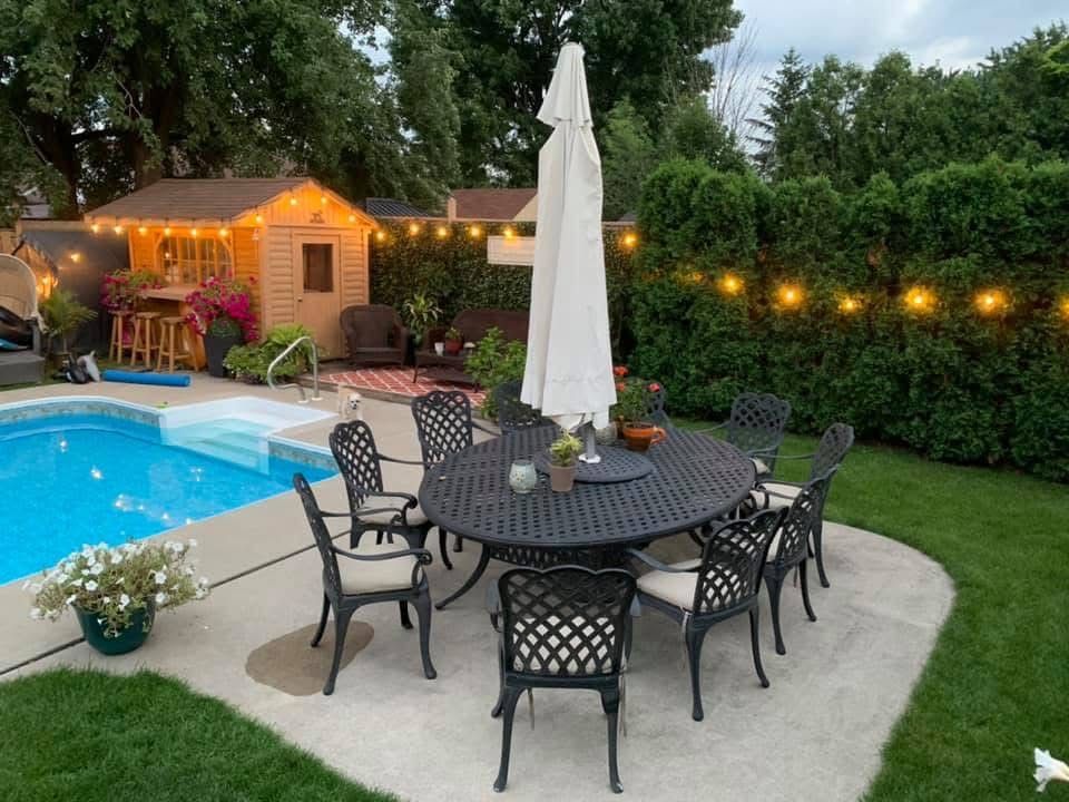 • Large backyard featuring an inground pool, cabana, and lounge area for entertaining.