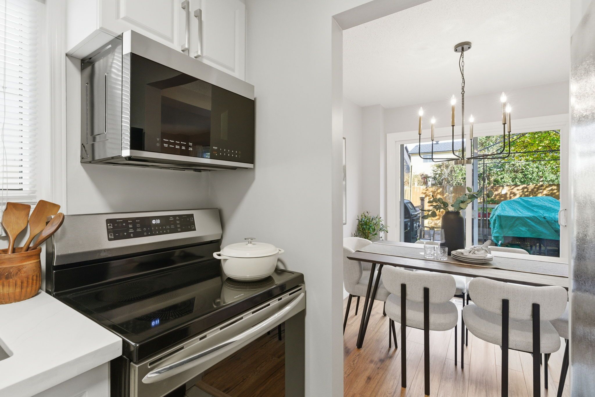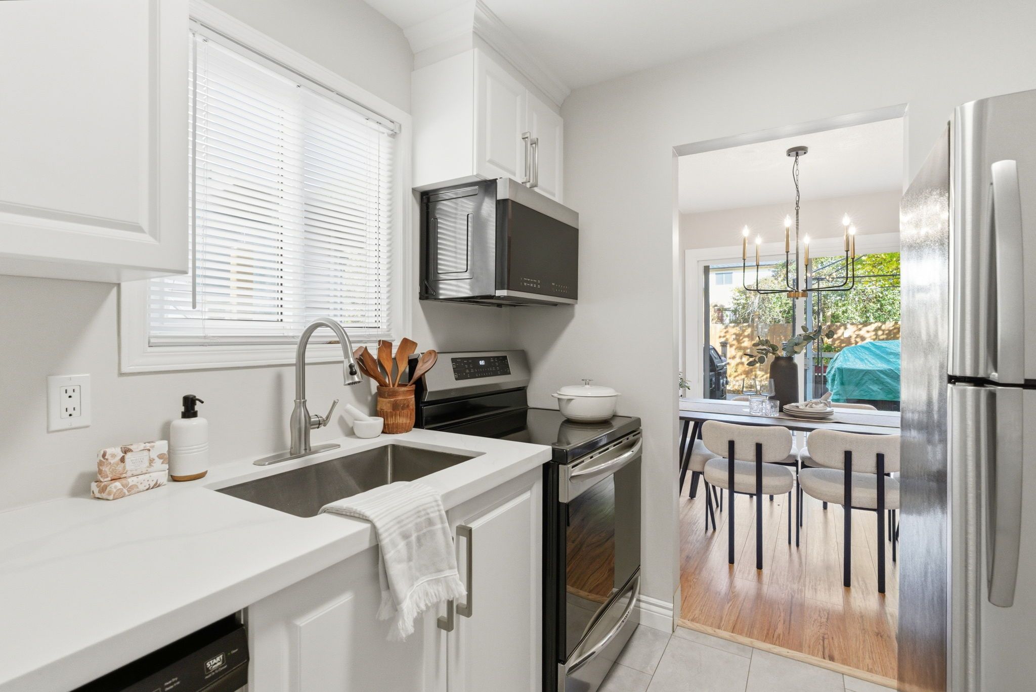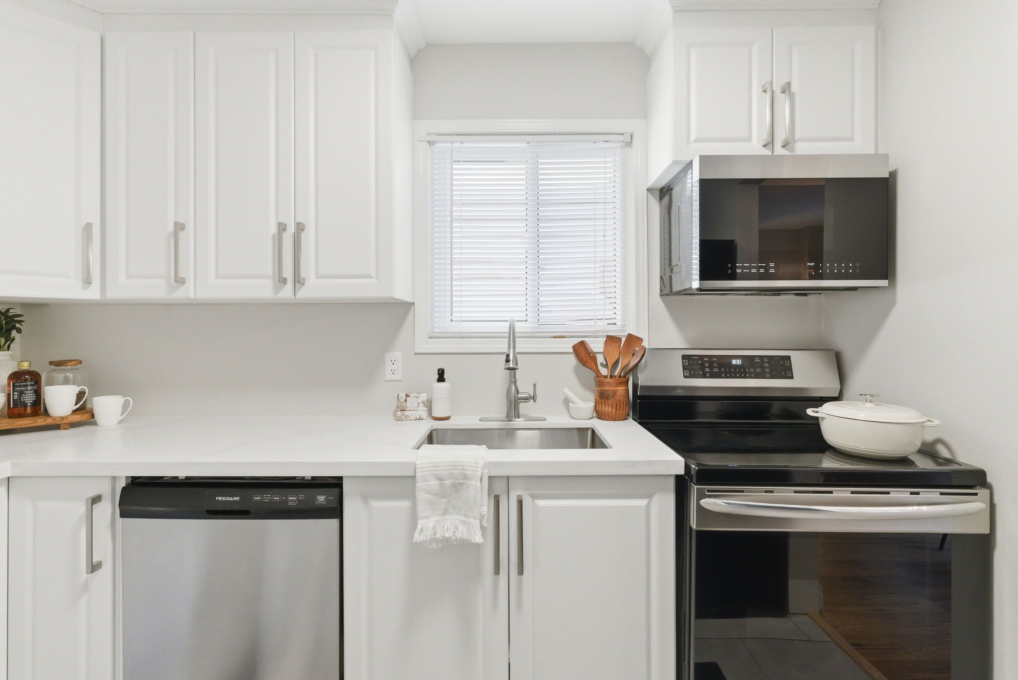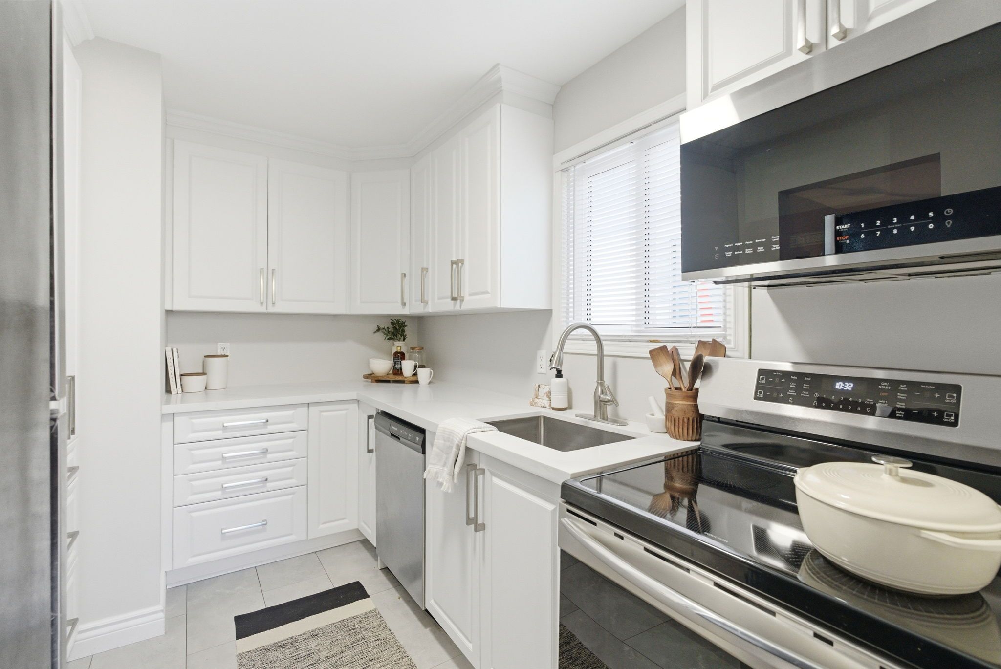 • Updated kitchen with custom cabinetry, quartz countertops, and stainless steel appliances.