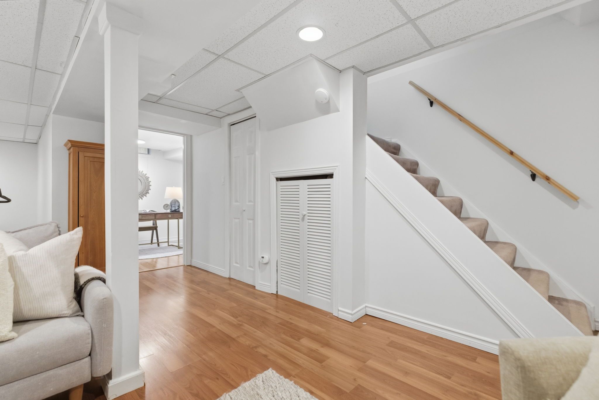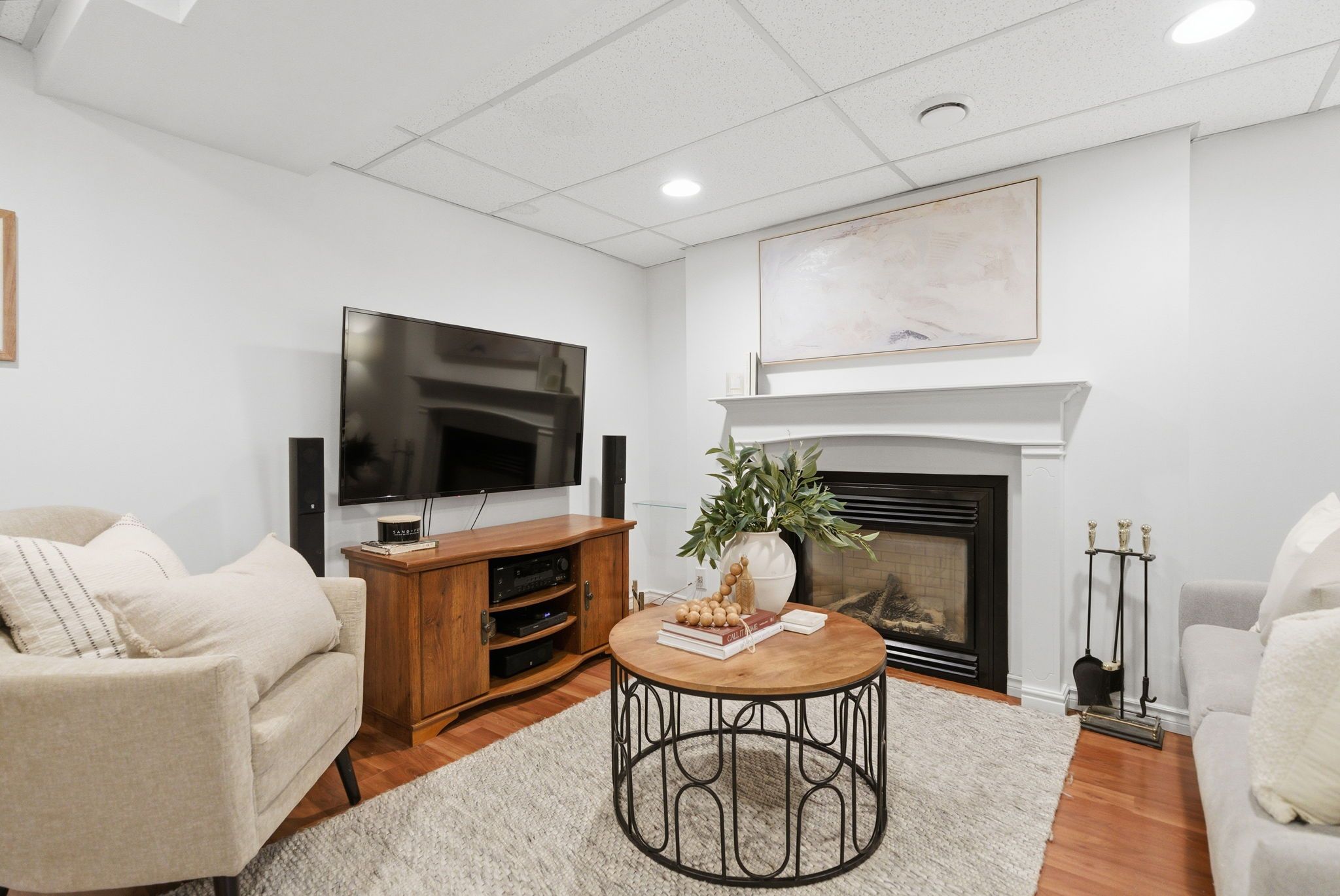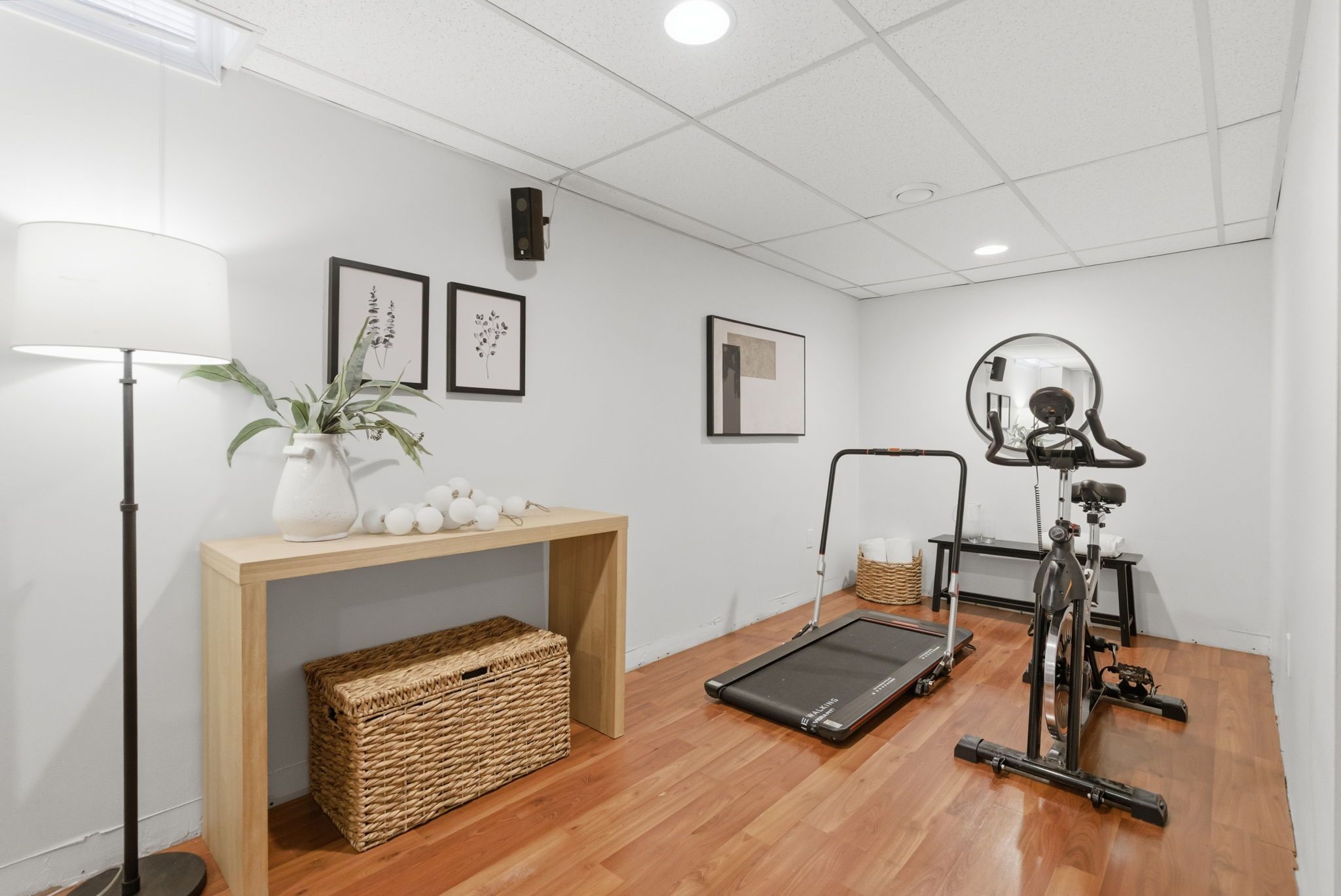 • Finished basement with cozy rec room, home office, and gym nook.