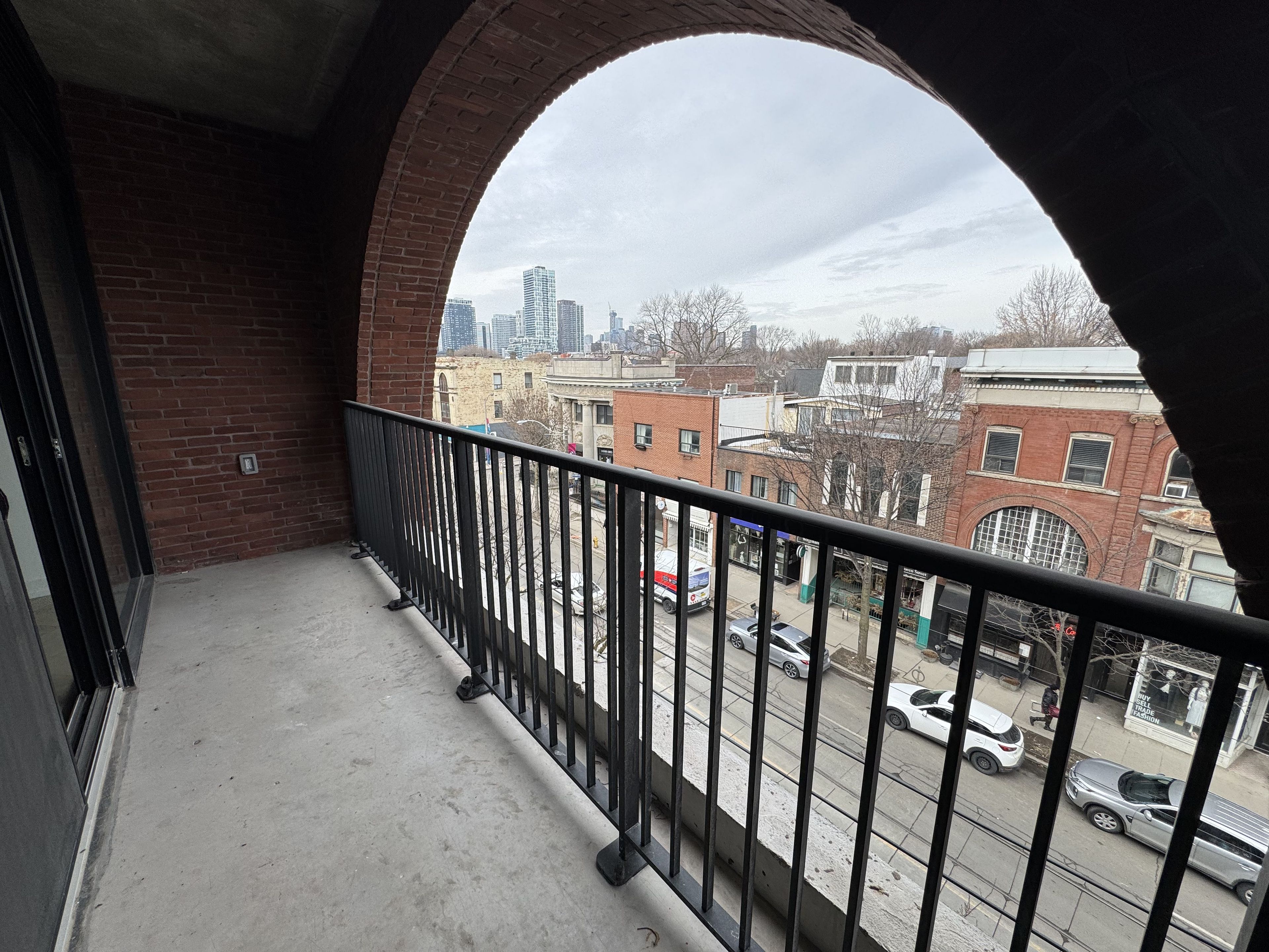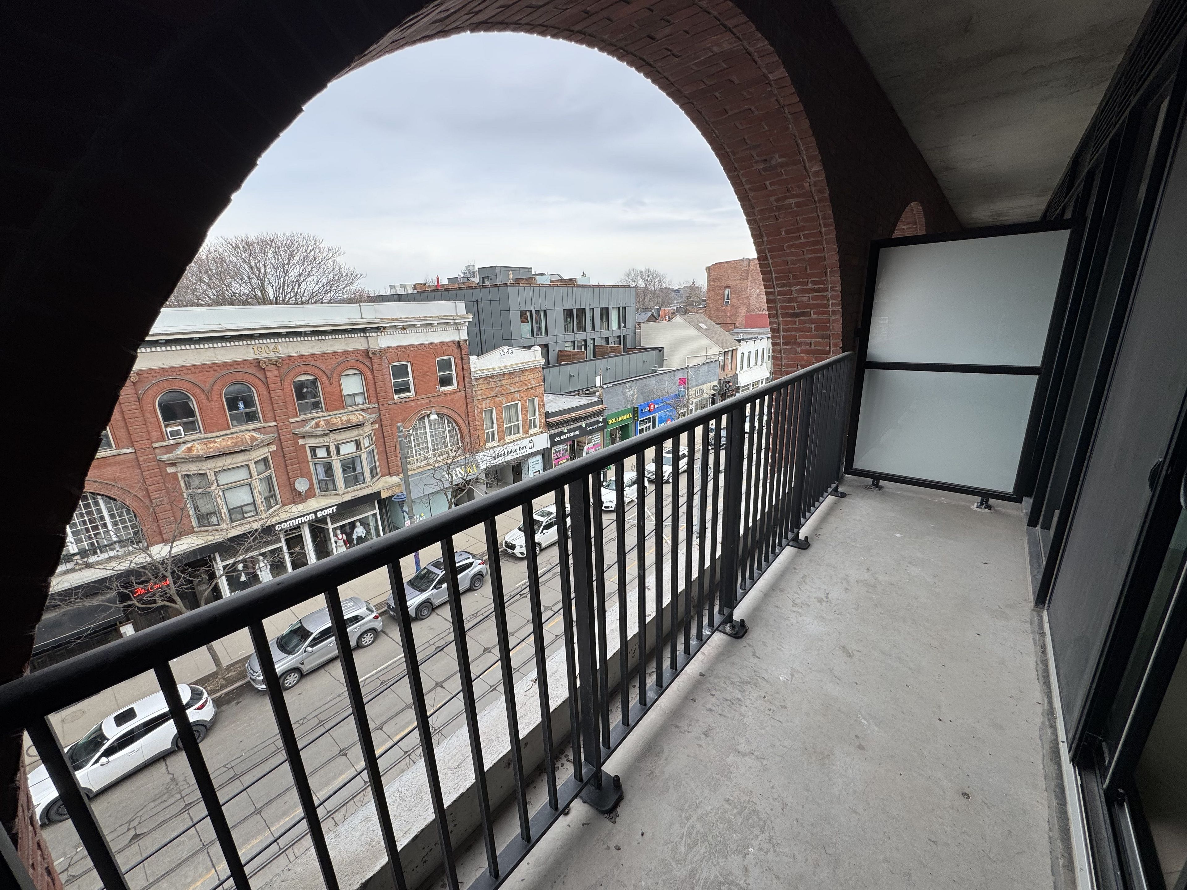 • Balcony offers views framed by a stunning brick archway over Queen Street East.