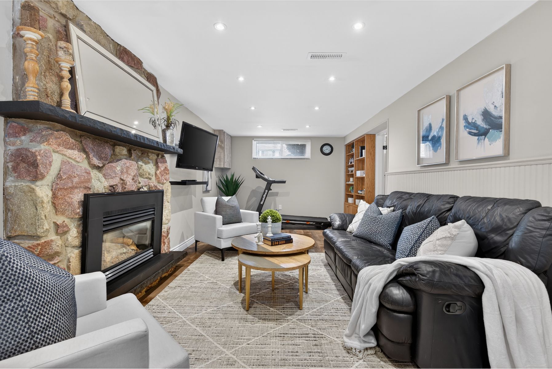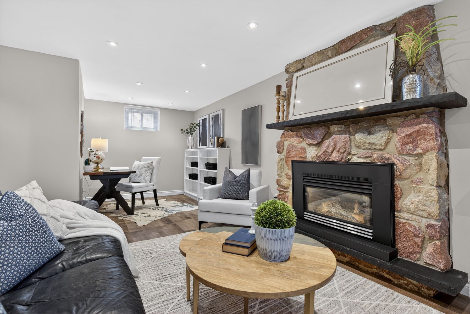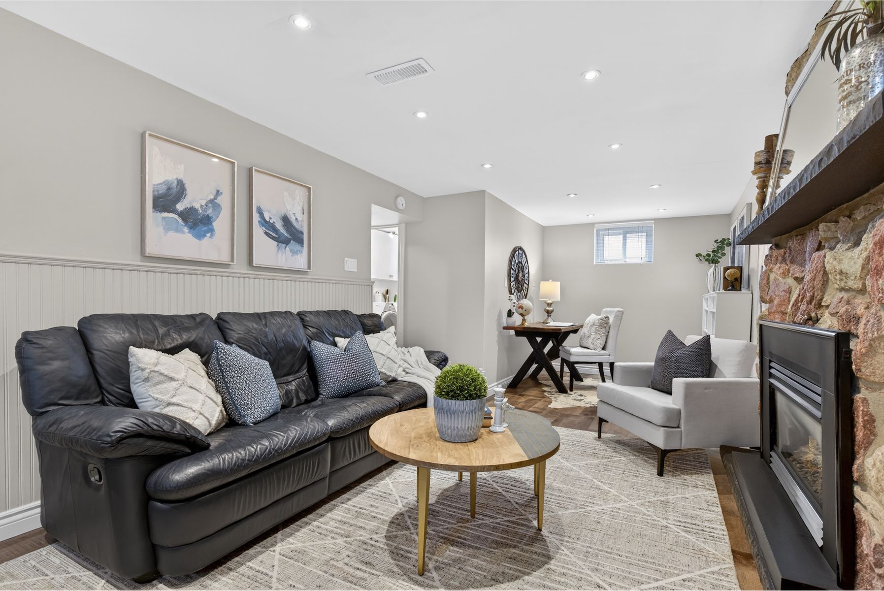 • Cozy lower-level family room with gas fireplace for relaxing evenings.