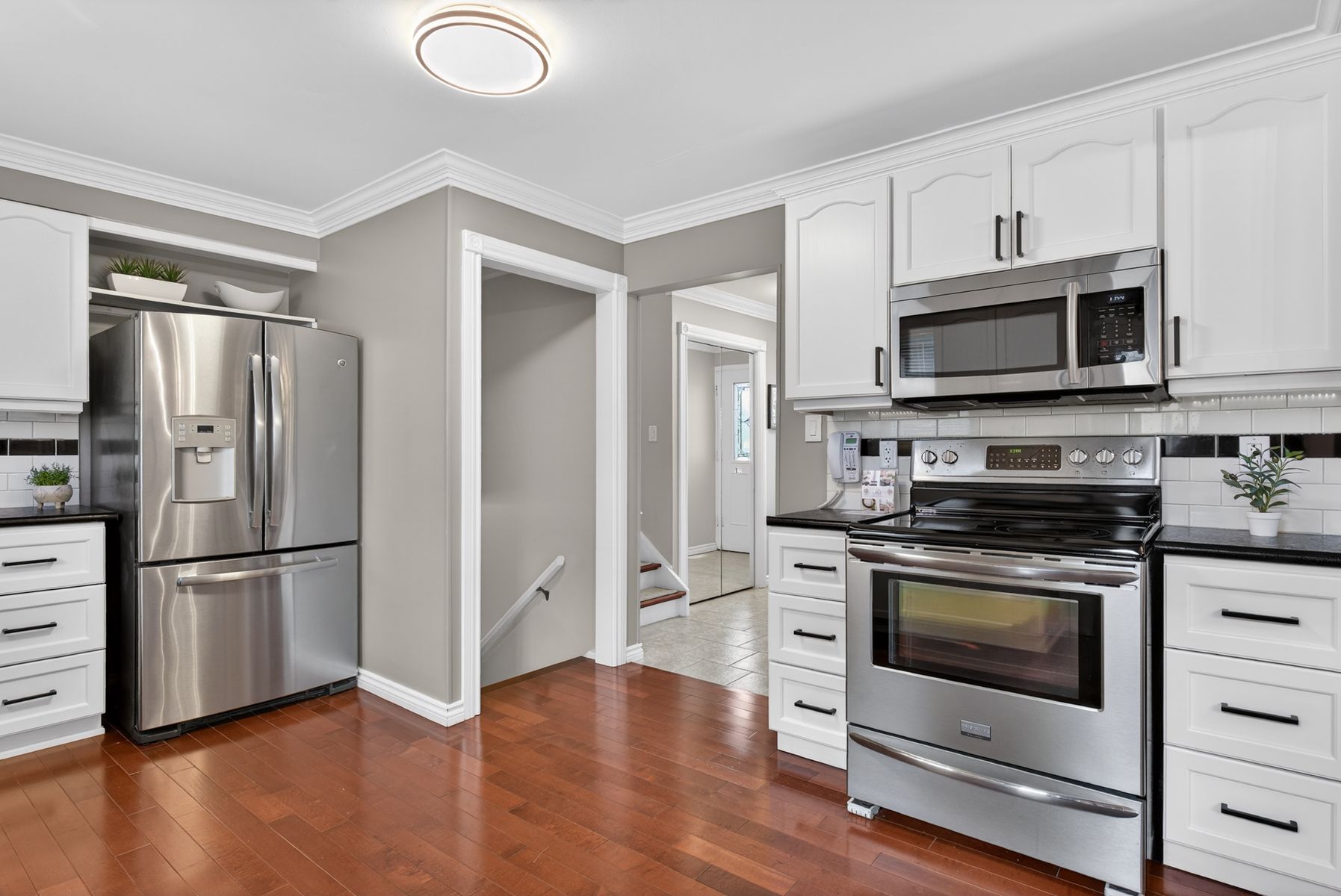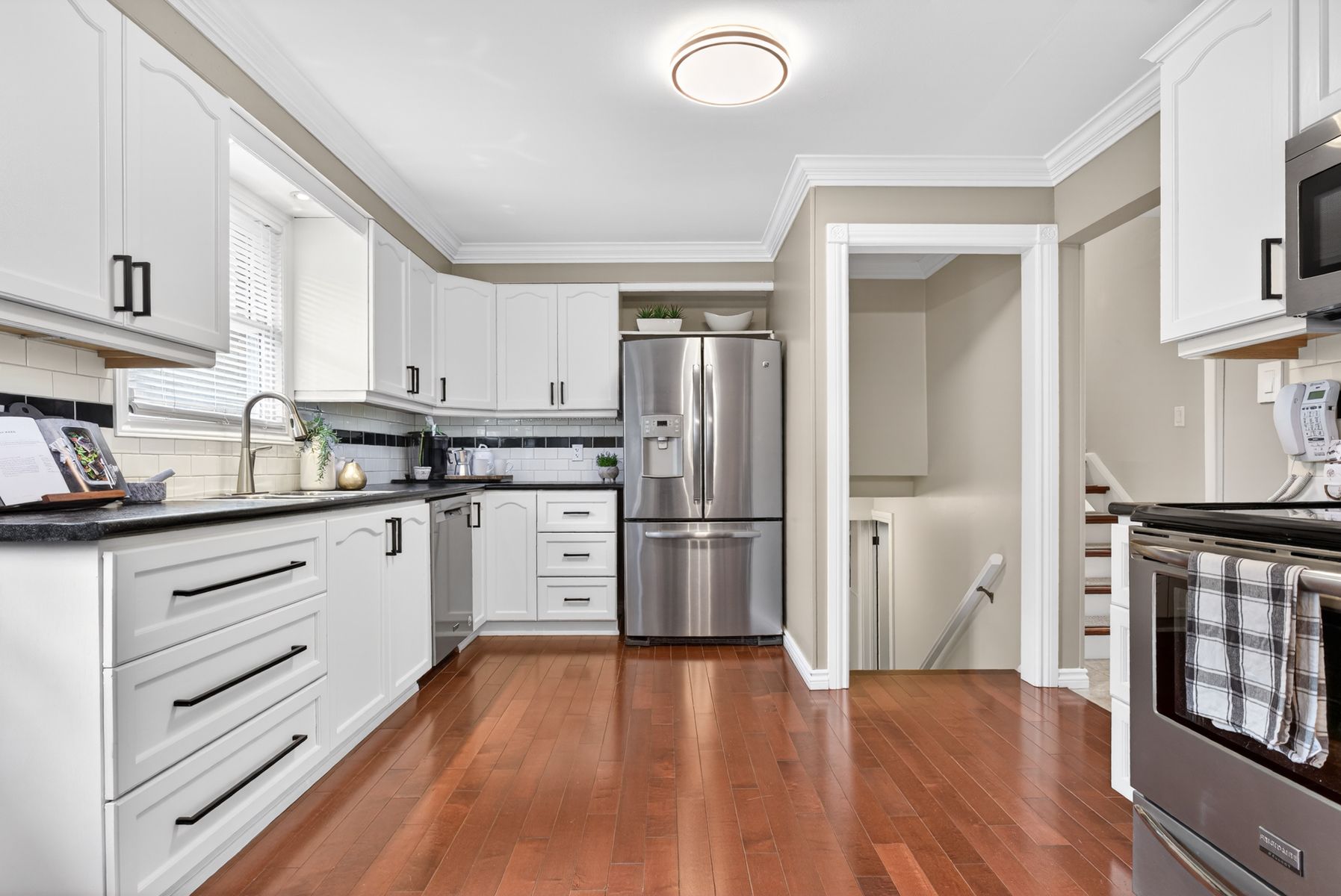• Updated kitchen with stainless steel appliances and ample counter space.