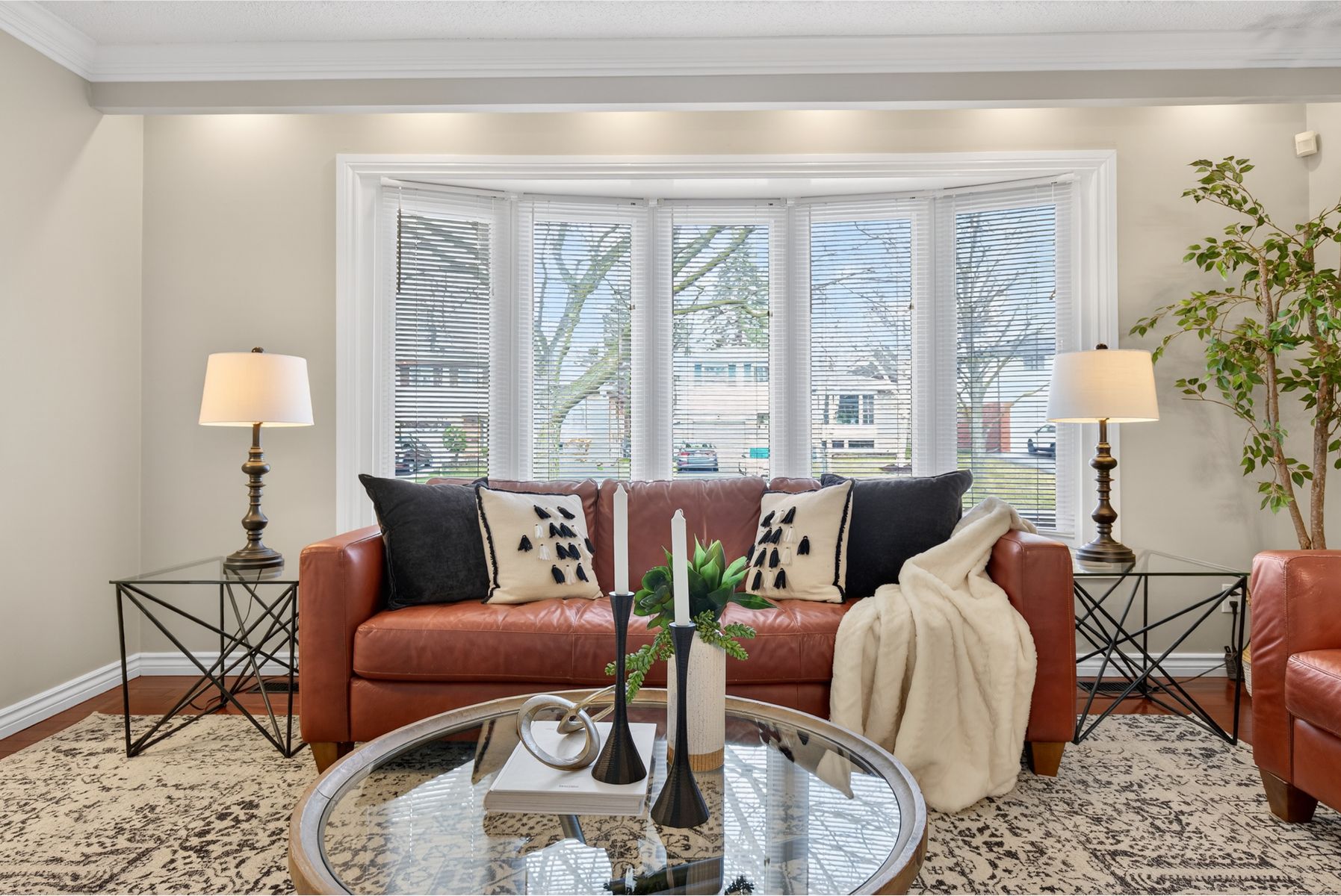 • Bright living room with large bay window and hardwood floors.