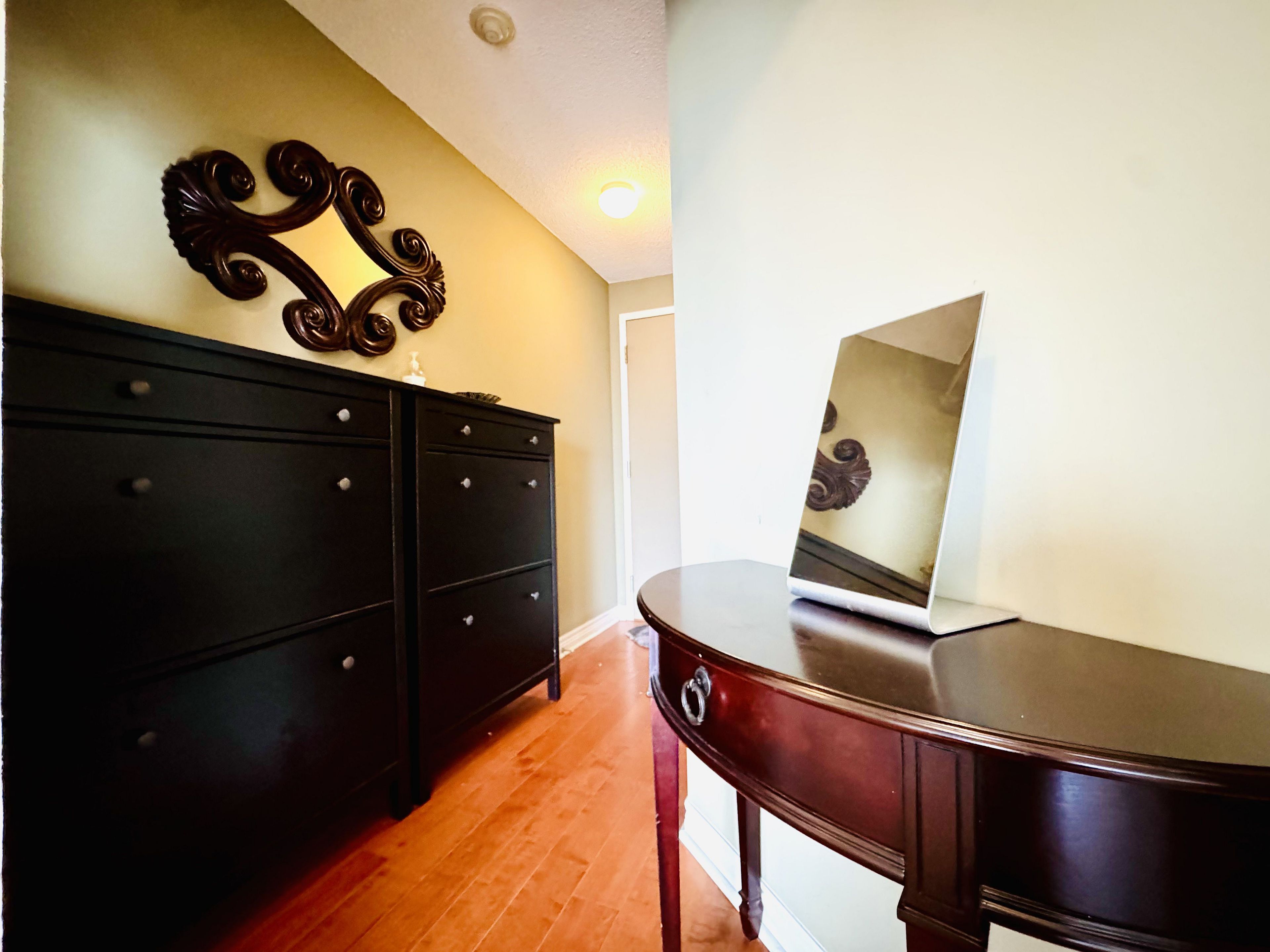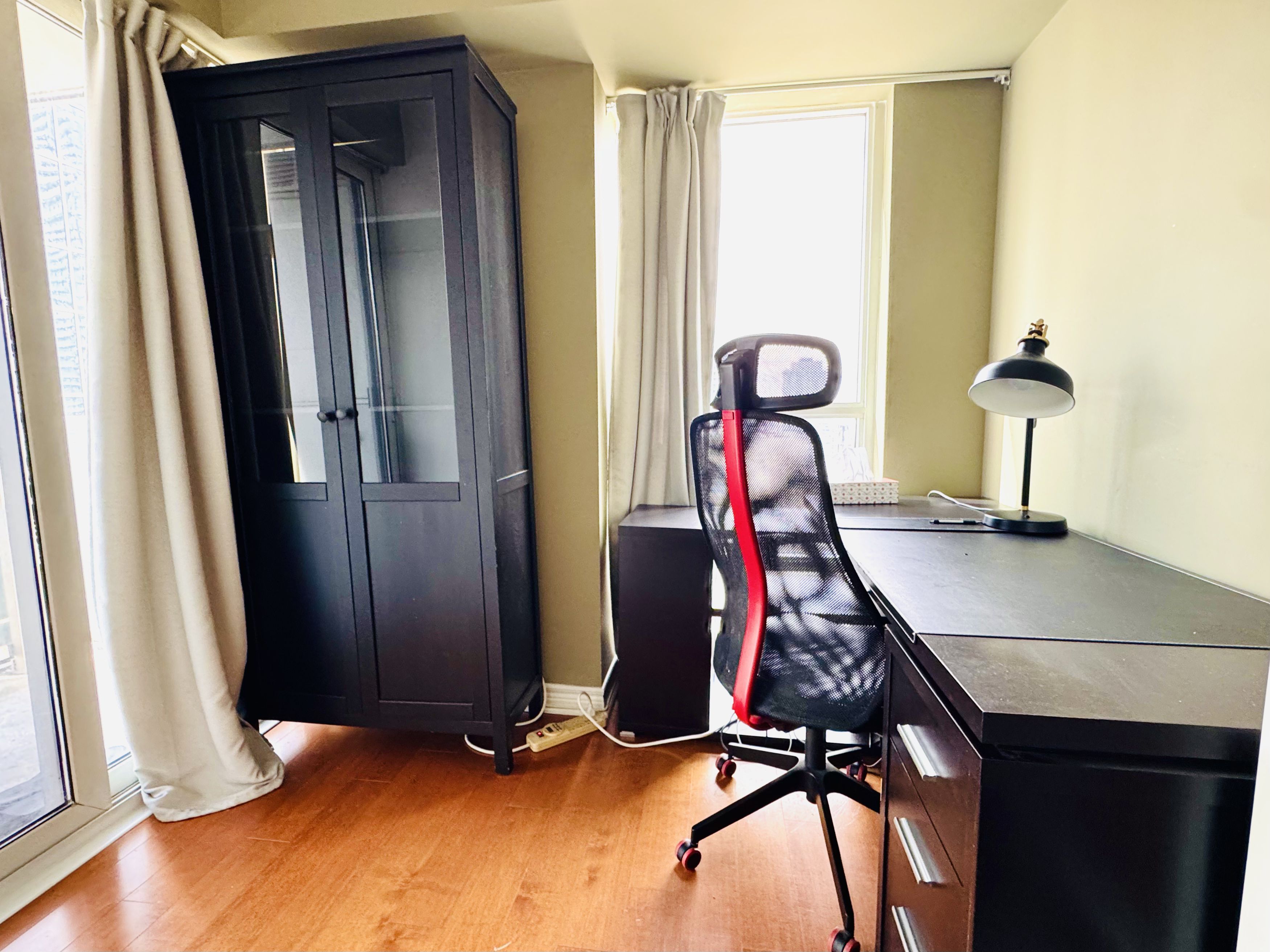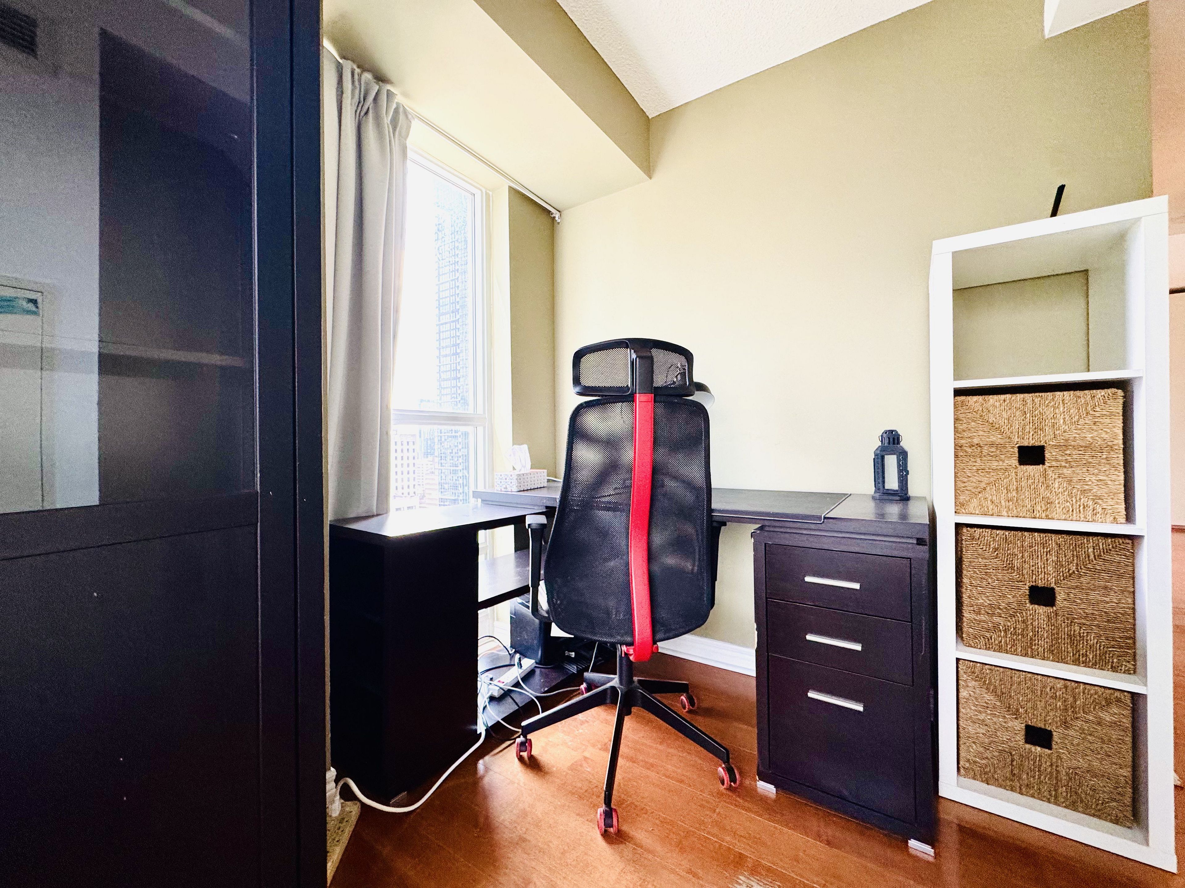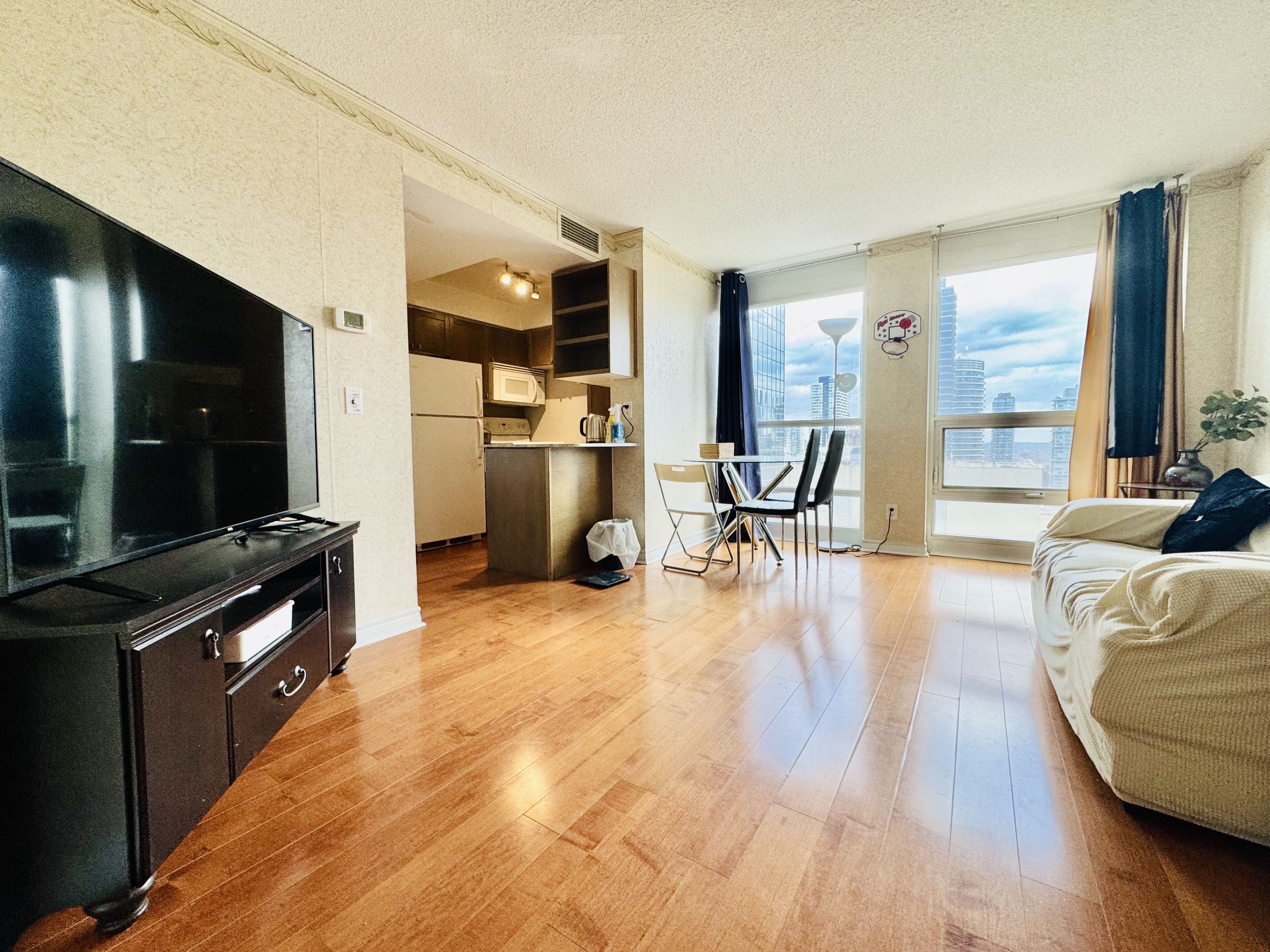 Luxury, sunny & bright 1+den suite at prestigious residences at college park! This high-floor unit features stunning lake & city views, abundant natural light, and a functional layout. Upgraded with quality hardwood flooring, granite countertops, modern kitchen cabinetry, stylish wallpaper finishes, and convenient ensuite laundry. Furniture are included. Located in the heart of the bay street corridor, enjoy direct underground access to college subway station and college park shops. Steps to u of t, tmu (ryerson), major hospitals, financial district, eaton centre, 24-hour grocery, restaurants, and everyday essentials. Residents enjoy premium amenities including 24-hour concierge & security, indoor pool, sauna, steam room, fully equipped gym, virtual golf, theatre, party room, and outdoor patio. Professionals and students are welcome.