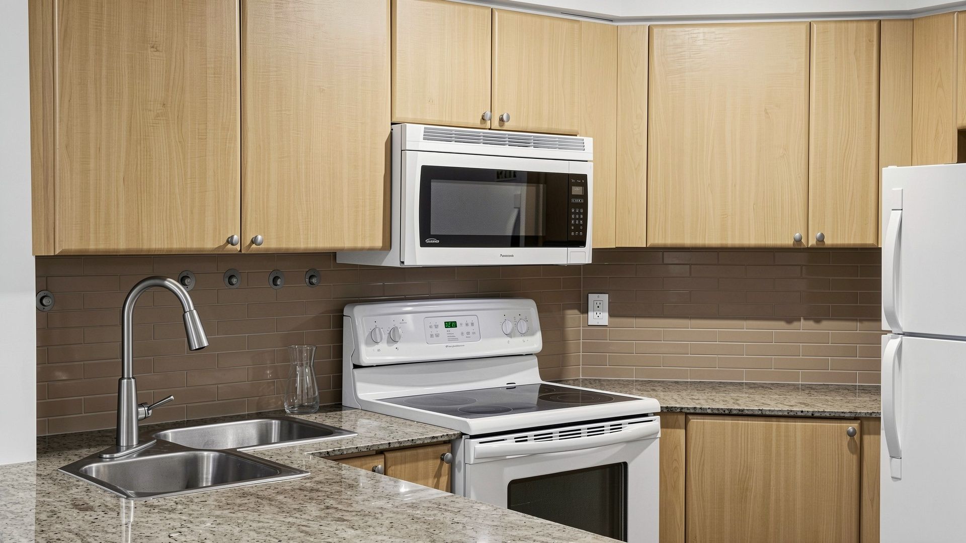 • Modern kitchen with granite countertops and breakfast bar for casual dining.