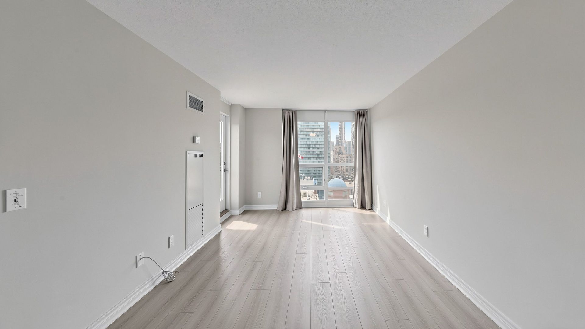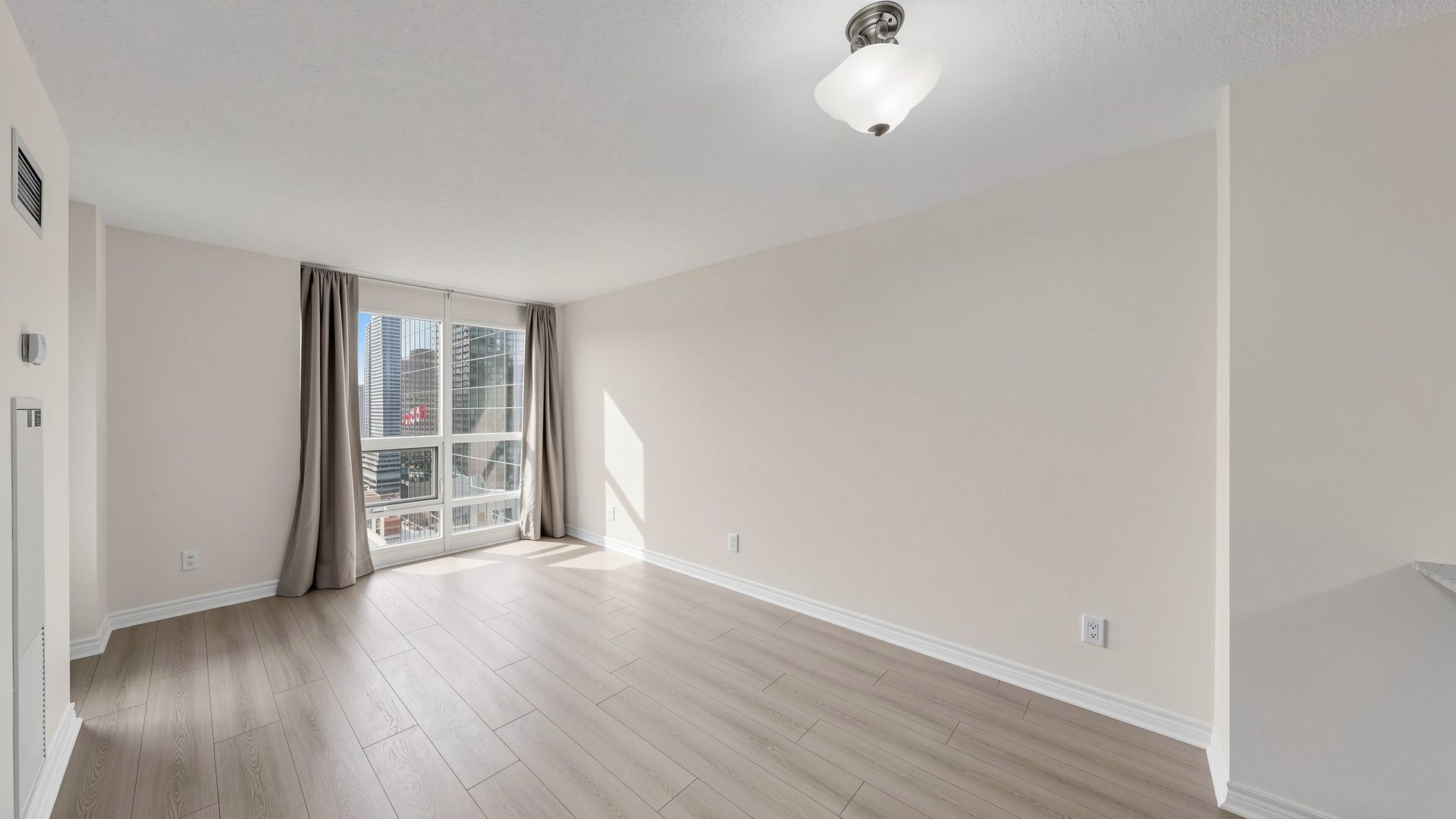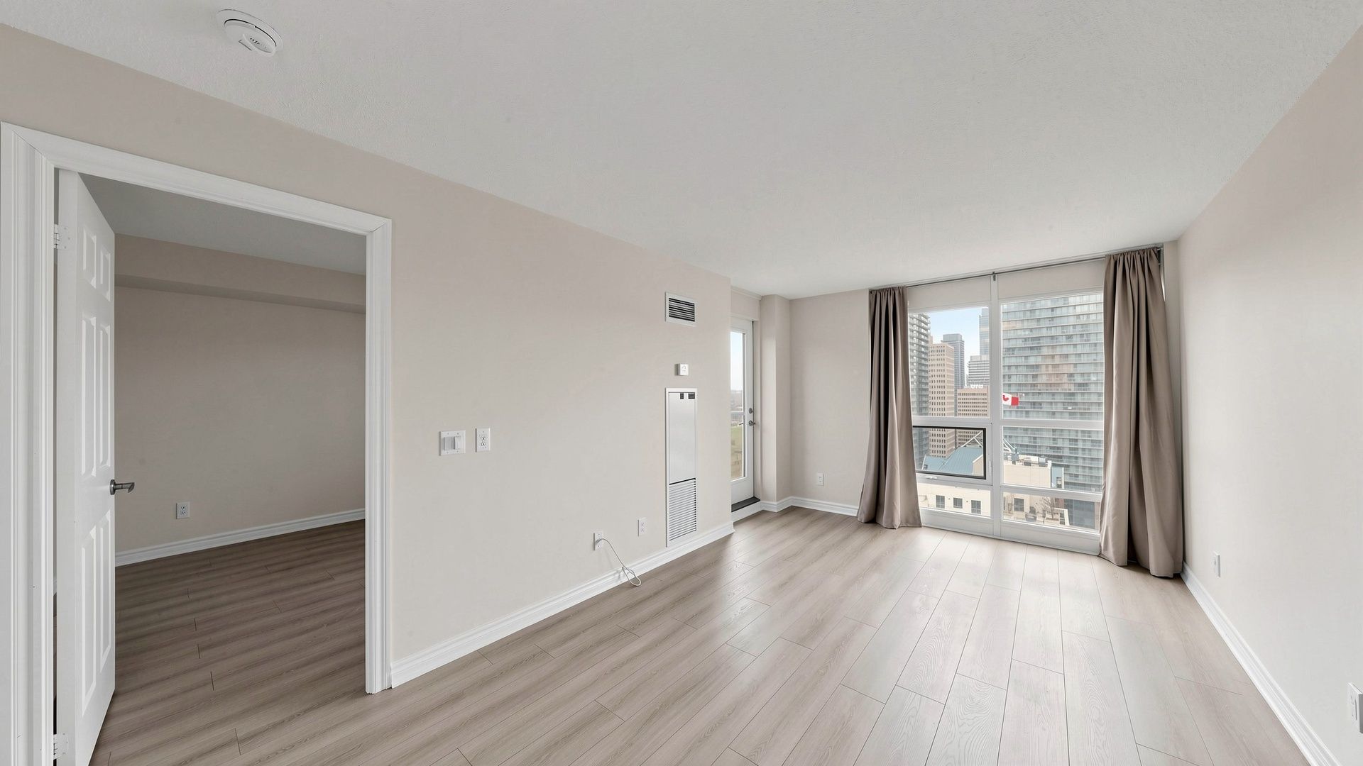 Vacant, renovated and ready for immediate occupancy. Welcome to college park condos, ideally situated in the core of downtown toronto. This thoughtfully laid-out one-bedroom, one-bathroom suite offers a bright and airy feel, enhanced by large windows and an abundance of natural light. The open-concept living and dining space is both practical and inviting, with a seamless walkout to a private balcony showcasing clear north-facing city views. The kitchen is designed for both everyday use and entertaining, featuring granite countertops, a breakfast bar, and generous cabinet space. Brand new premium laminate flooring runs throughout the unit, adding a modern touch. Parking is included for added convenience. Located in a highly sought-after area with a walk score of 99, residents enjoy direct underground access to the subway along with immediate proximity to shops, restaurants, parks, and essential amenities. Just minutes from toronto metropolitan university, university of toronto, 'major hospitals, the cf toronto eaton centre, and the financial district. Maintenance fees are all-inclusive, offering exceptional value in a prime urban location.