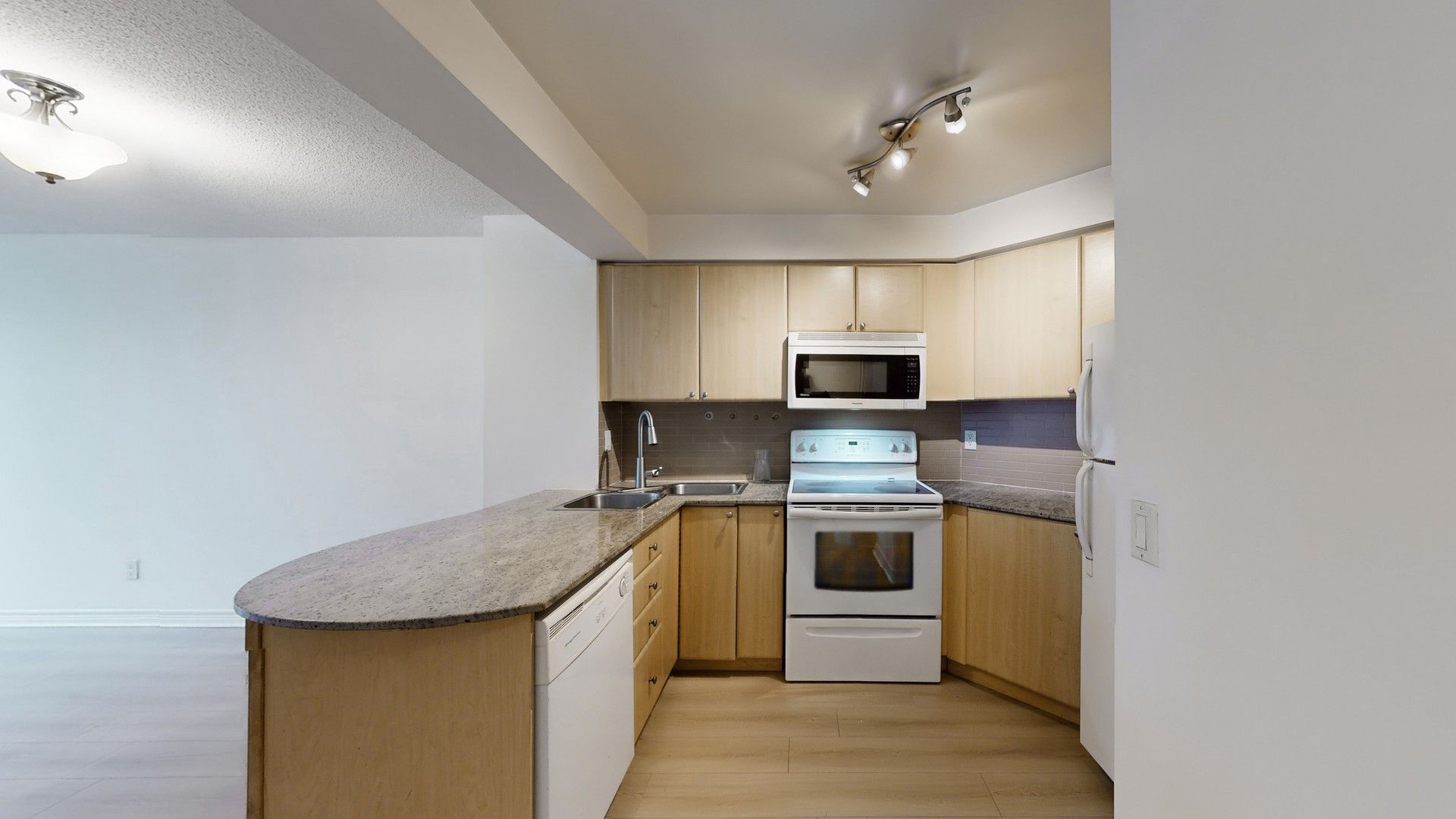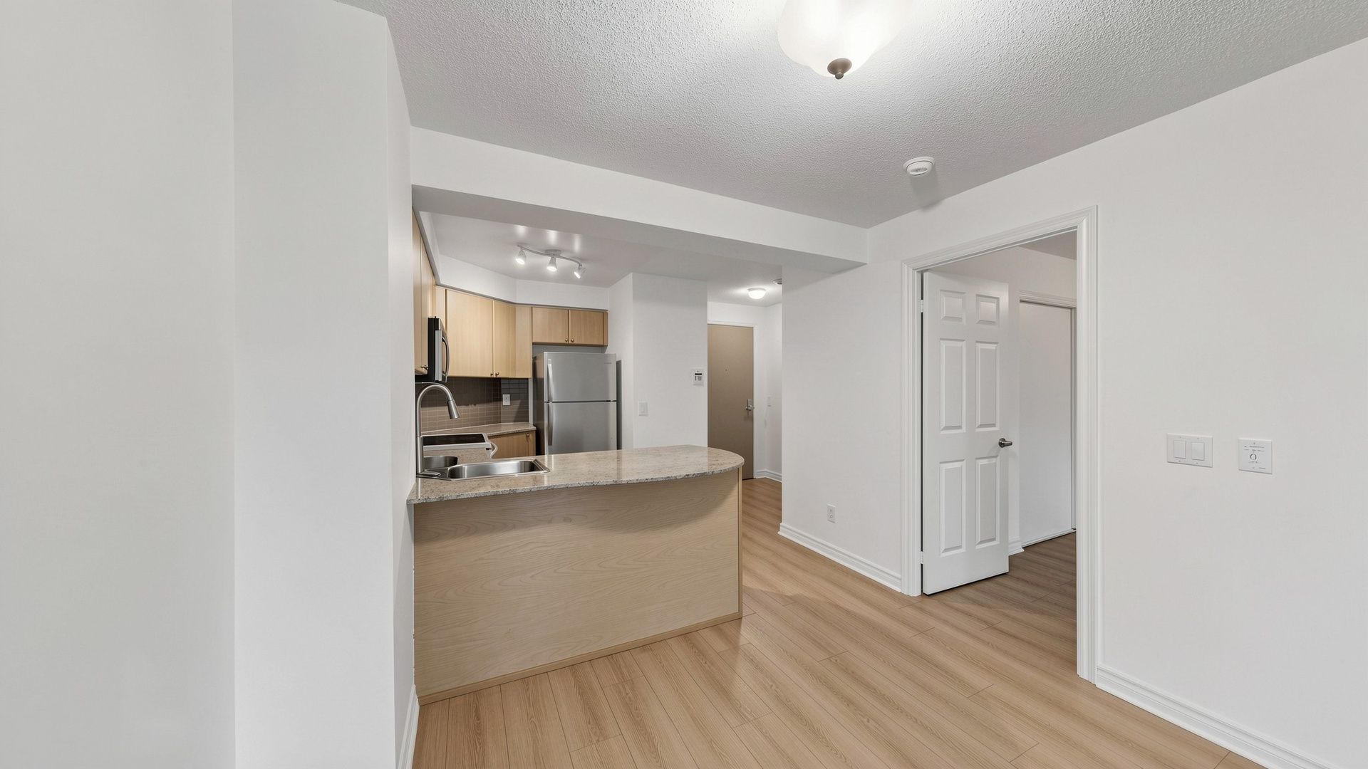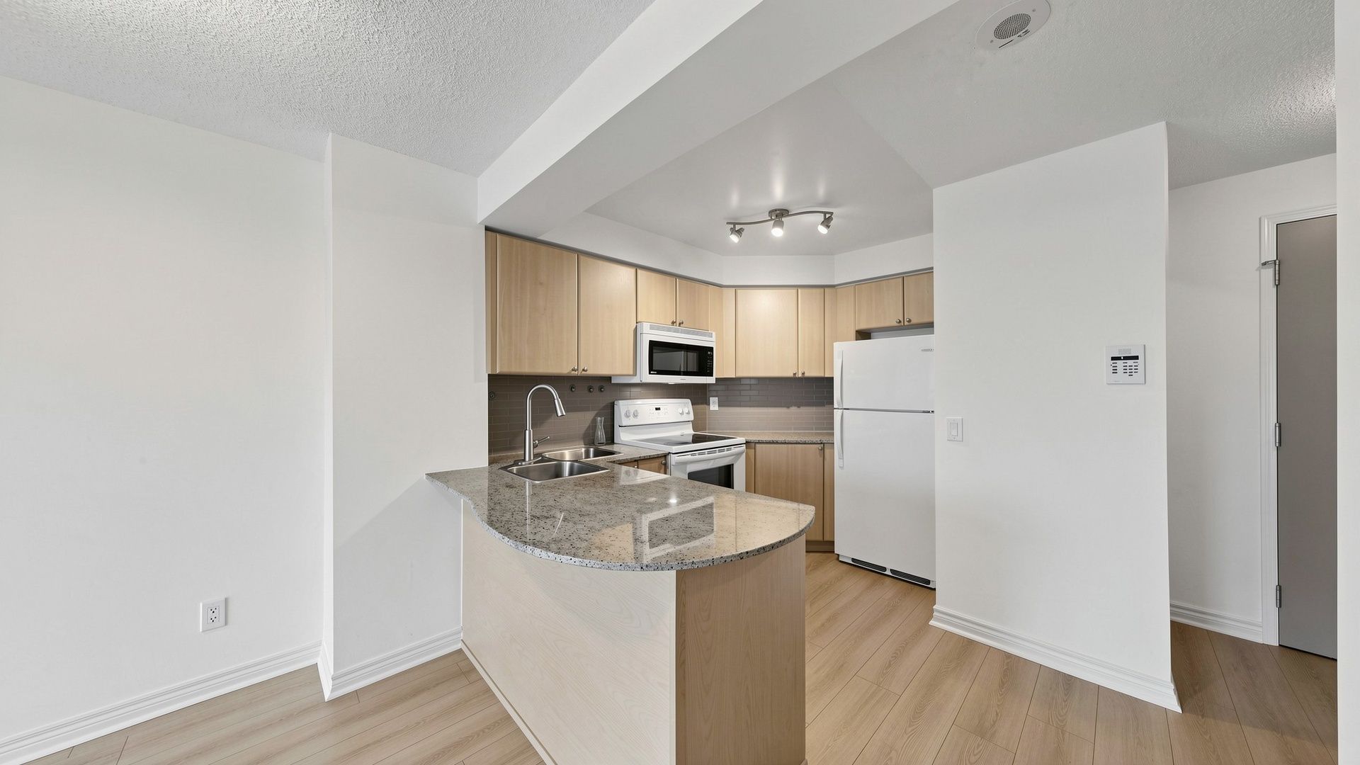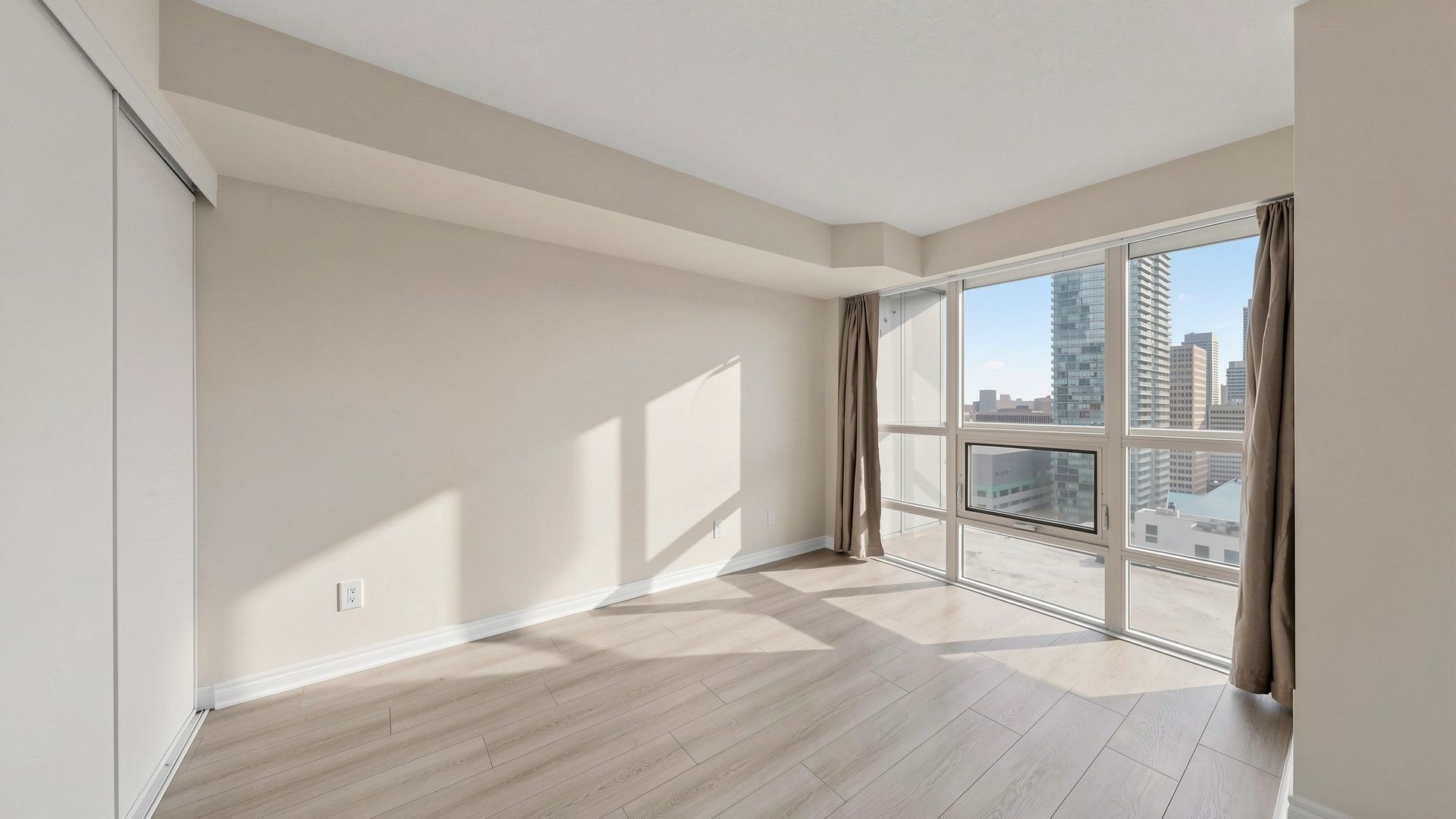 Vacant, renovated and ready for immediate occupancy. Welcome to college park condos, ideally situated in the core of downtown toronto. This thoughtfully laid-out one-bedroom, one-bathroom suite offers a bright and airy feel, enhanced by large windows and an abundance of natural light. The open-concept living and dining space is both practical and inviting, with a seamless walkout to a private balcony showcasing clear north-facing city views. The kitchen is designed for both everyday use and entertaining, featuring granite countertops, a breakfast bar, and generous cabinet space. Brand new premium laminate flooring runs throughout the unit, adding a modern touch. Parking is included for added convenience. Located in a highly sought-after area with a walk score of 99, residents enjoy direct underground access to the subway along with immediate proximity to shops, restaurants, parks, and essential amenities. Just minutes from toronto metropolitan university, university of toronto, 'major hospitals, the cf toronto eaton centre, and the financial district. Maintenance fees are all-inclusive, offering exceptional value in a prime urban location.