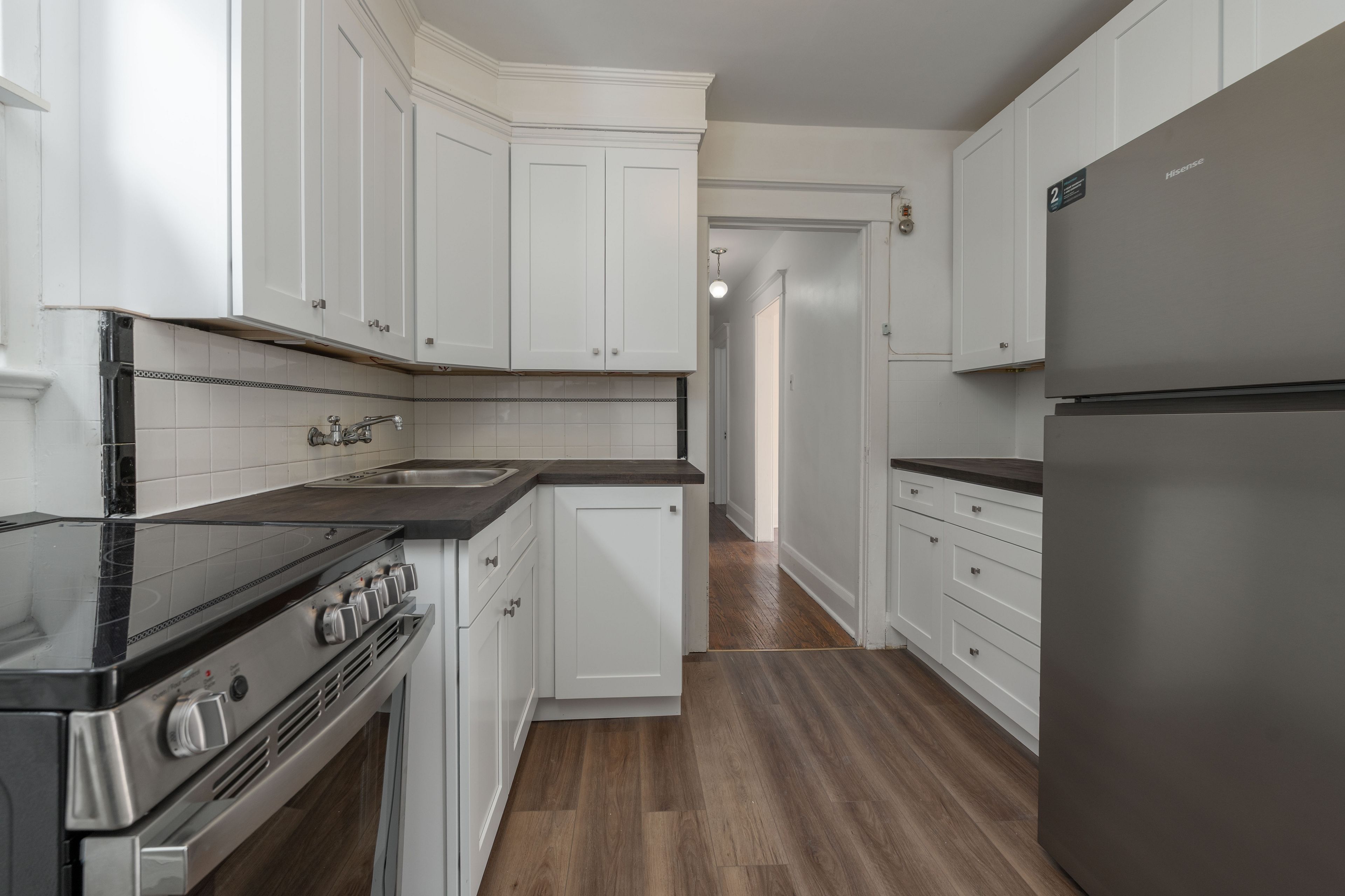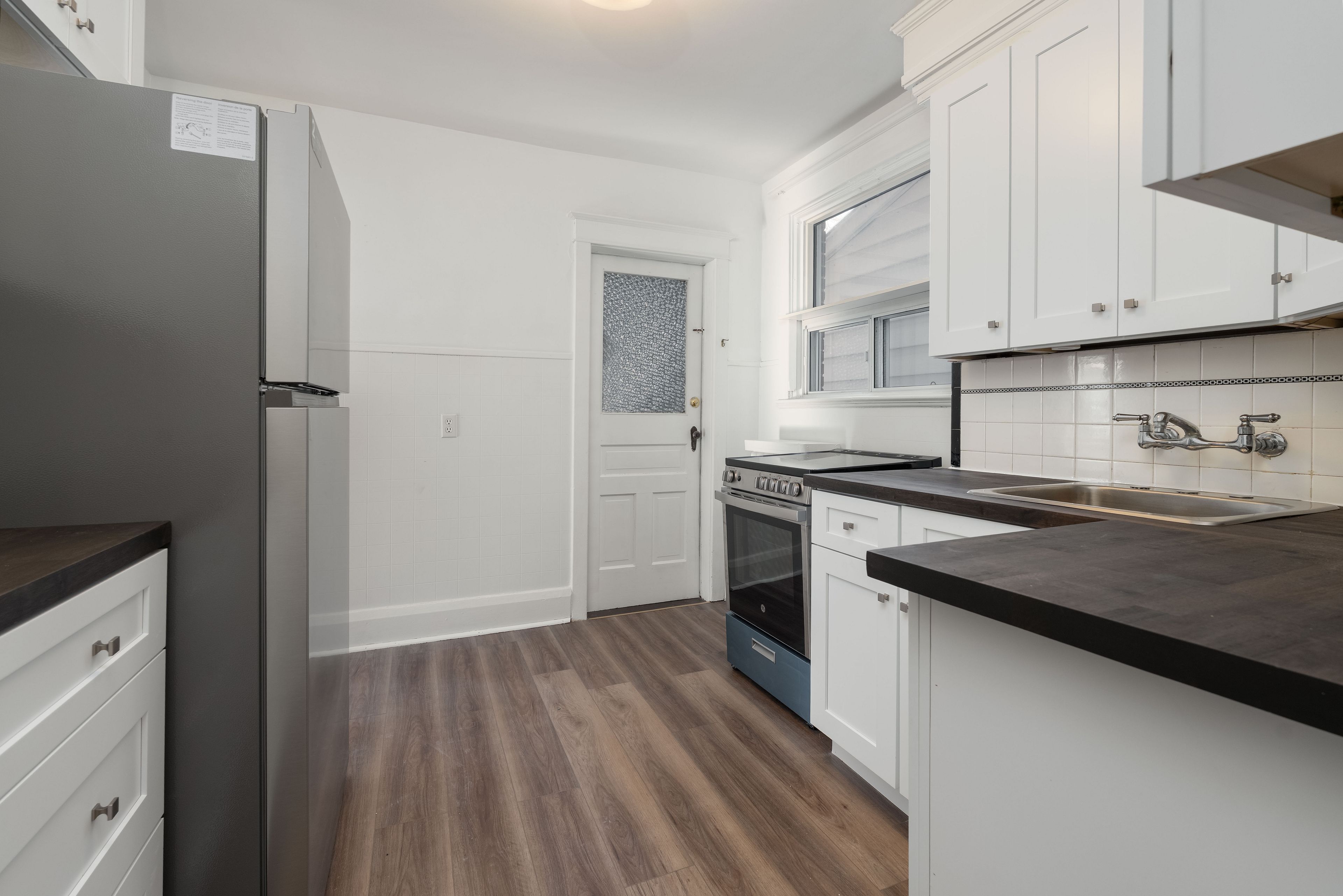 • Updated kitchen features new cabinets, fridge, and stove for modern cooking.