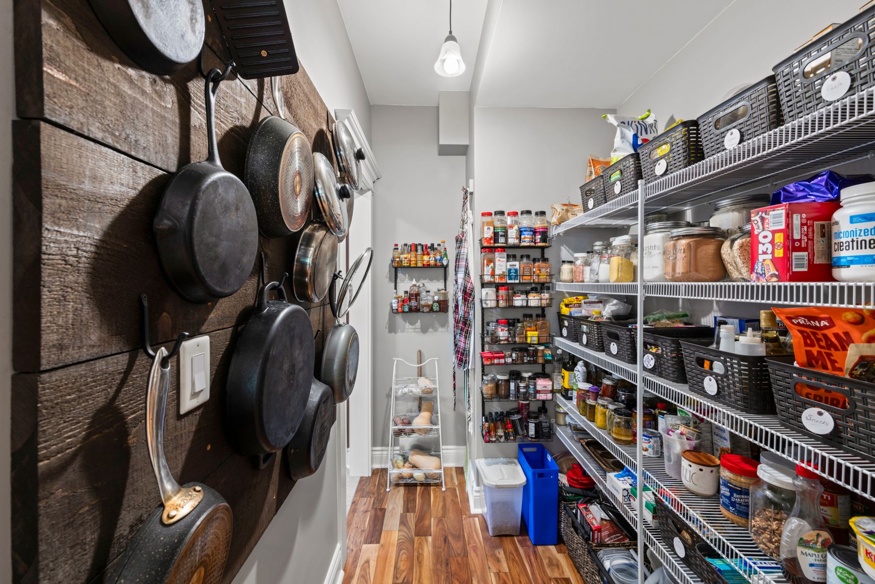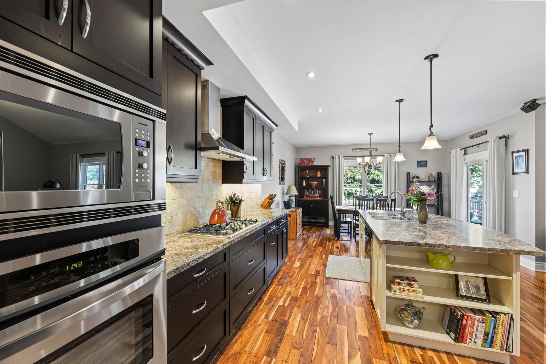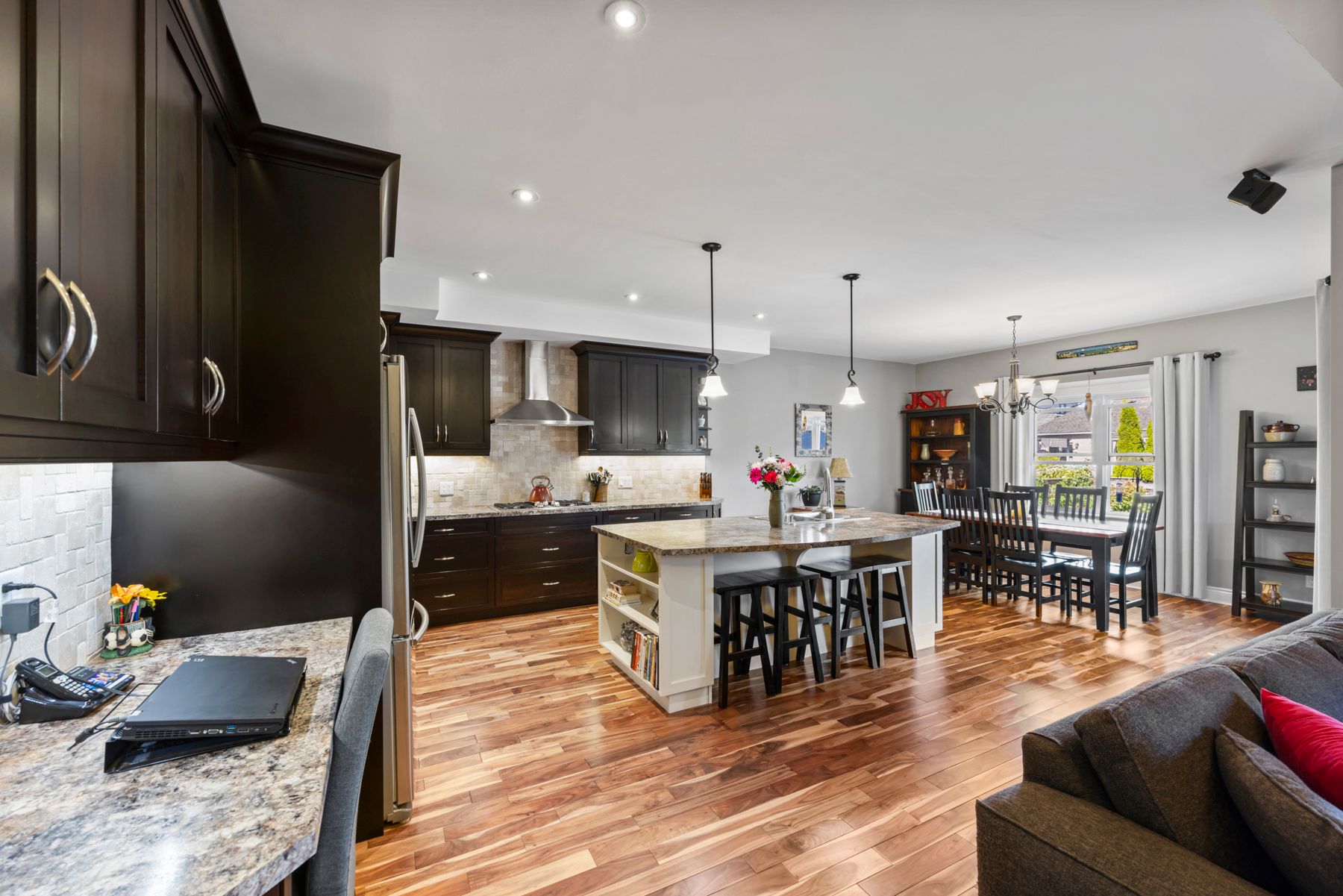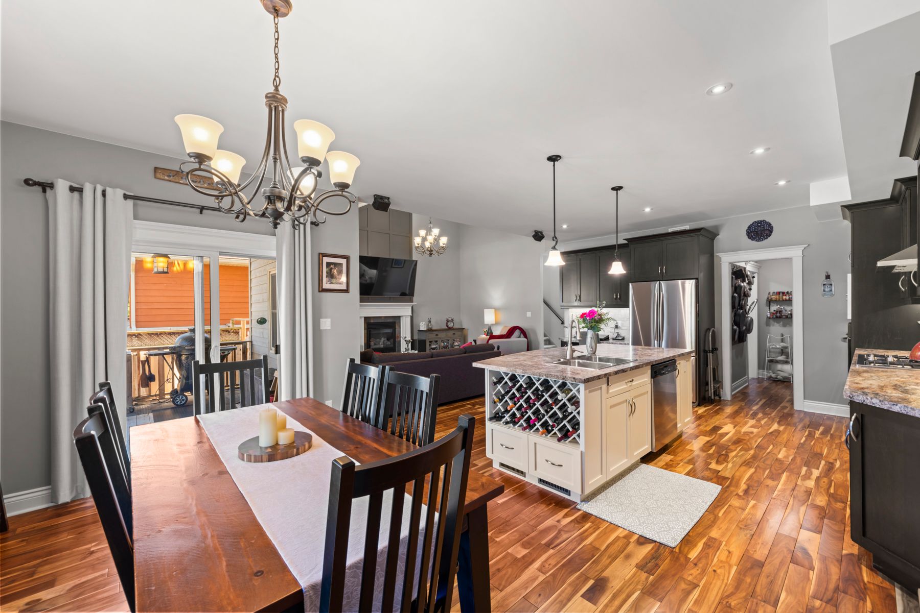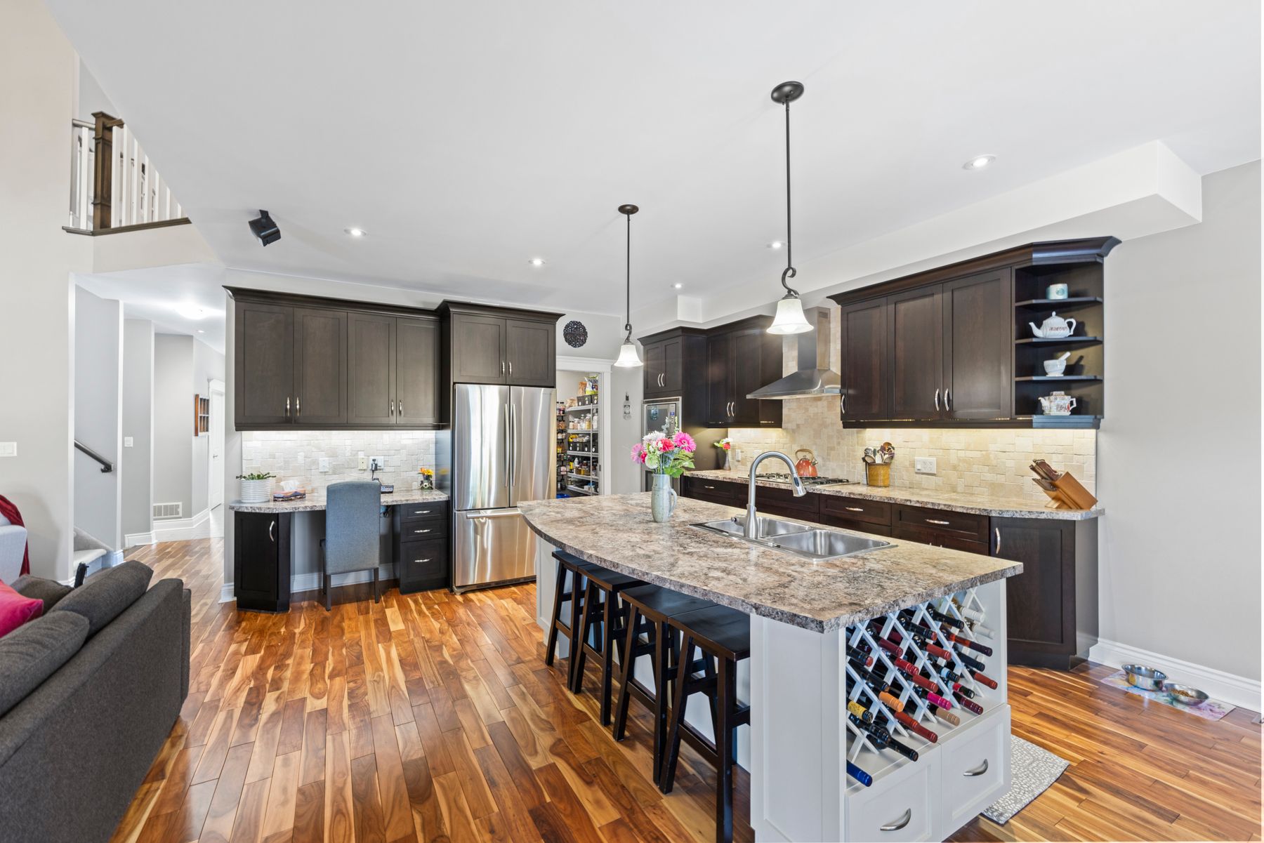 • Open concept kitchen with large island, pantry, and ample storage.