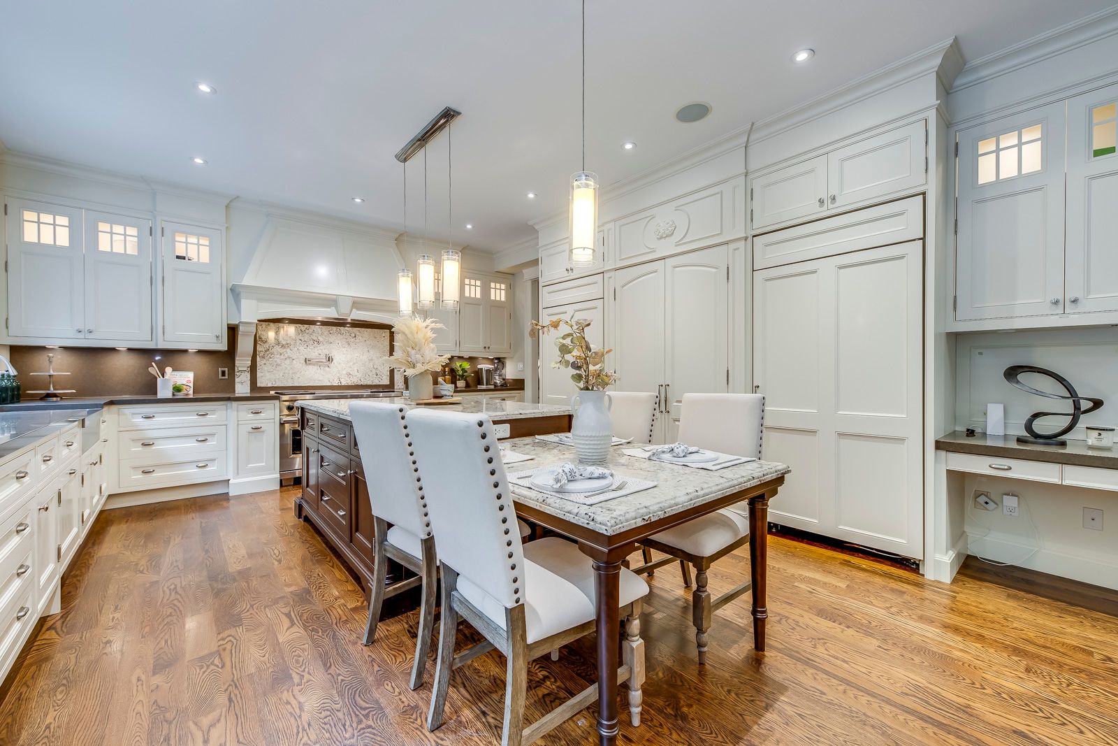 • Gourmet kitchen with large island, quartz countertops, and built-in appliances.