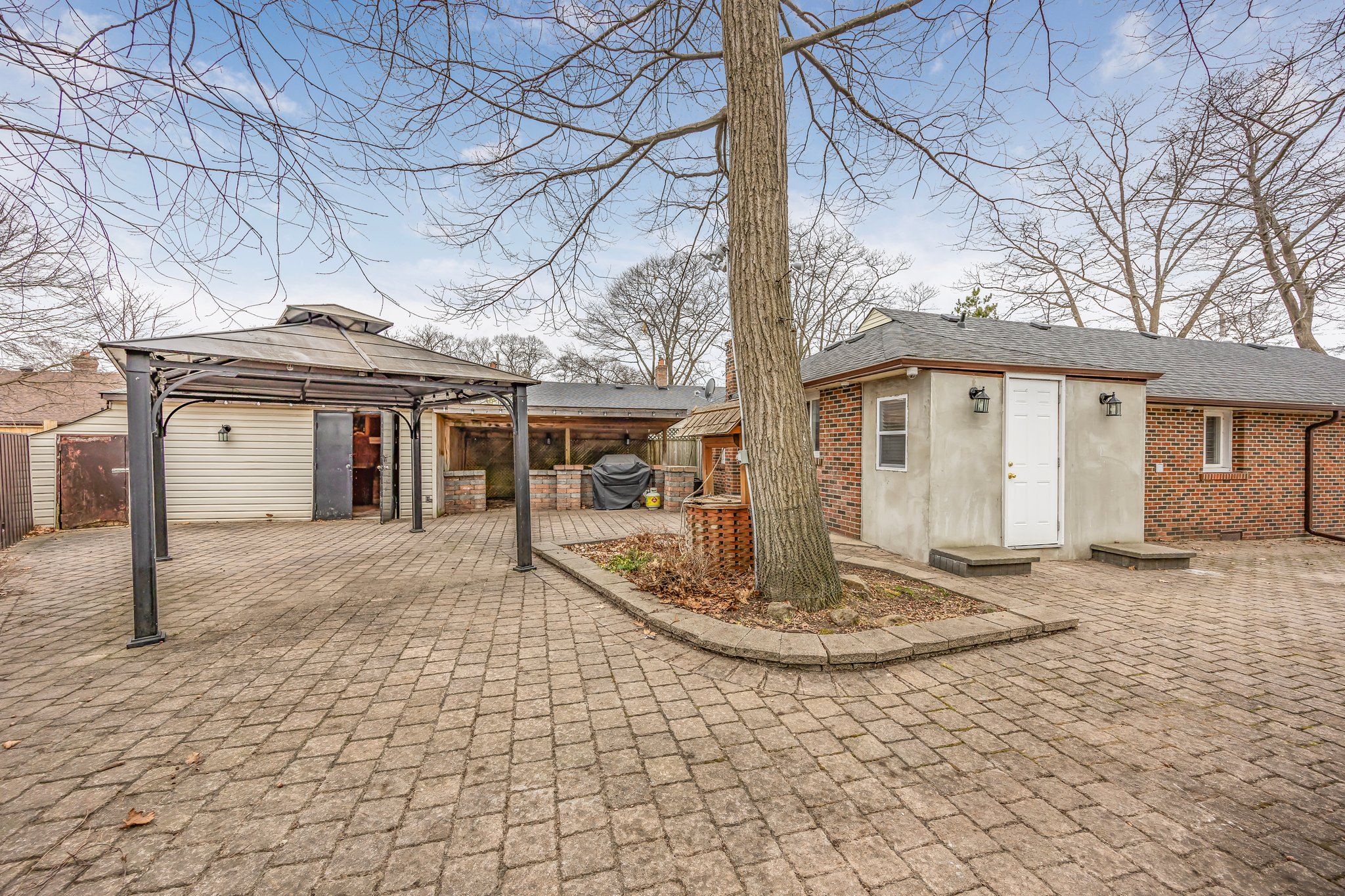• Shared outdoor patio area with kitchen and pergola for gatherings.