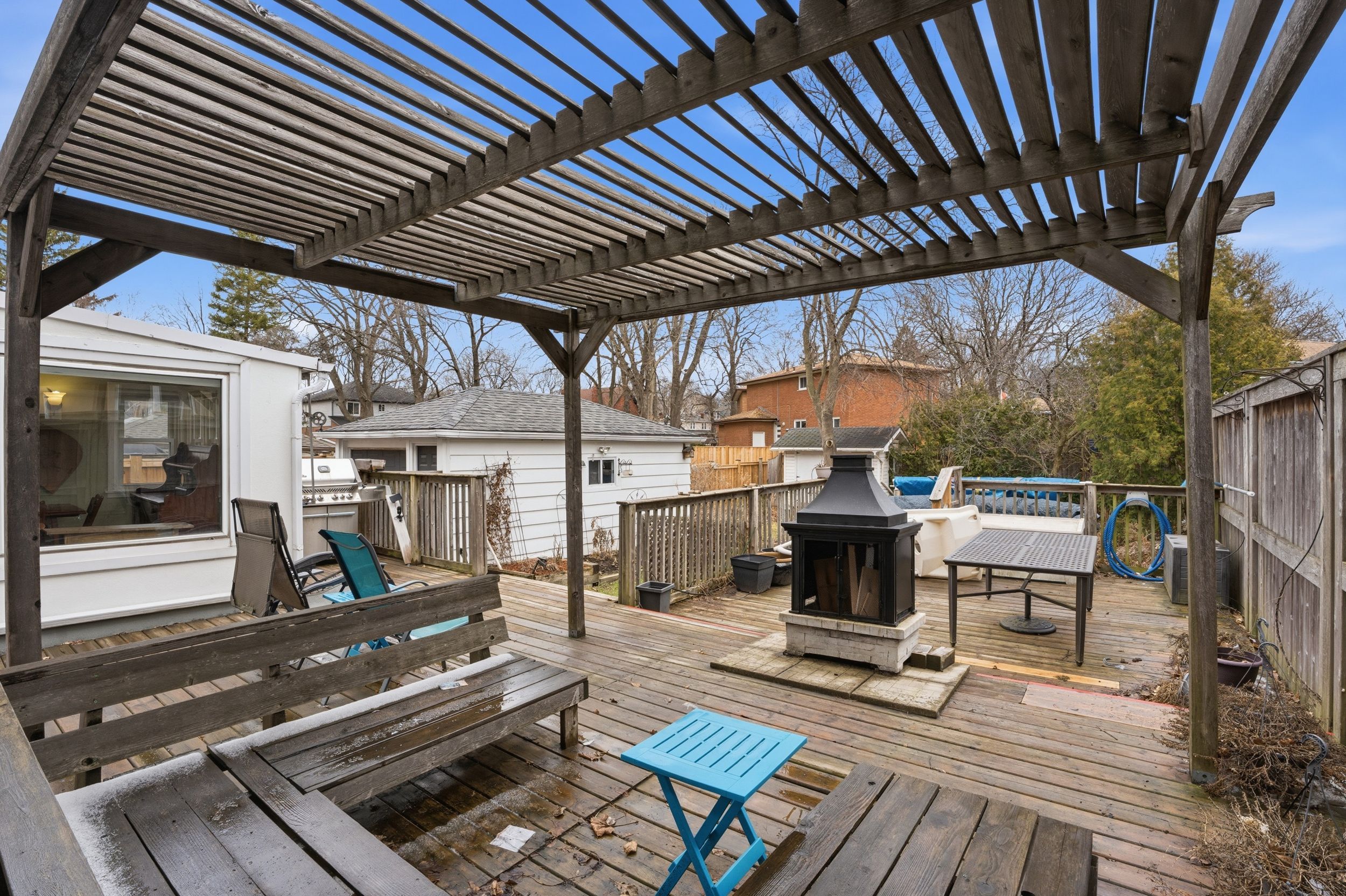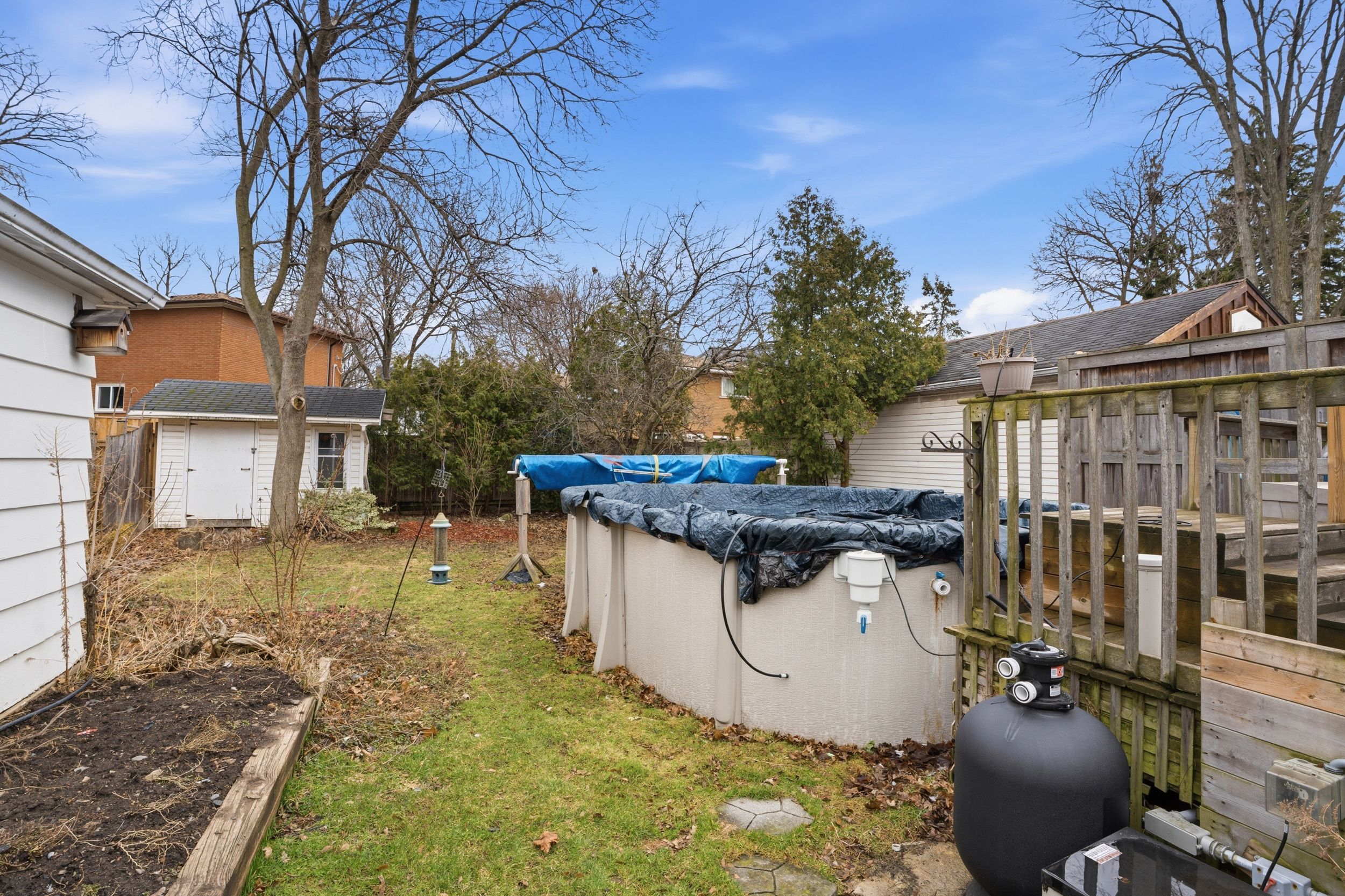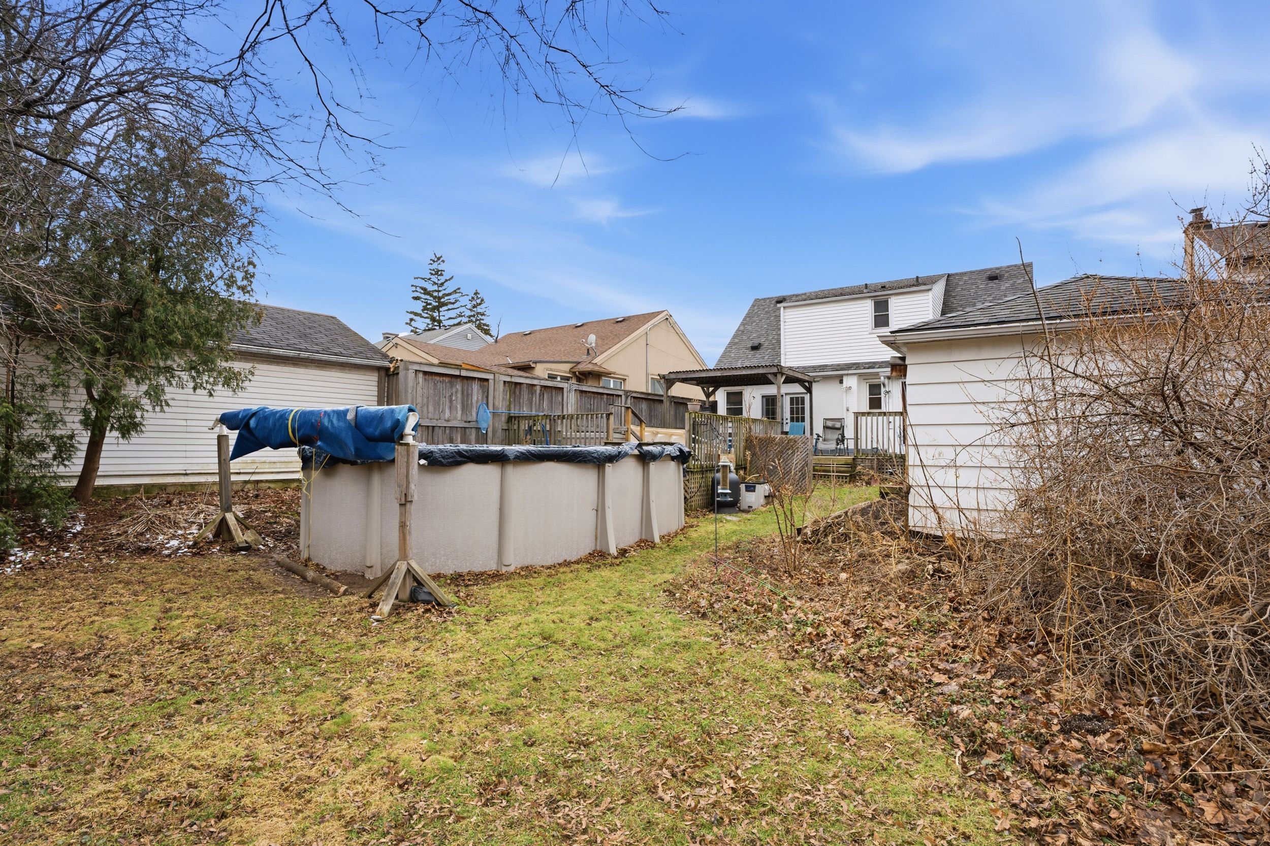 • Private backyard with an expansive deck and above-ground pool.