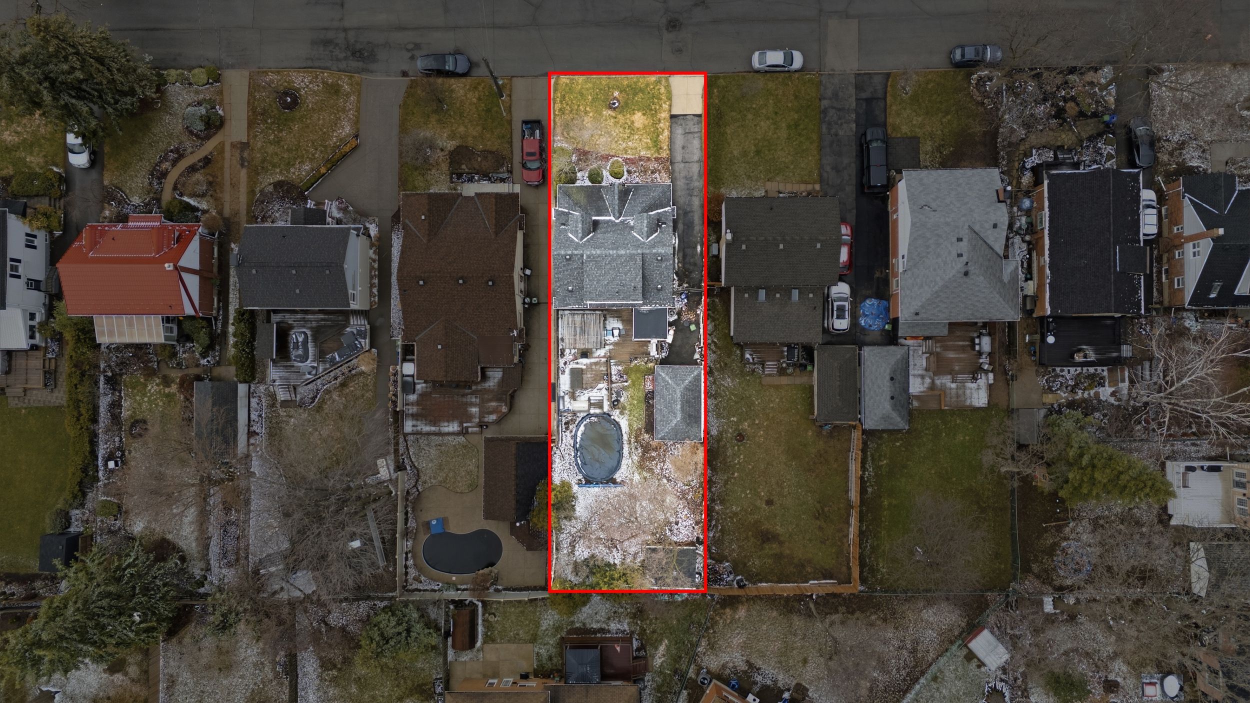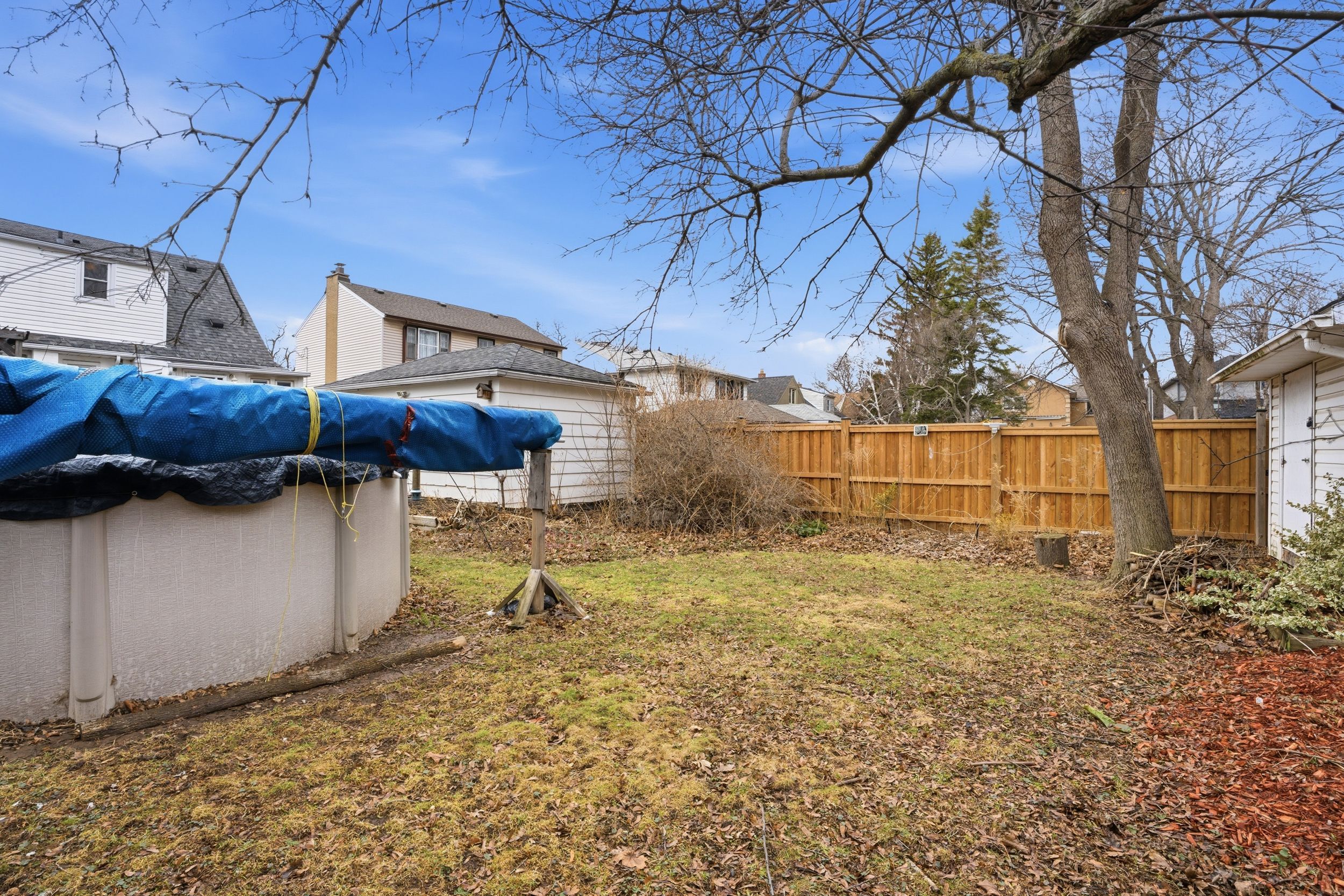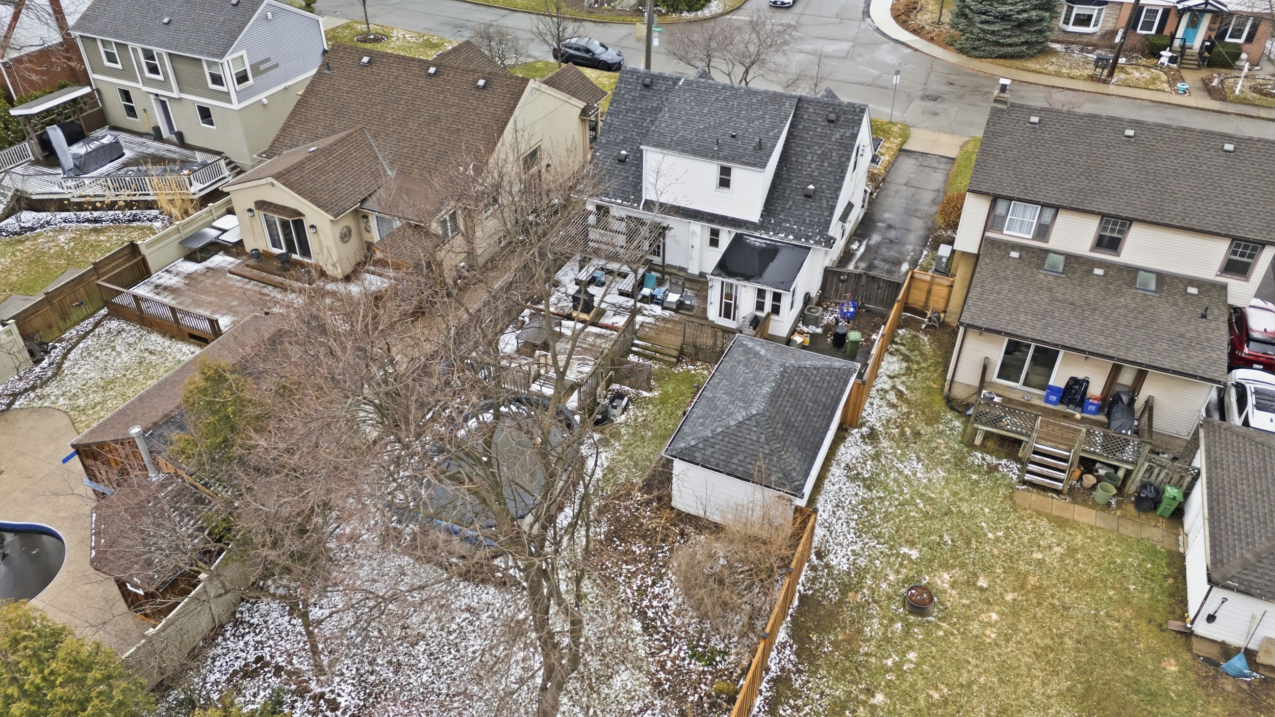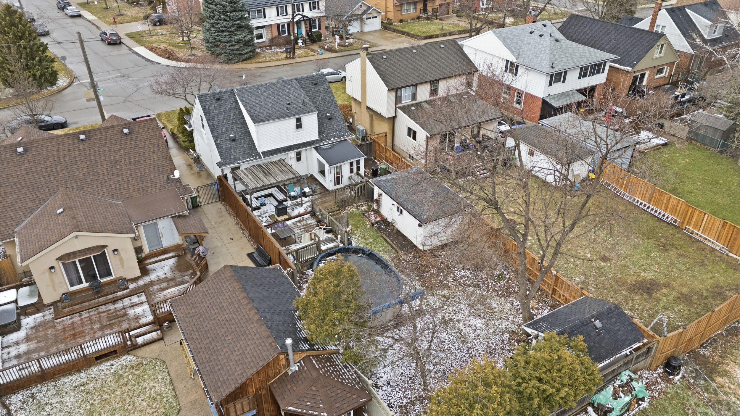 • Private backyard with an expansive deck and above-ground pool.