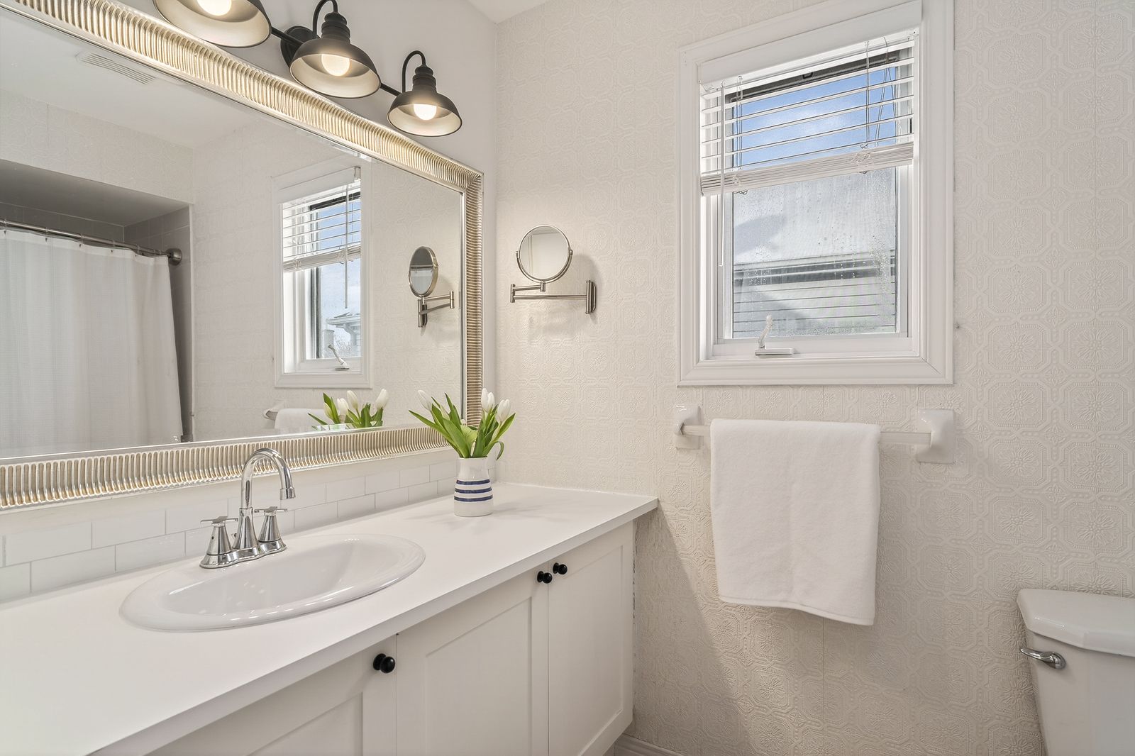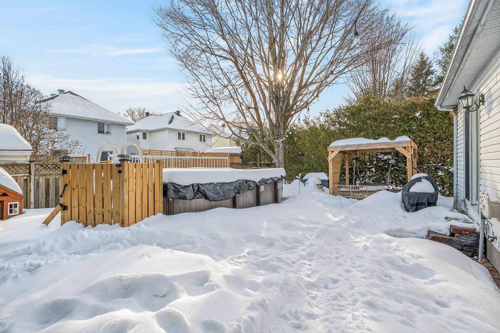 • South-facing landscaped yard with cedar hedges and a heated pool.