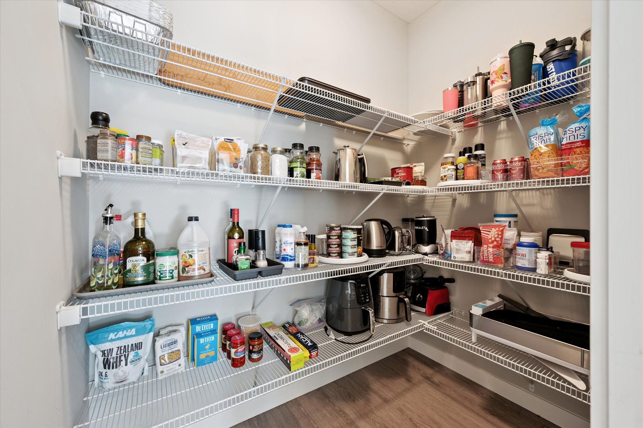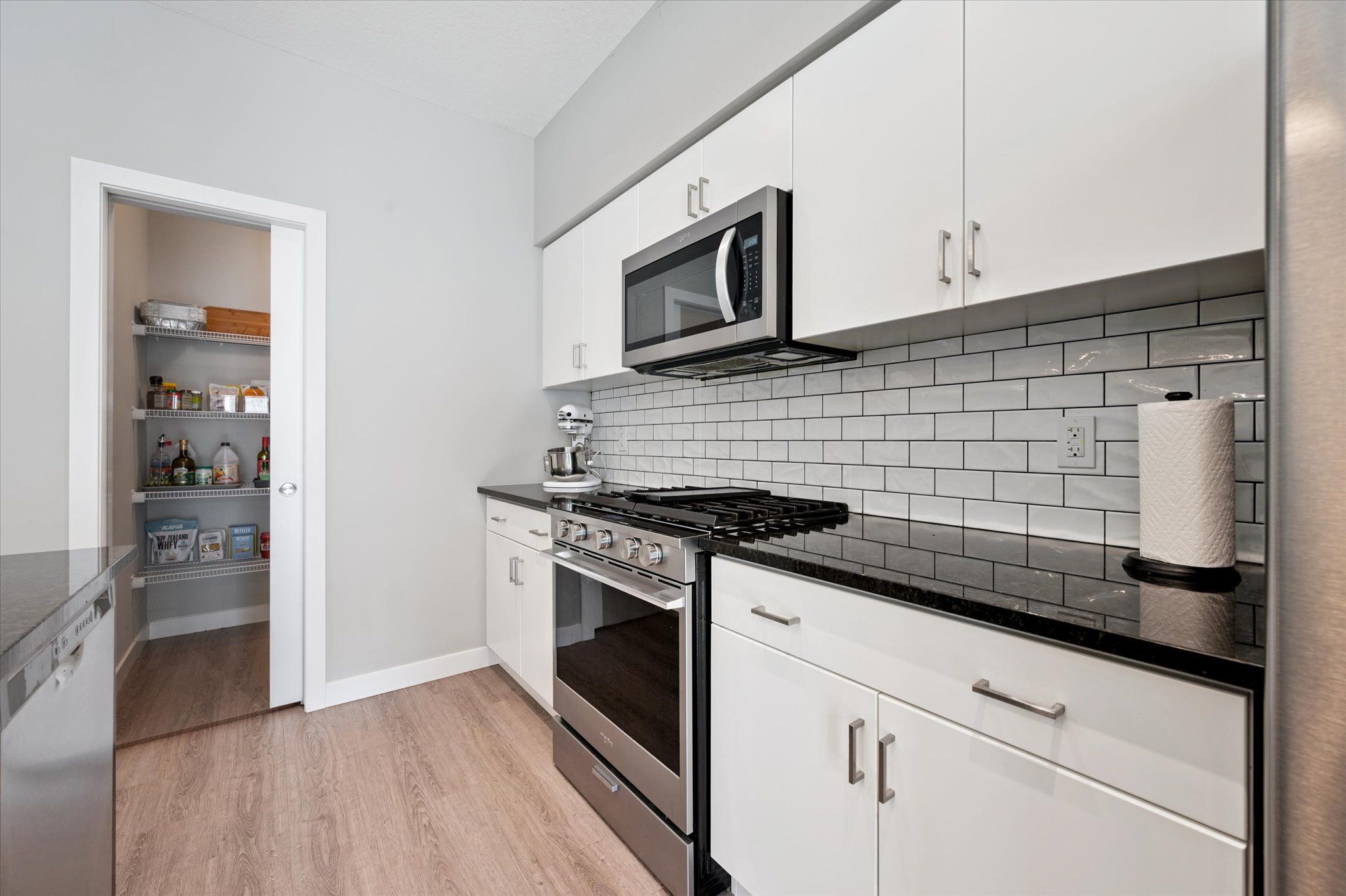 • Chef-inspired kitchen with granite countertops, gas range, and walk-in pantry.