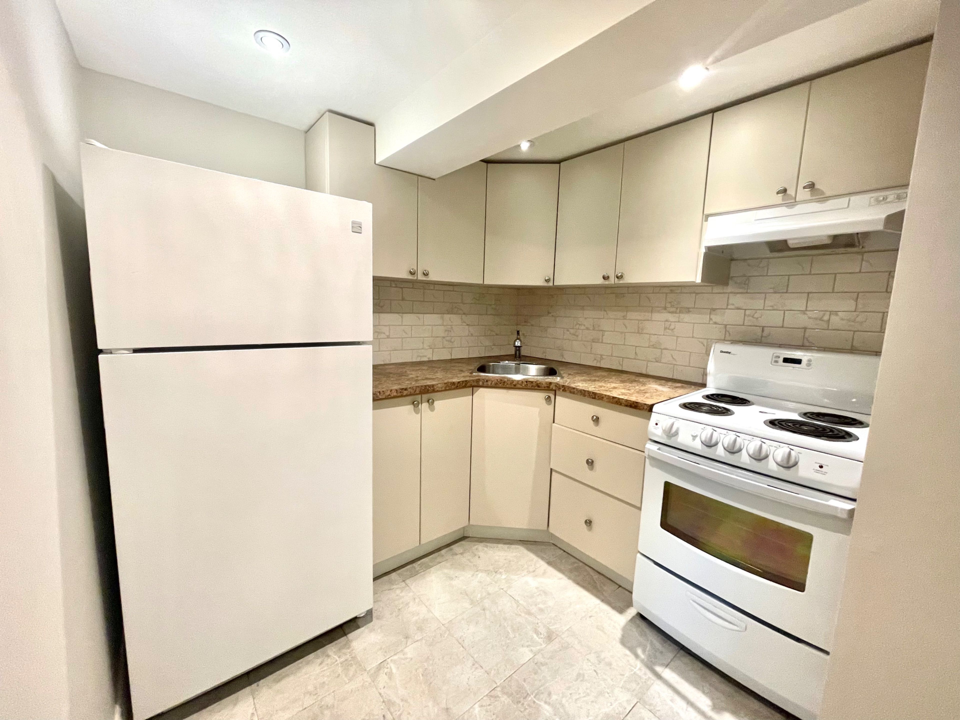 • Full kitchen with fridge, stove, and ample storage cabinets.