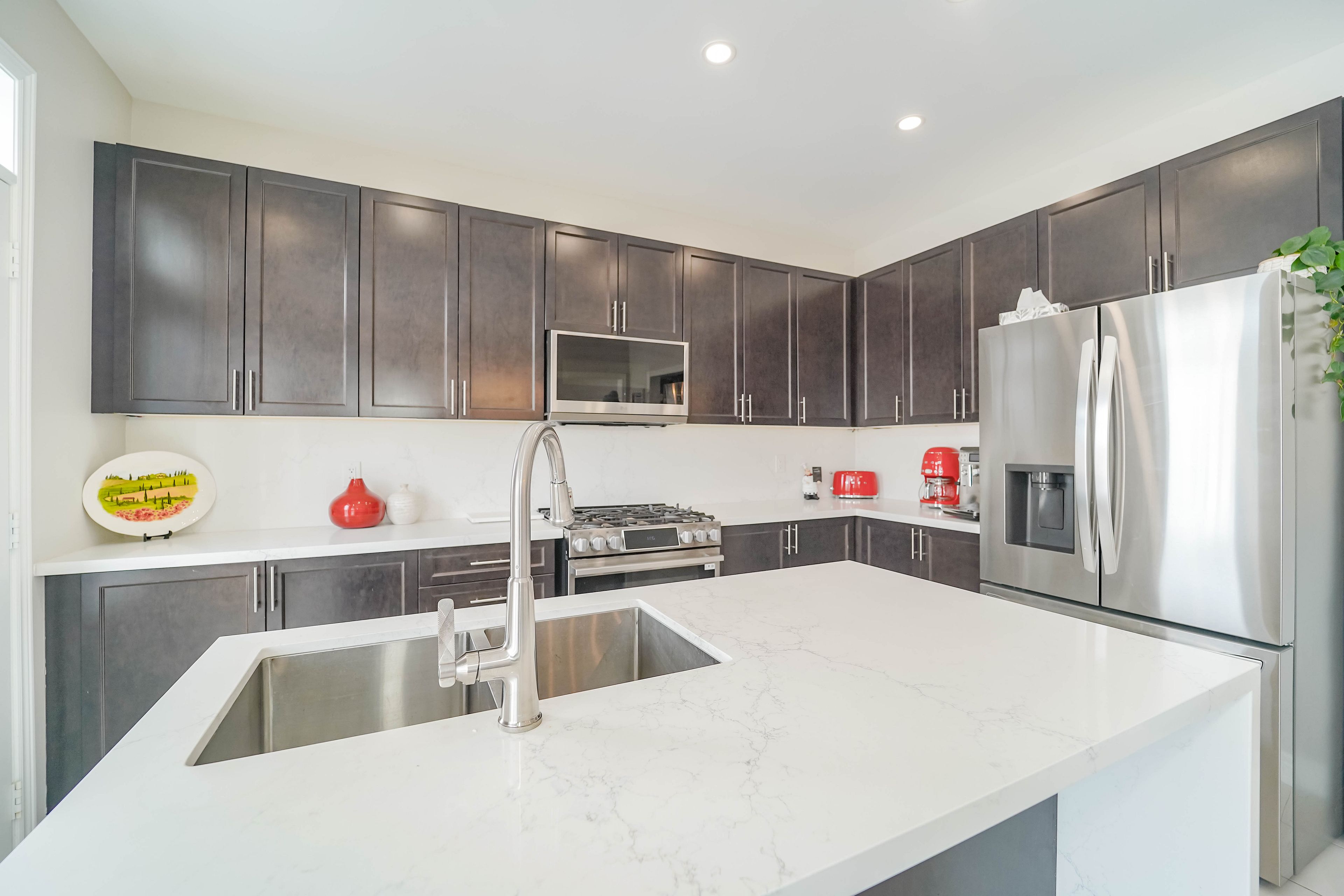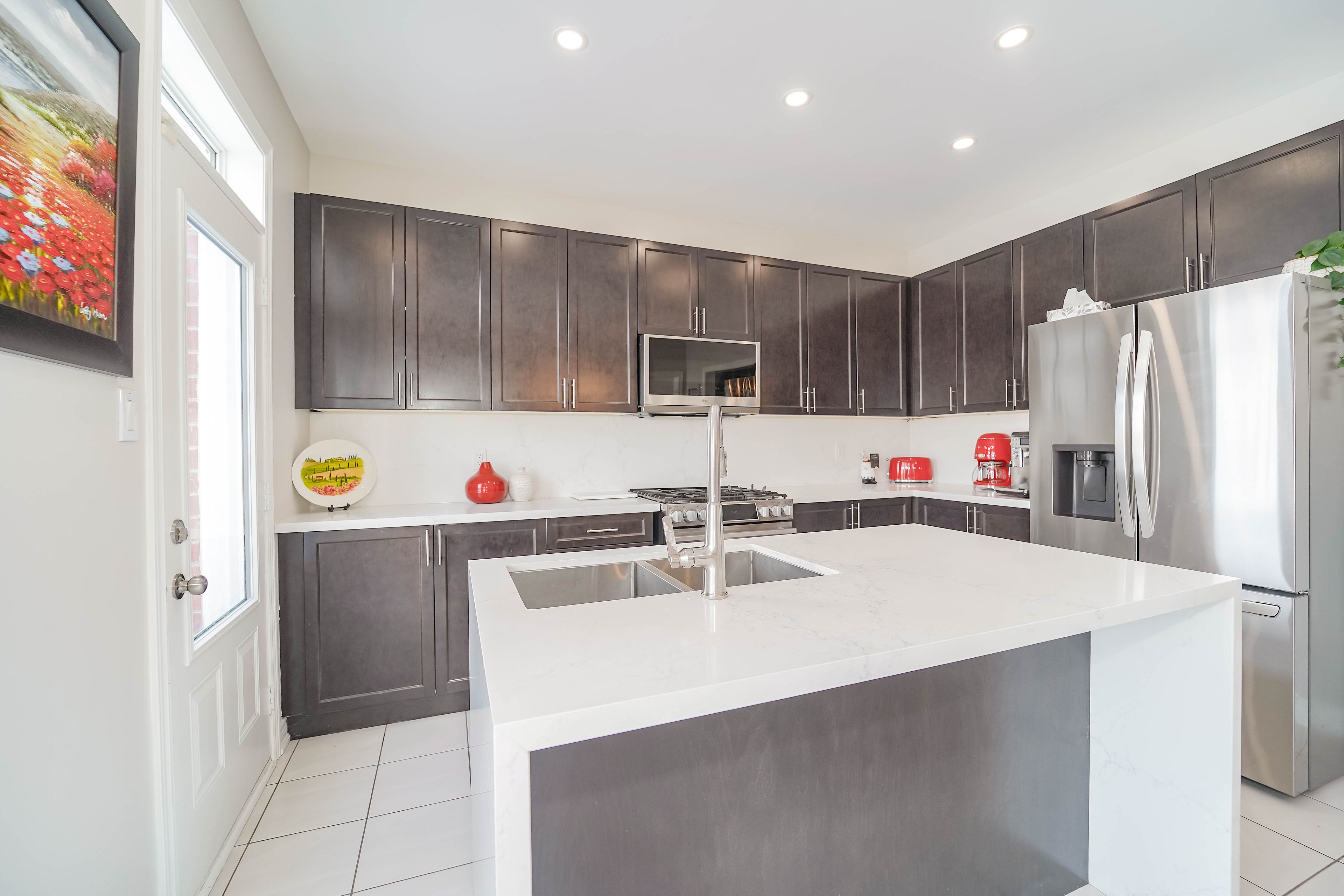 • Modern kitchen features quartz countertops and a balcony for entertaining.