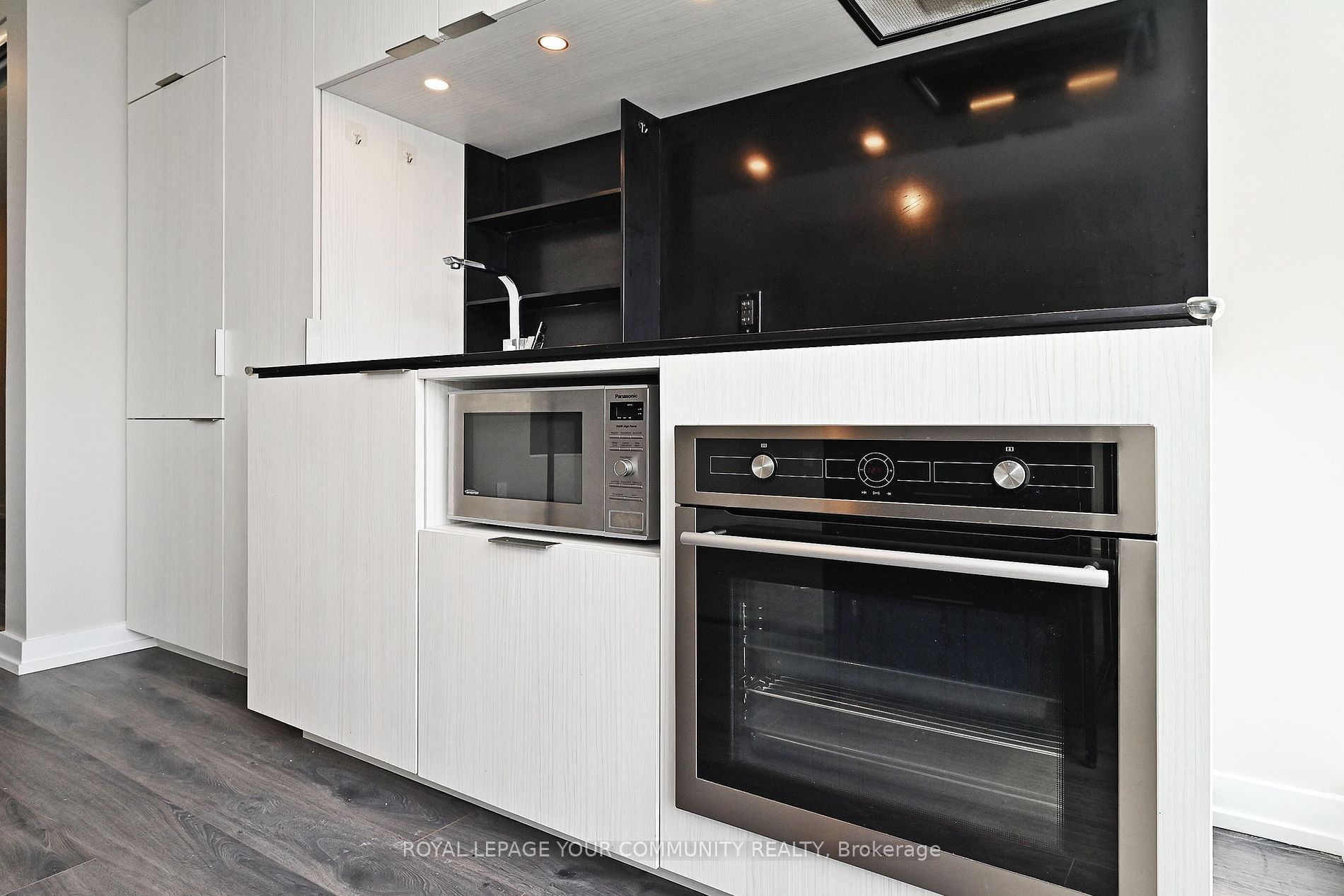 • Sleek kitchen features stone countertops and under-cabinet lighting.