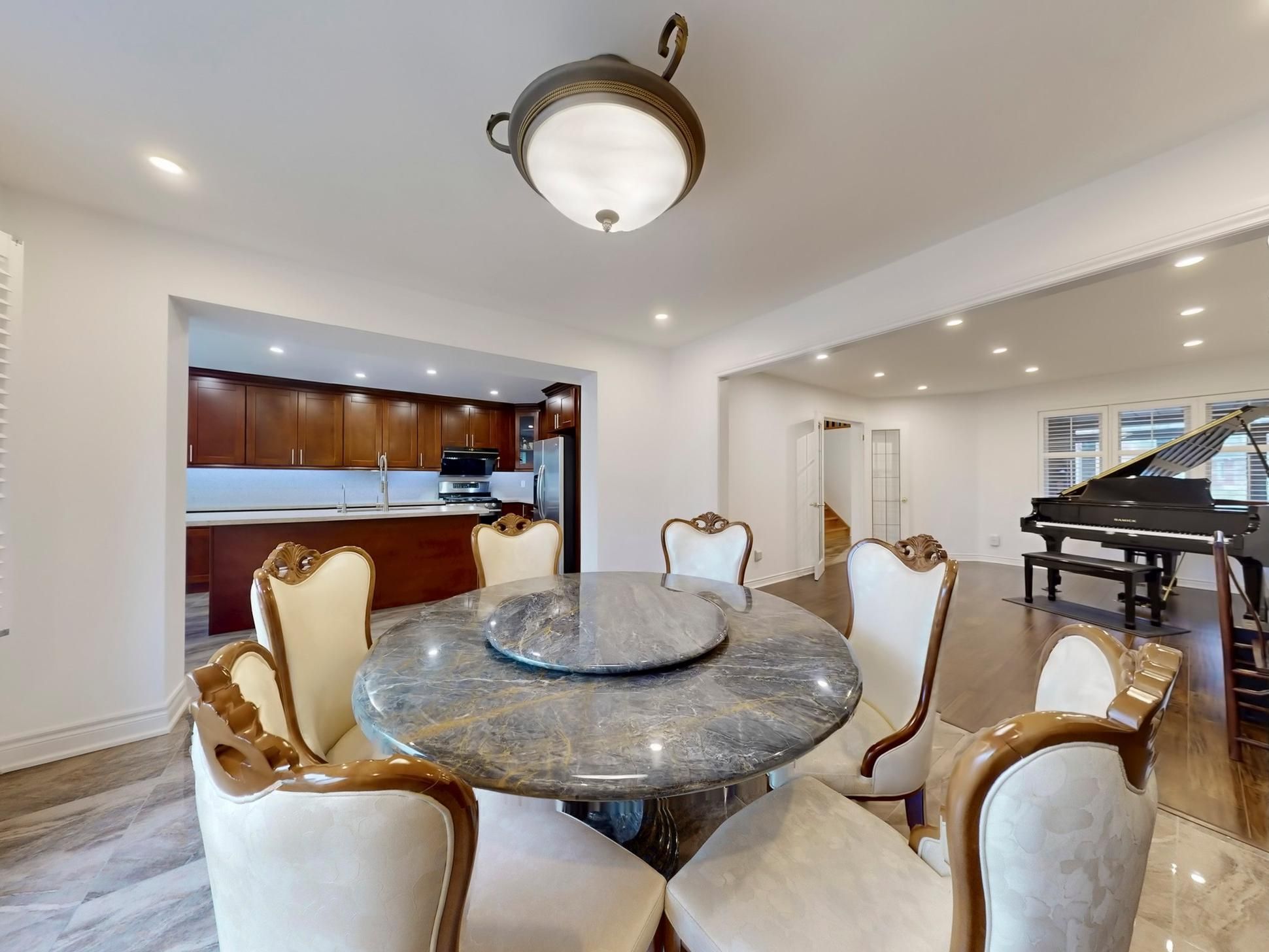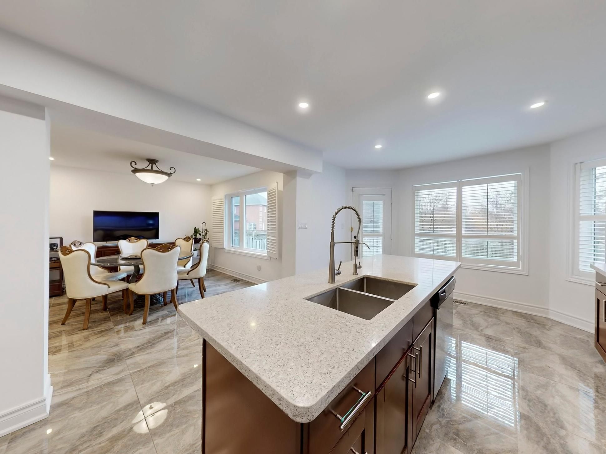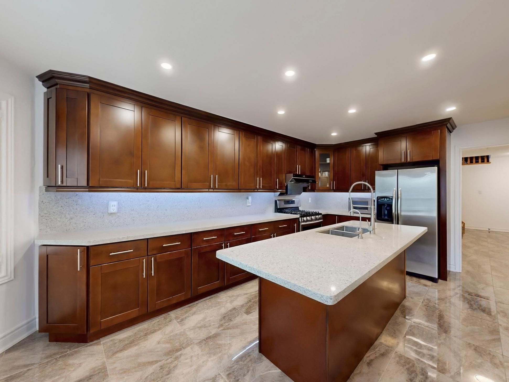 • Open-concept kitchen features quartz countertops and stainless steel appliances.