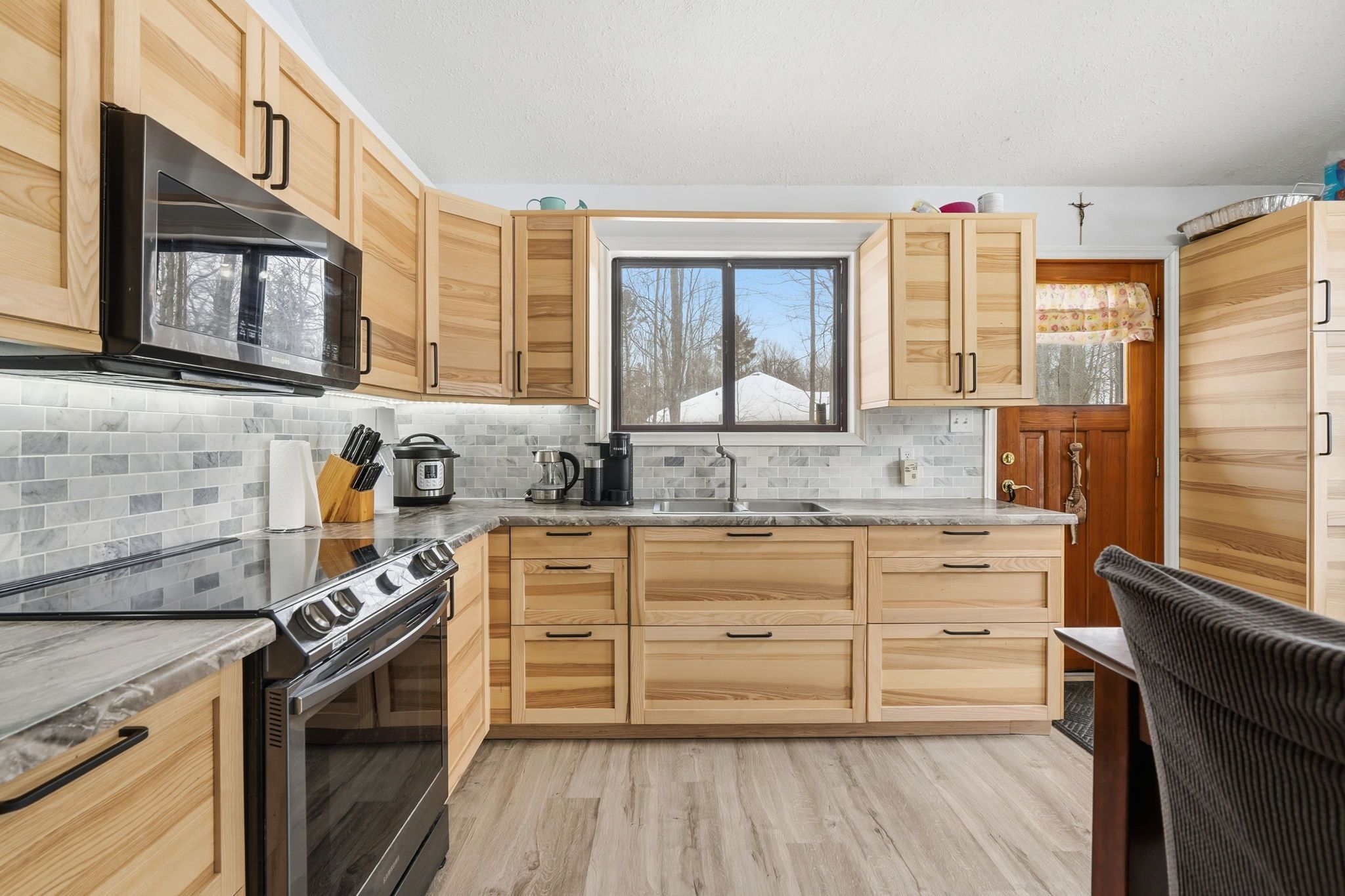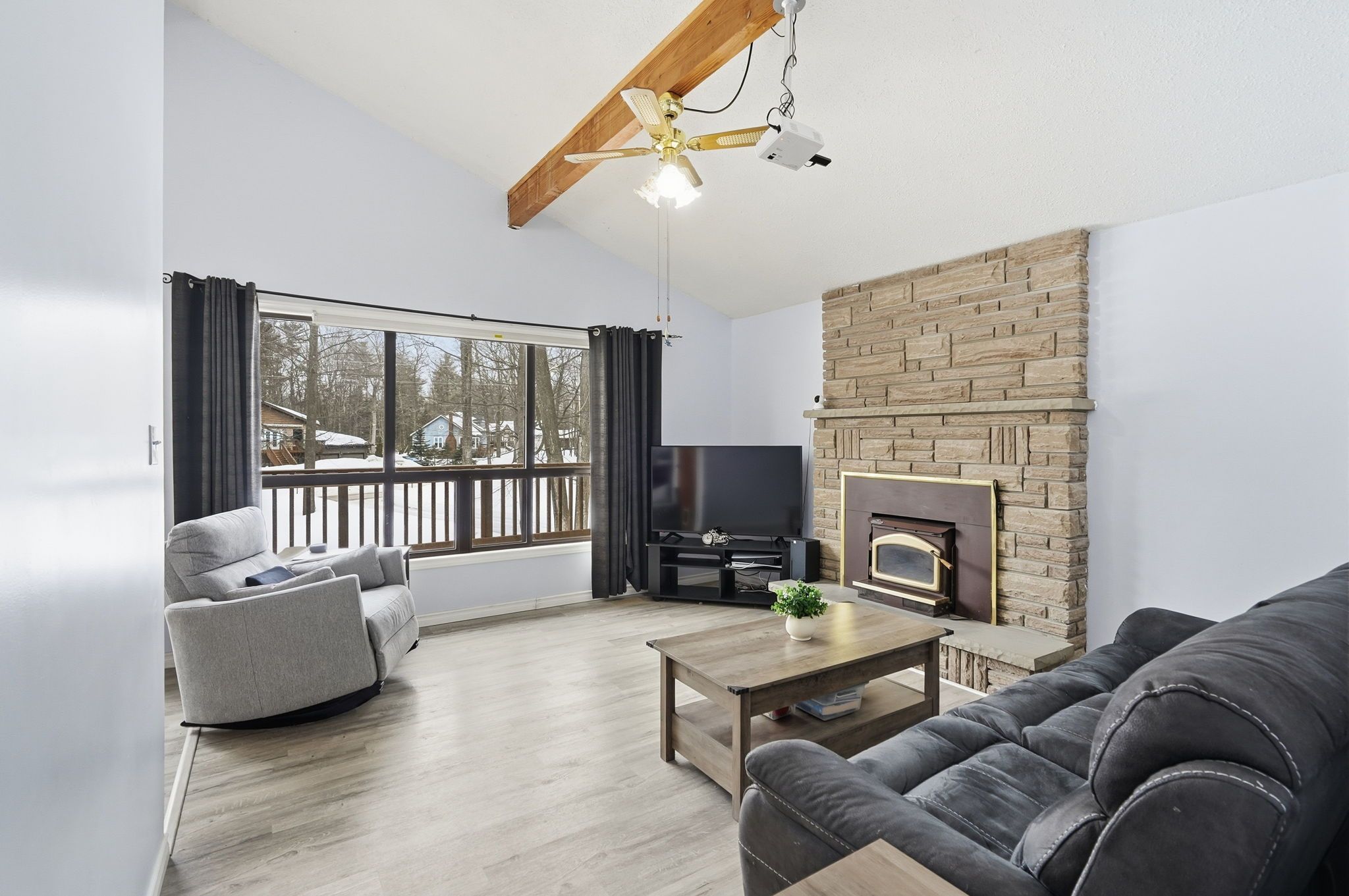 Welcome to 77 tall pines drive in tiny township, located in the sought-after tiny beaches area just off the 16th concession. This well-maintained brick bungalow sits on just under 3/4's of an acre, offering privacy, space, and a peaceful setting surrounded by mature trees. Inside, the home features a bright and inviting layout with vaulted ceilings and a beautifully updated kitchen that flows seamlessly into the main living space. The main level offers three spacious bedrooms and a full bathroom, with the bedrooms set slightly above the living area for added separation and privacy. The partially finished walkout basement expands the living space with sky-high ceilings, a fourth bedroom, an additional full bathroom, and direct access to the backyard-ideal for guests, extended family, or creating a comfortable recreation area. Outside, enjoy the expansive wraparound deck, perfect for relaxing, entertaining, or taking in the natural surroundings. The large lot provides plenty of parking and room to enjoy the outdoors while still being just minutes from the sandy beaches of georgian bay. A fantastic opportunity to enjoy year-round living or a peaceful retreat in one of tiny township's most desirable areas. Notes: sellers are having a gas insert installed in place of the wood stove roof 4-6 years | updated kitchen | s/s appliances 4 years | lvp flooring on main level and stairs | bedroom in lower level w/ egress window | septic documents available - septic was pumped and inspected through tiny's re-inspection program in 2024