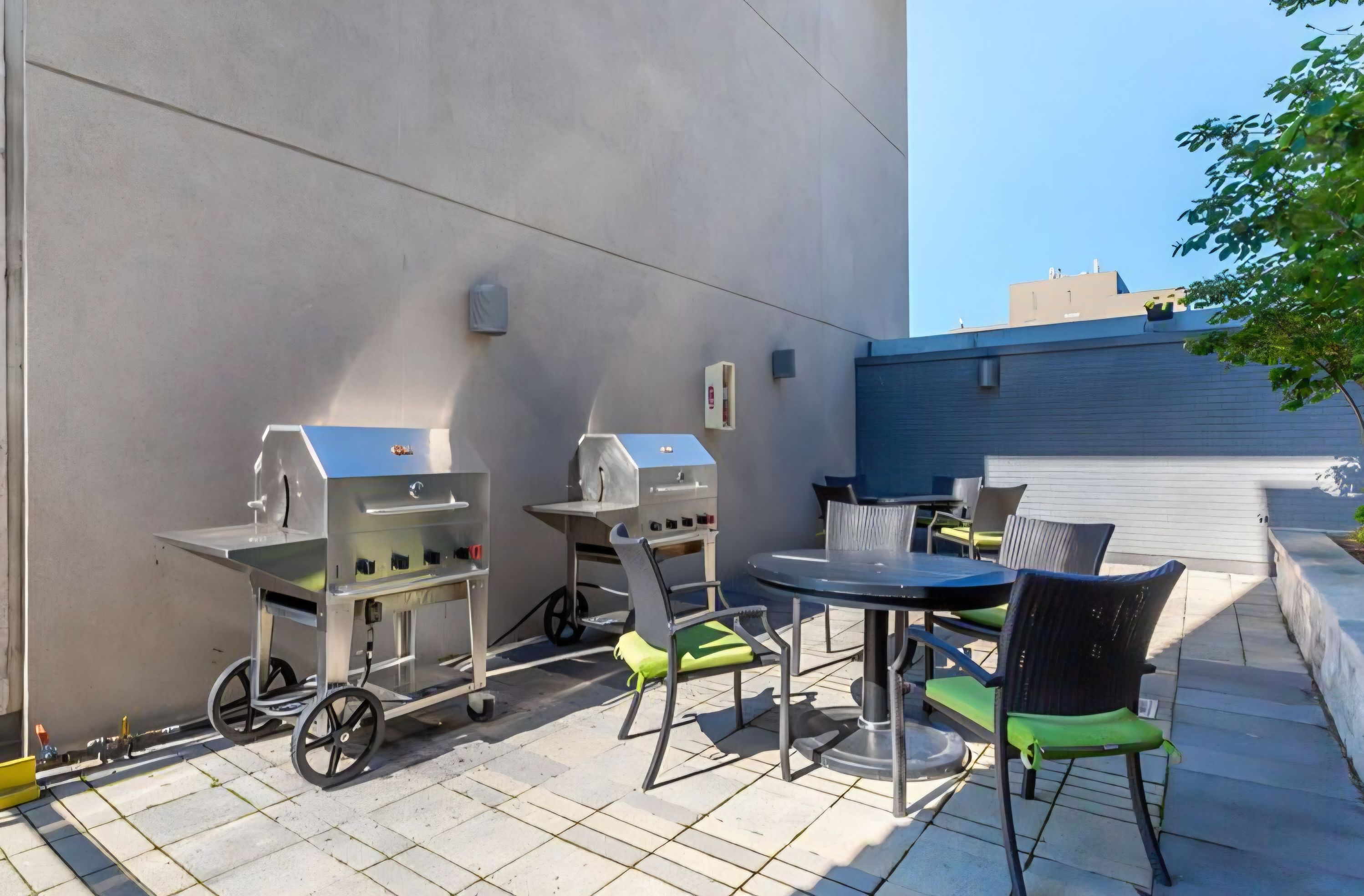 • Amenities include a 24-hour concierge, fitness club, guest suites, and sauna.