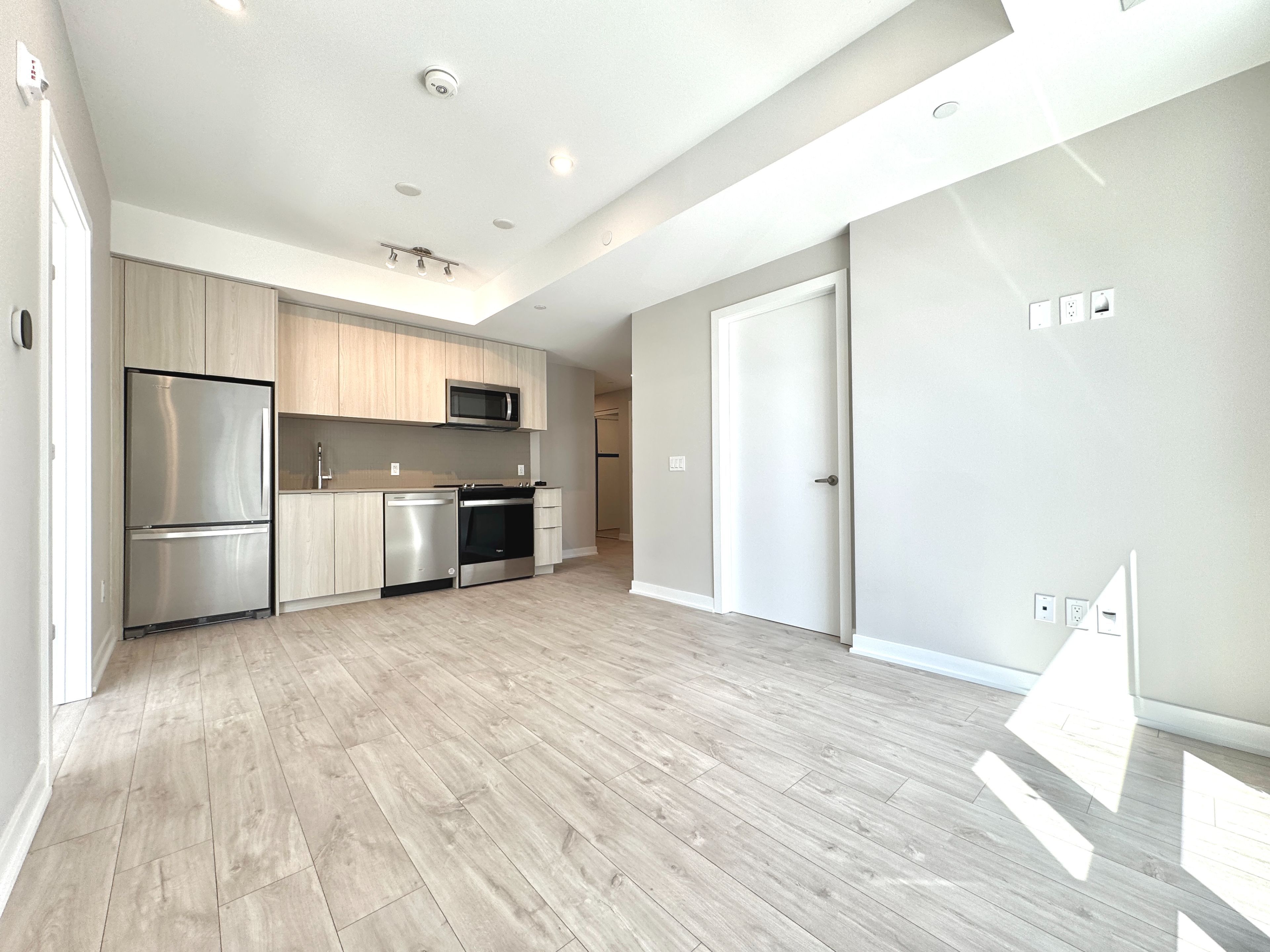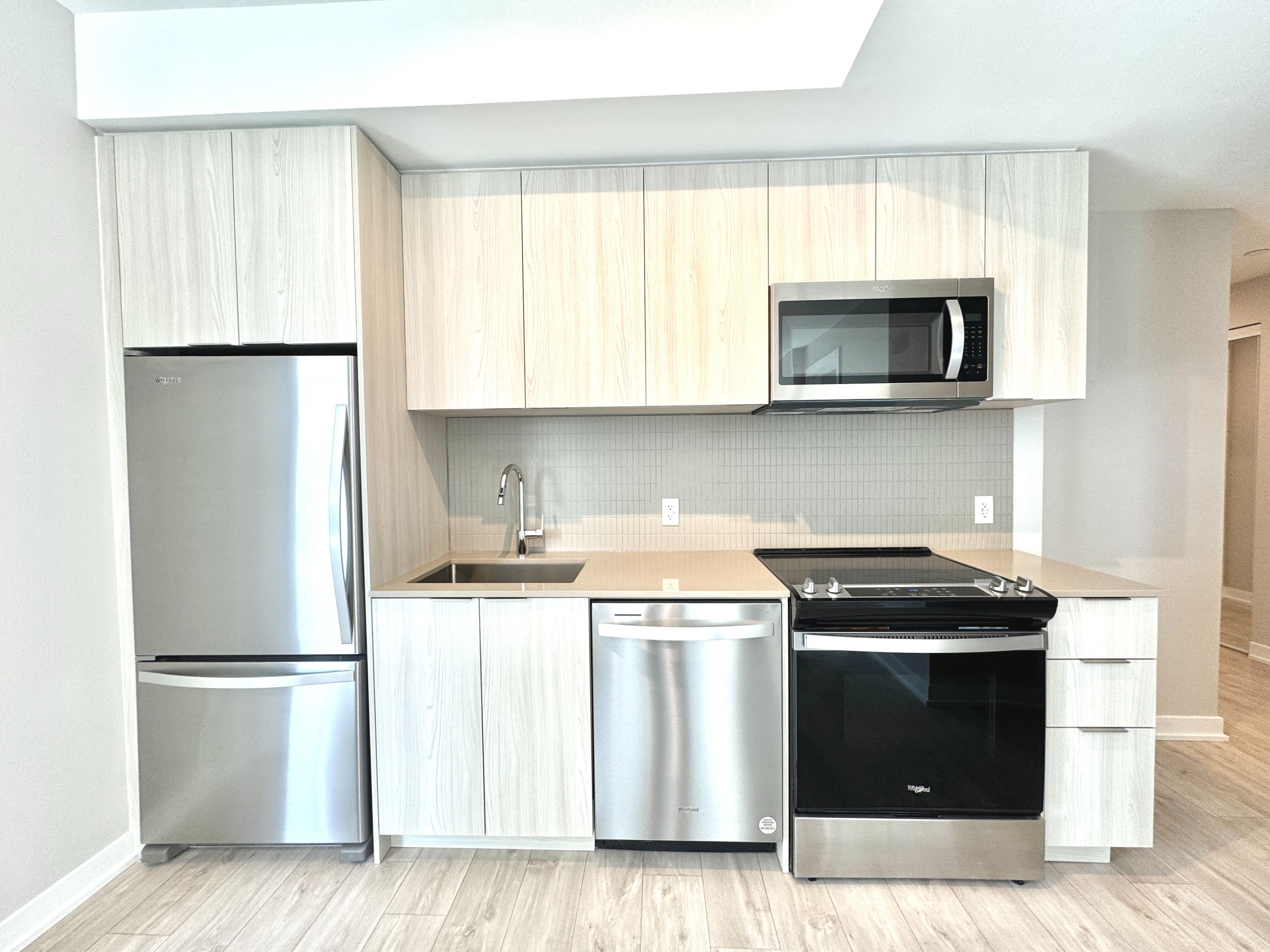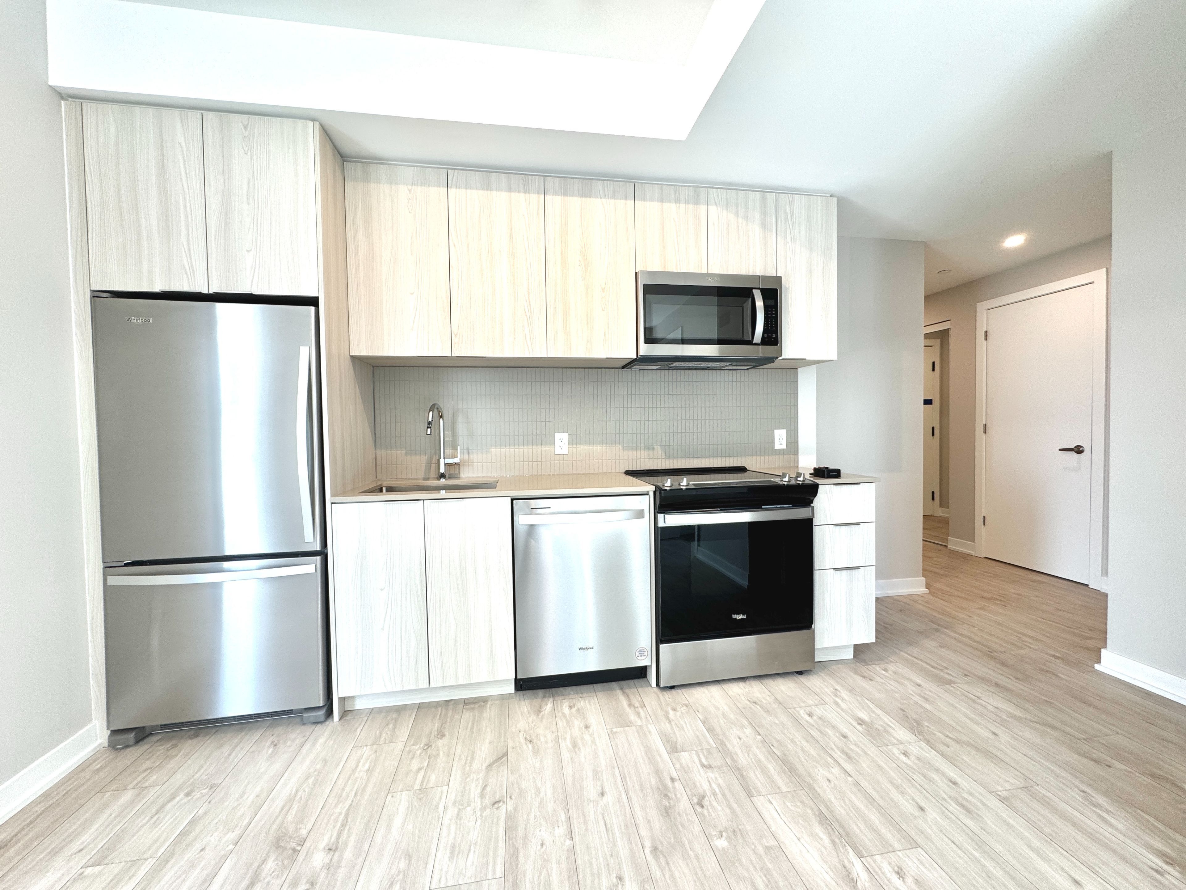 • Modern kitchen with stainless steel appliances and quartz countertops.
