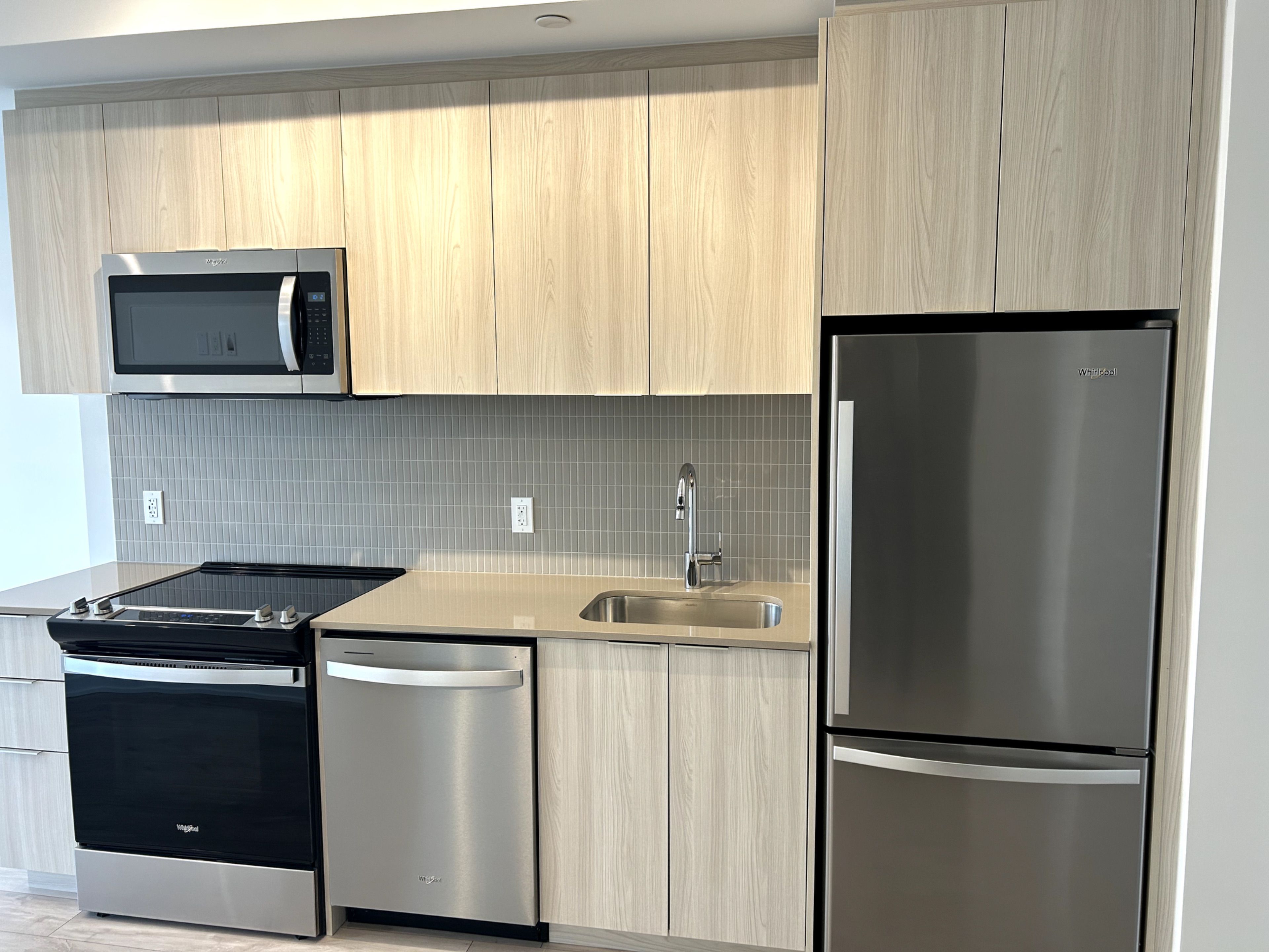 • Contemporary kitchen with stainless steel appliances and upgraded finishes.