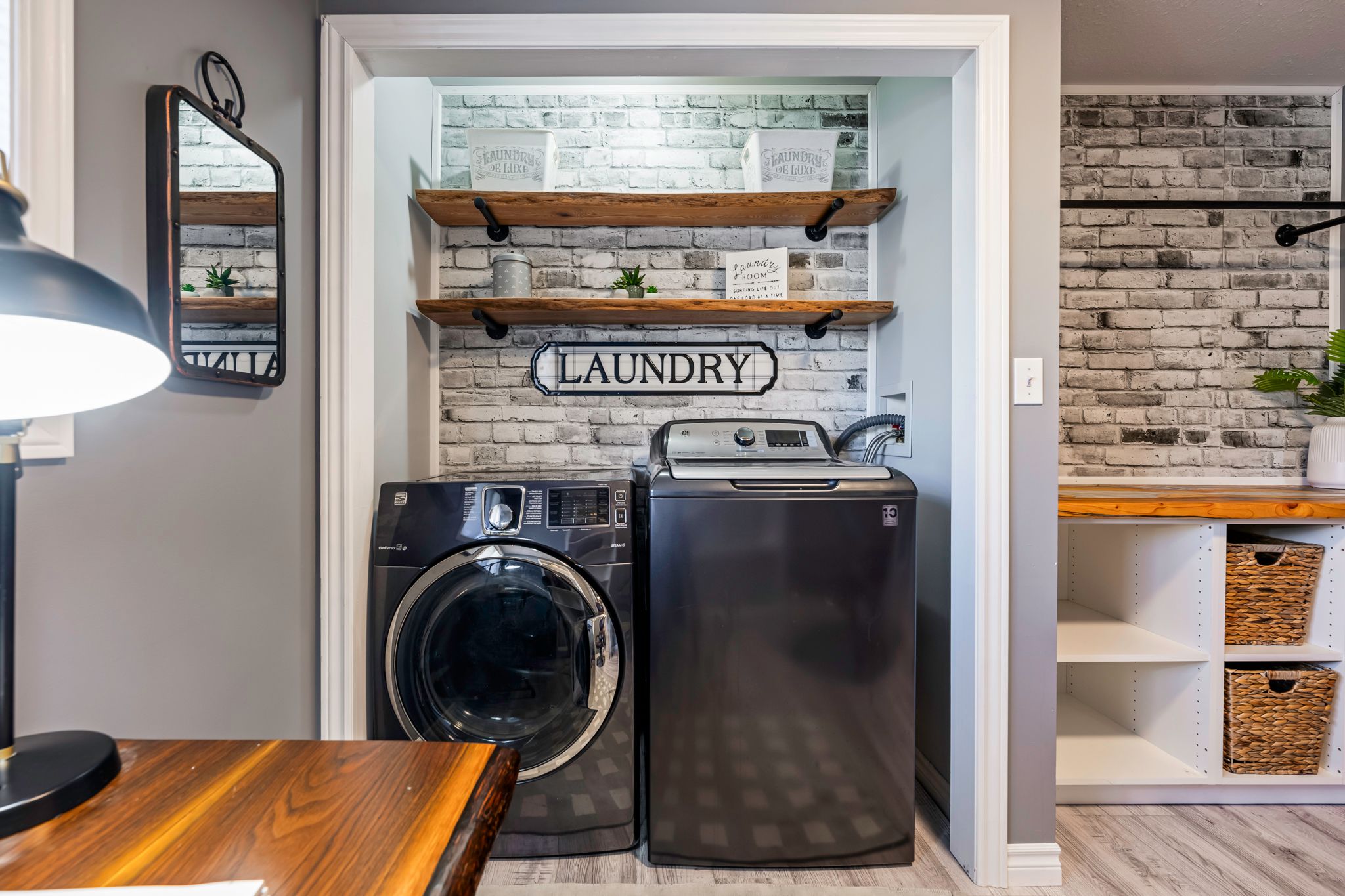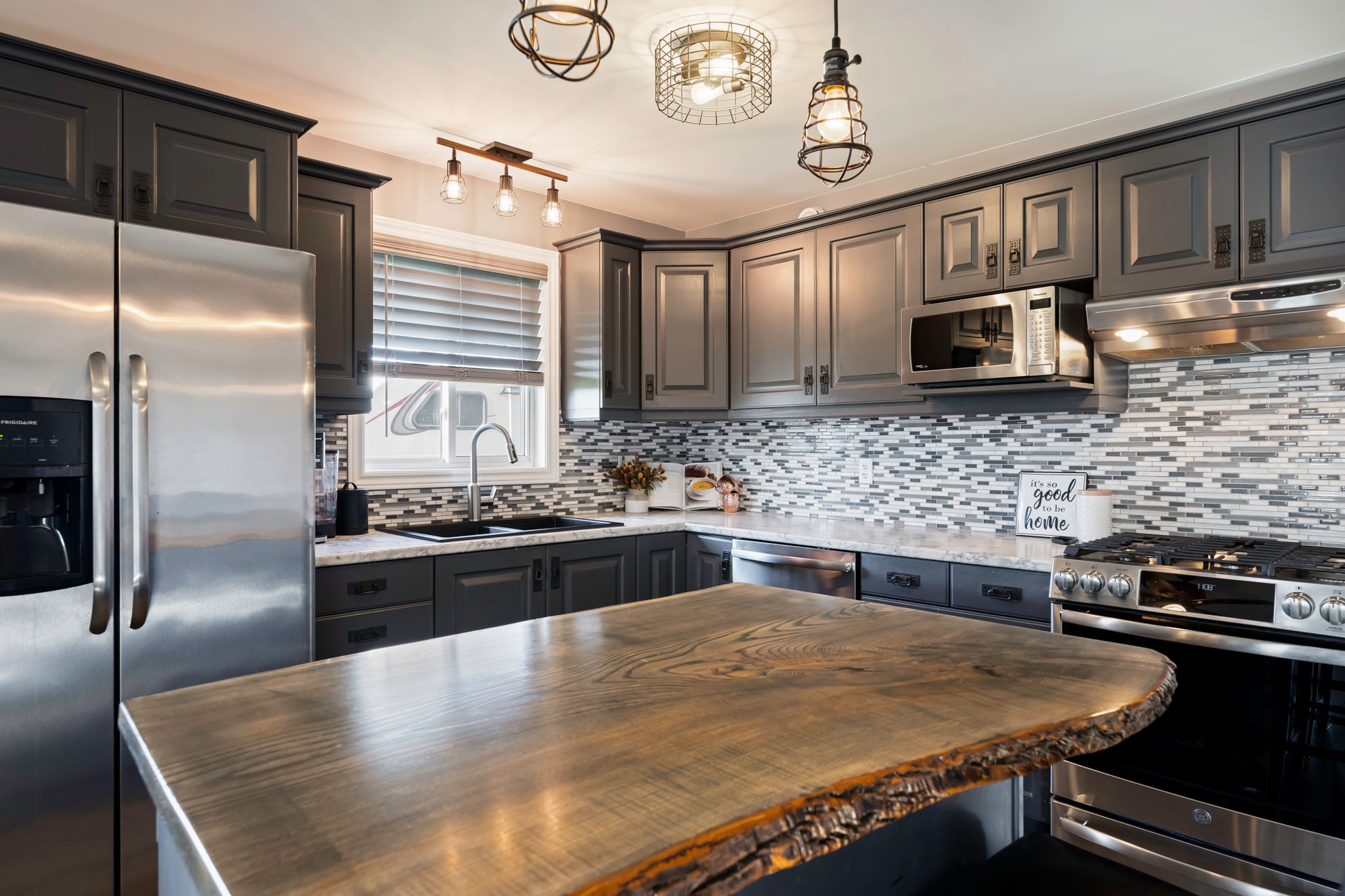 • Renovated kitchen features stainless steel appliances and a custom live-edge island.