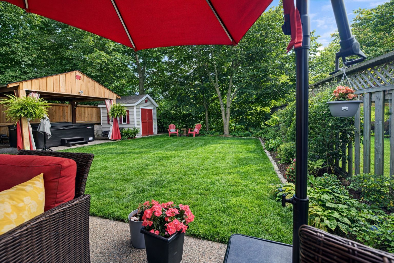 • Outdoor oasis with hot tub, gazebo, and lush gardens for relaxation.