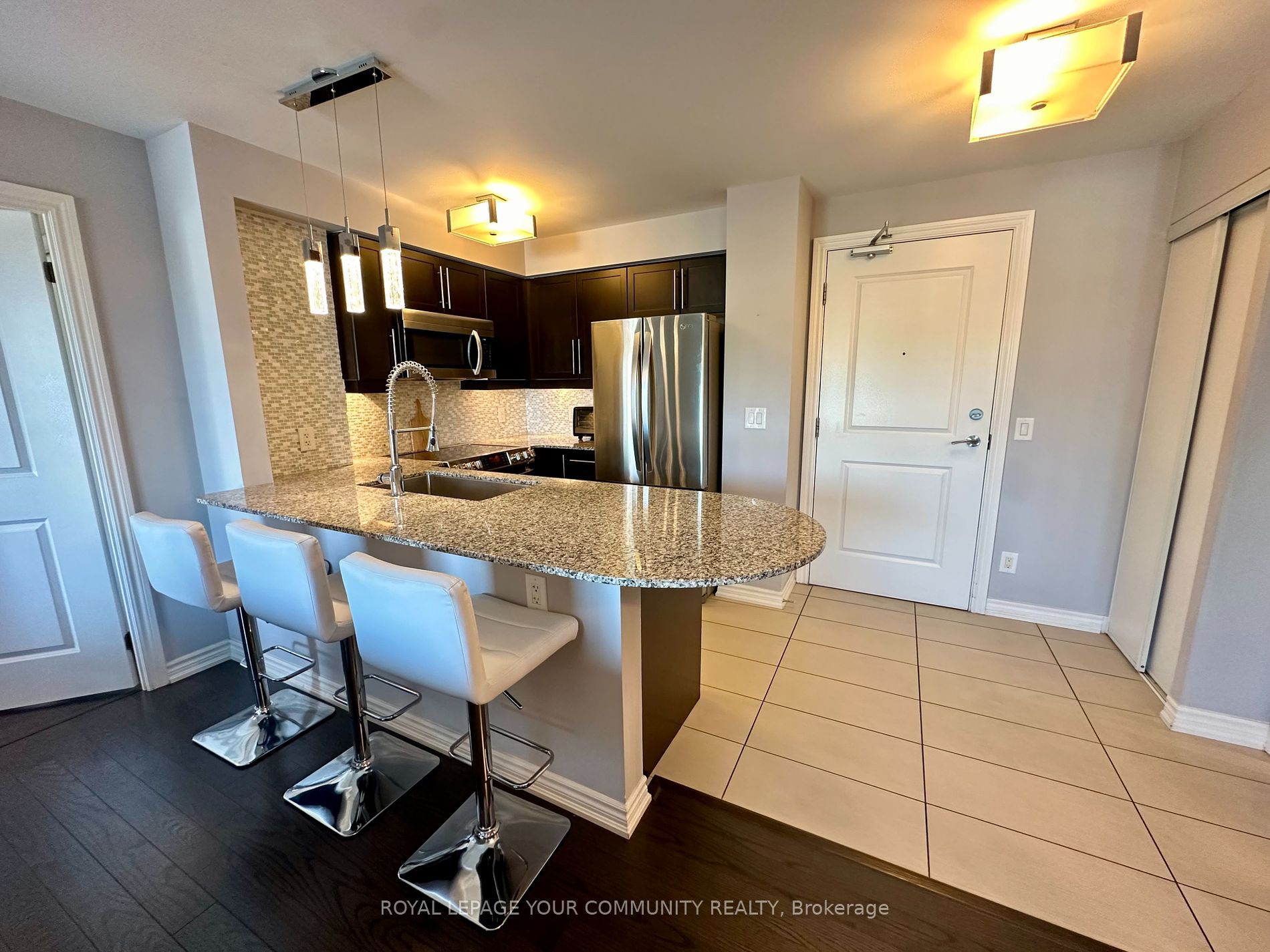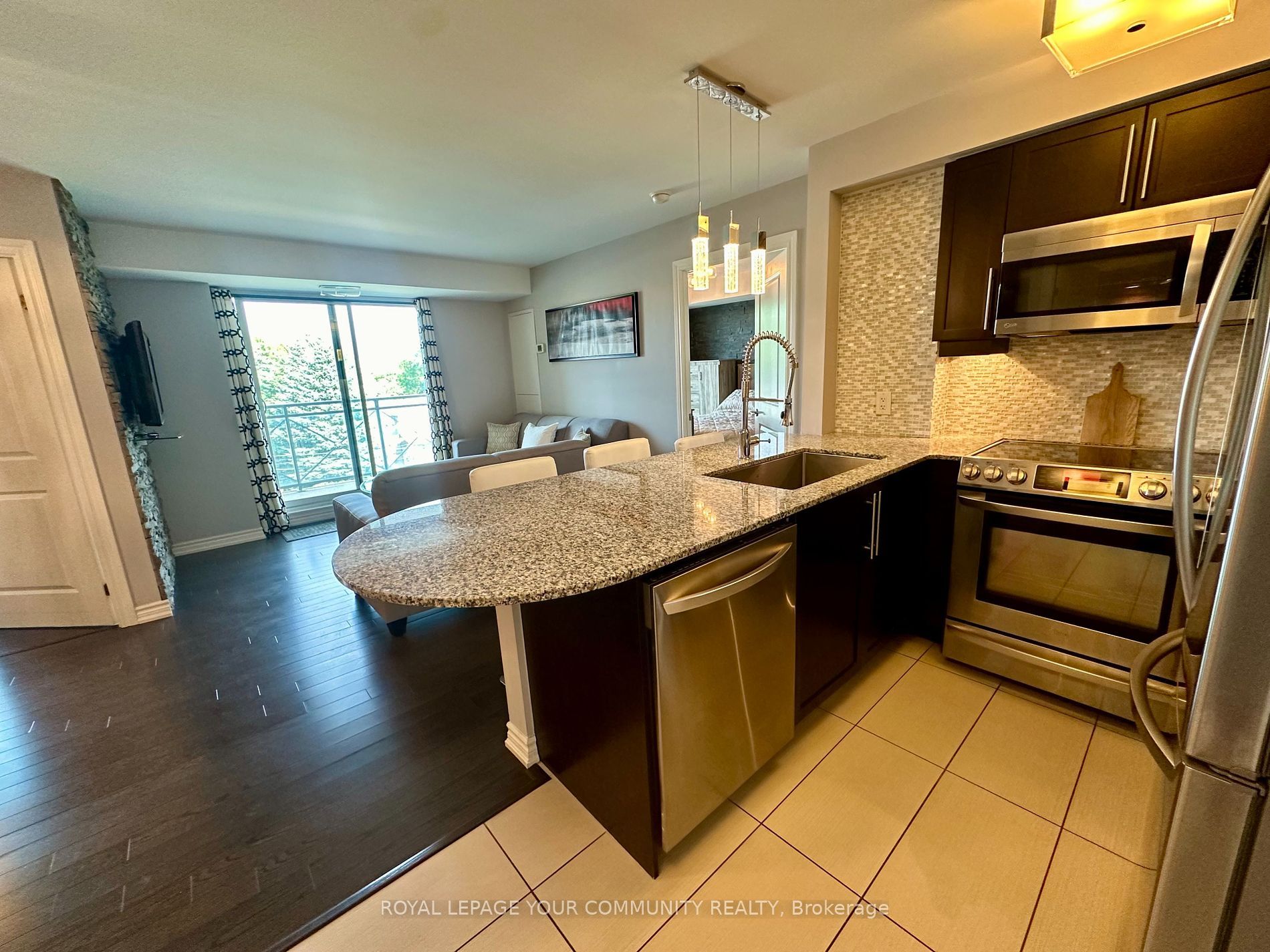 • Modern kitchen with granite countertops and stainless steel appliances.