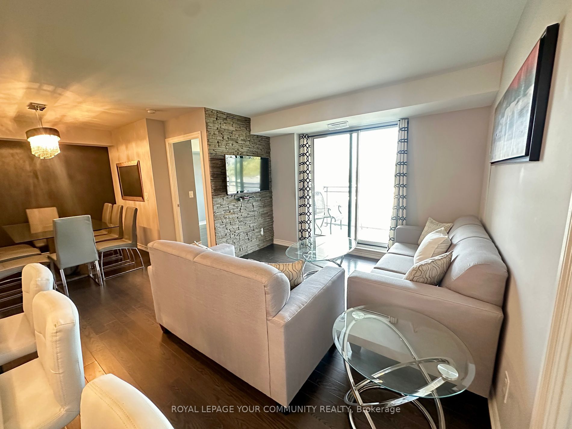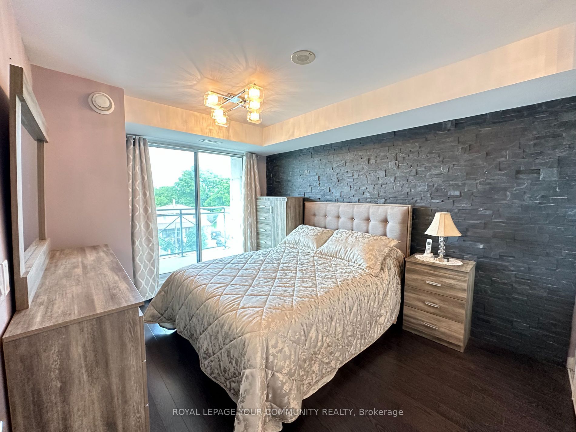 • Bright living space with trendy lighting and stone feature walls.