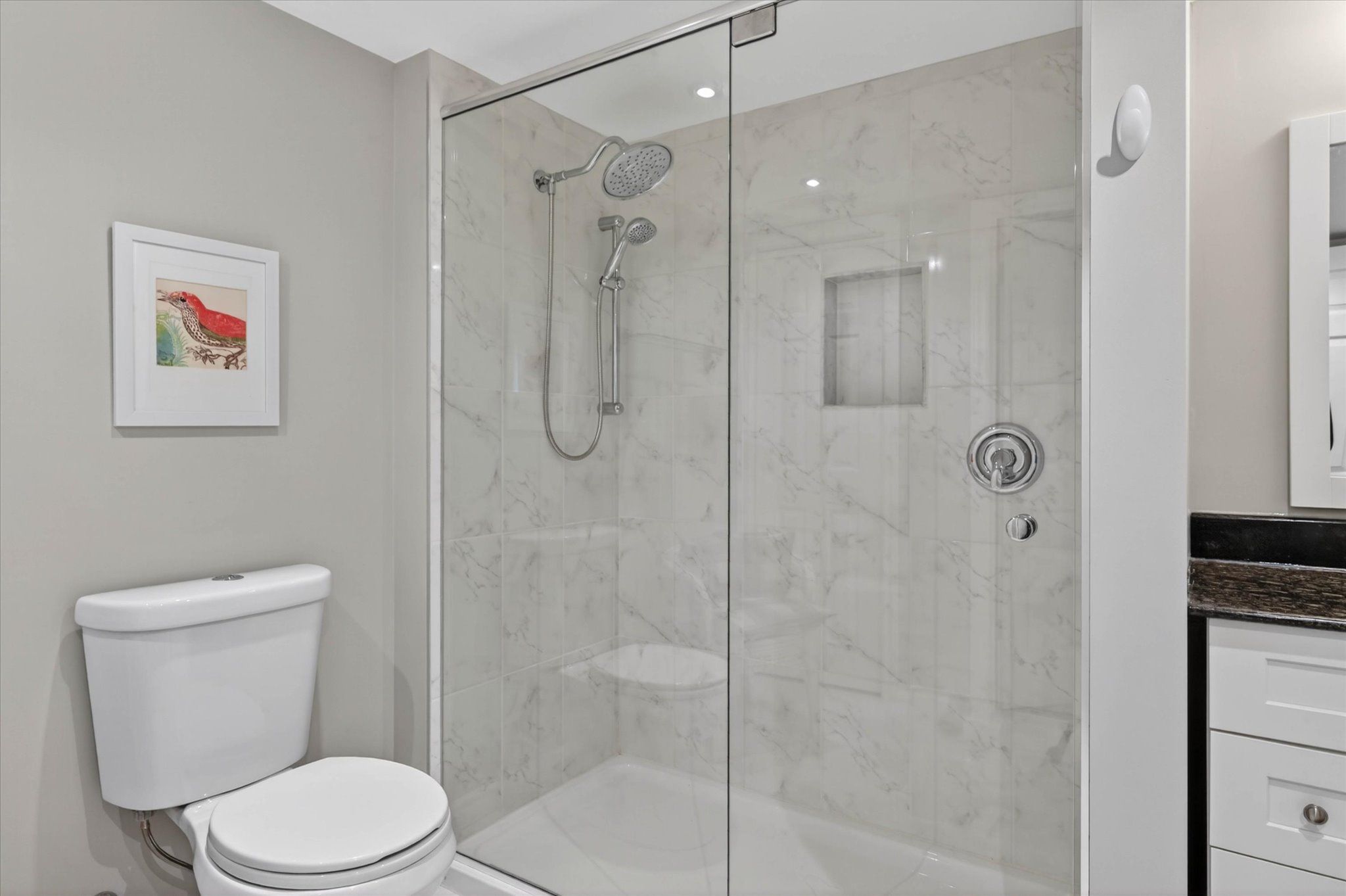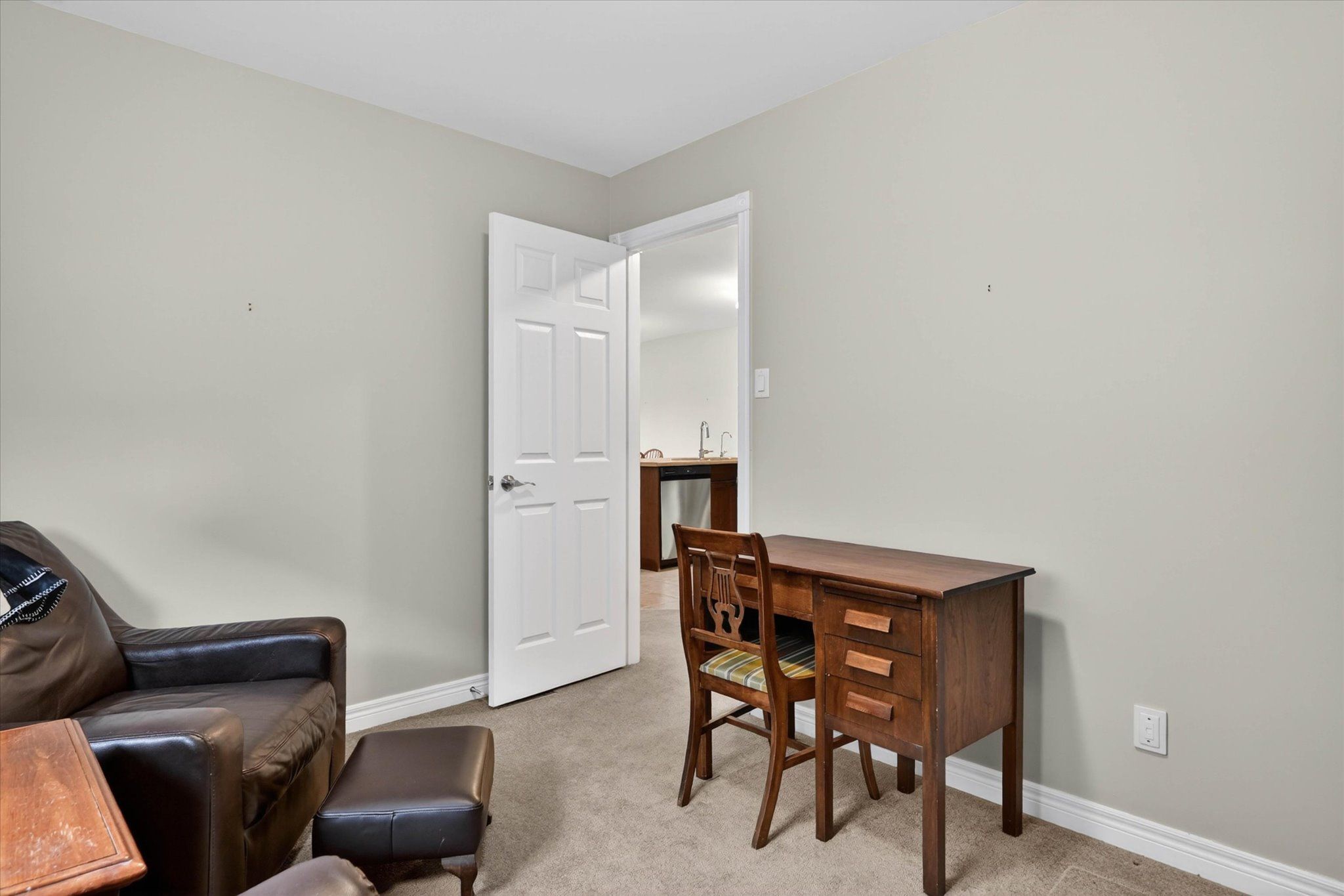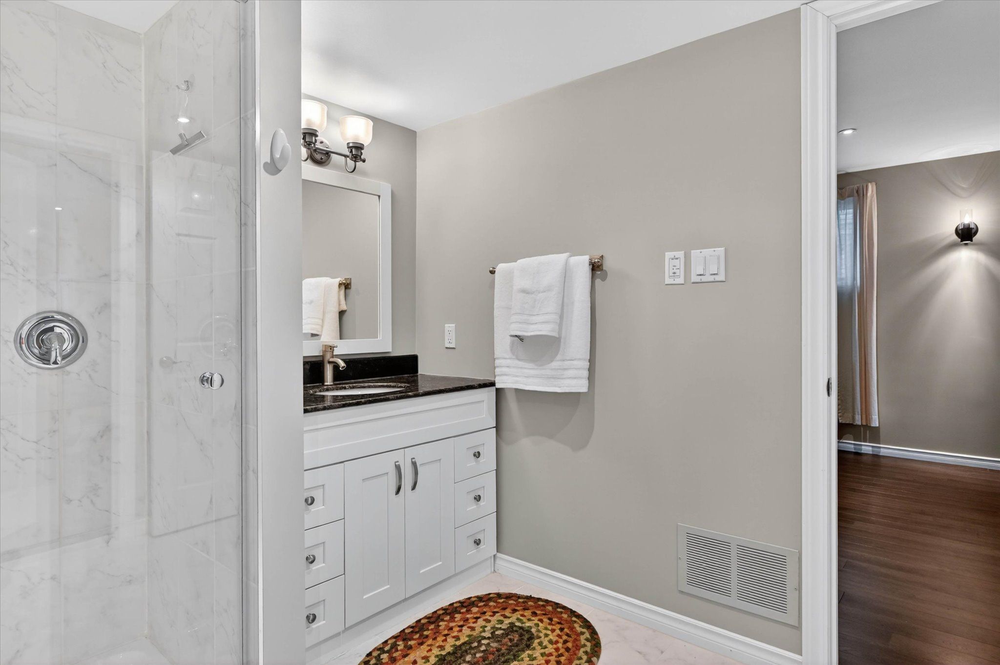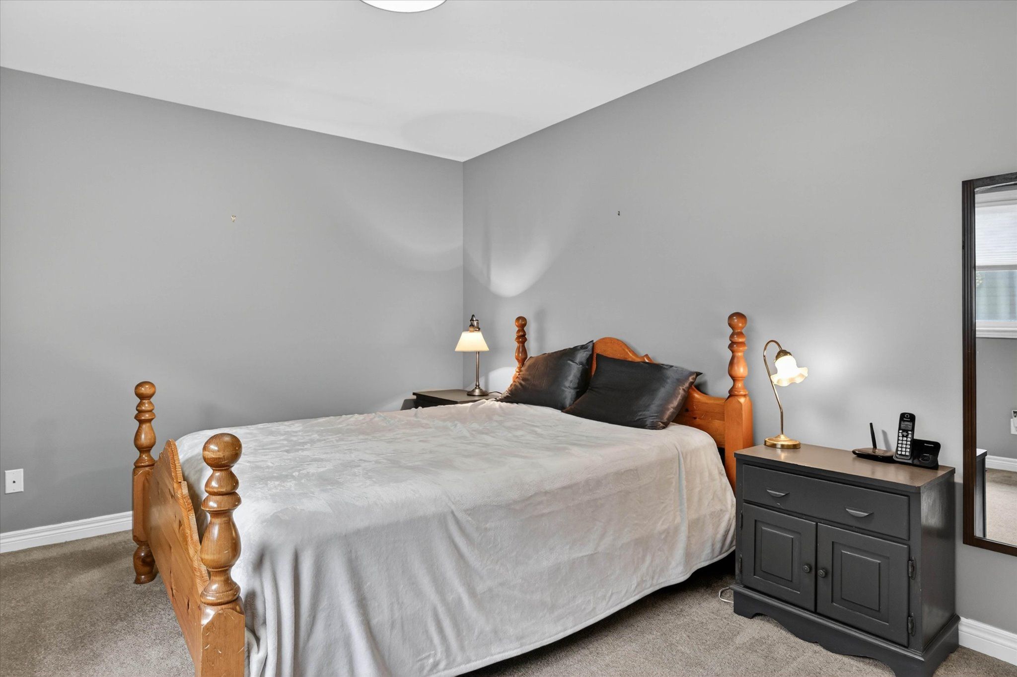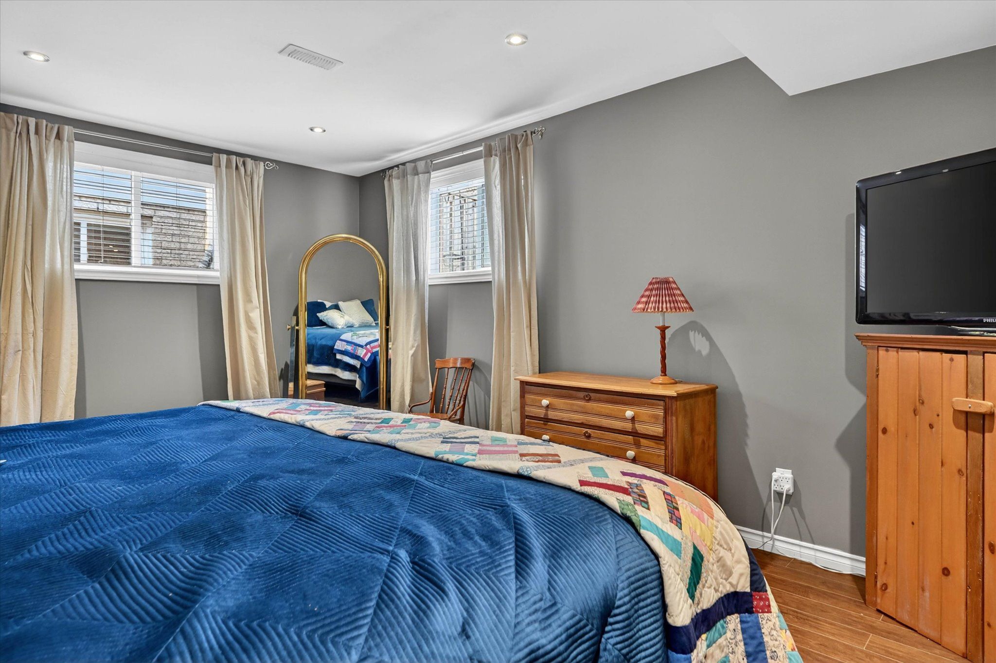• Spacious lower-level bedroom with semi-ensuite bath and lookout windows.
