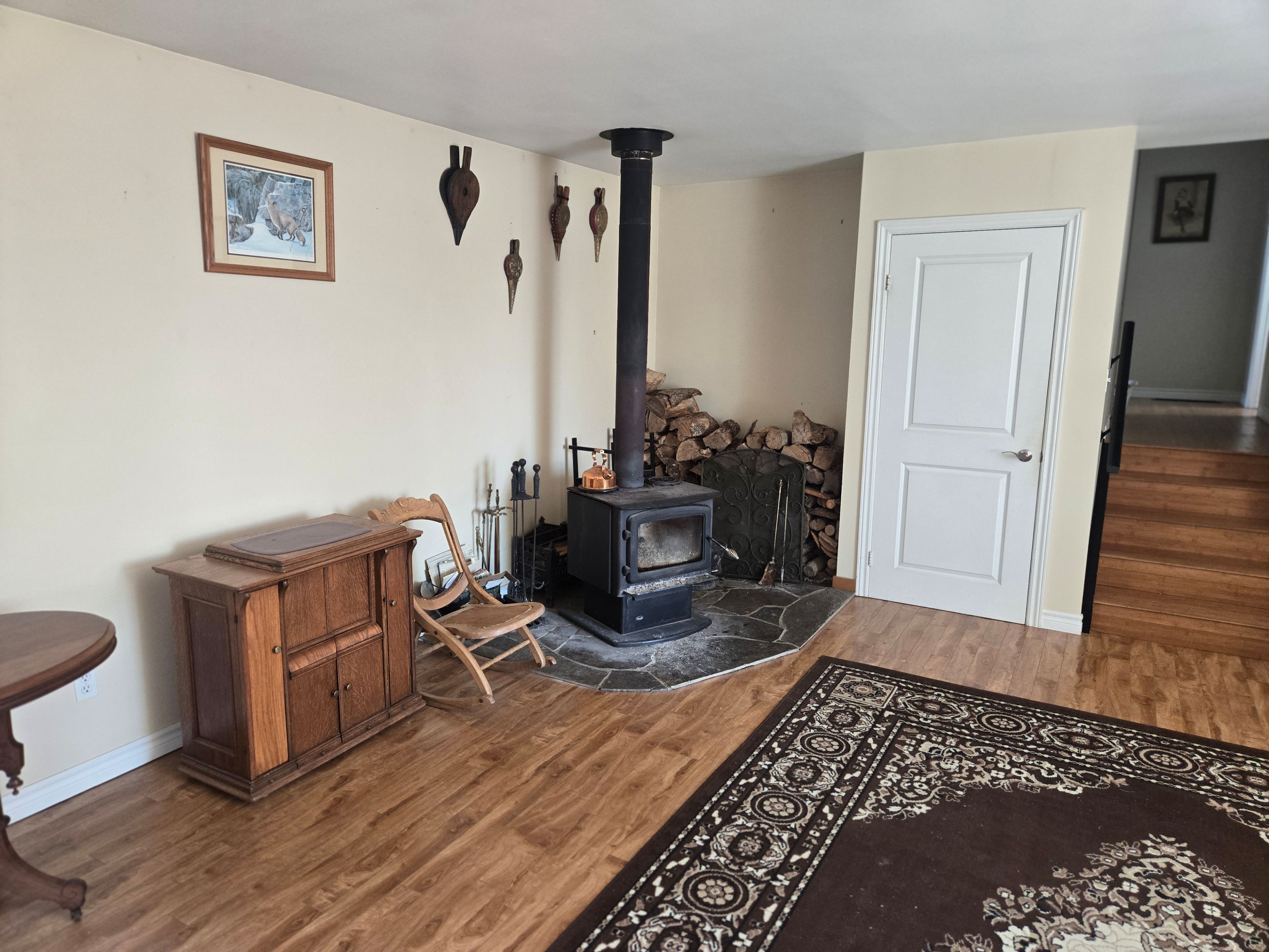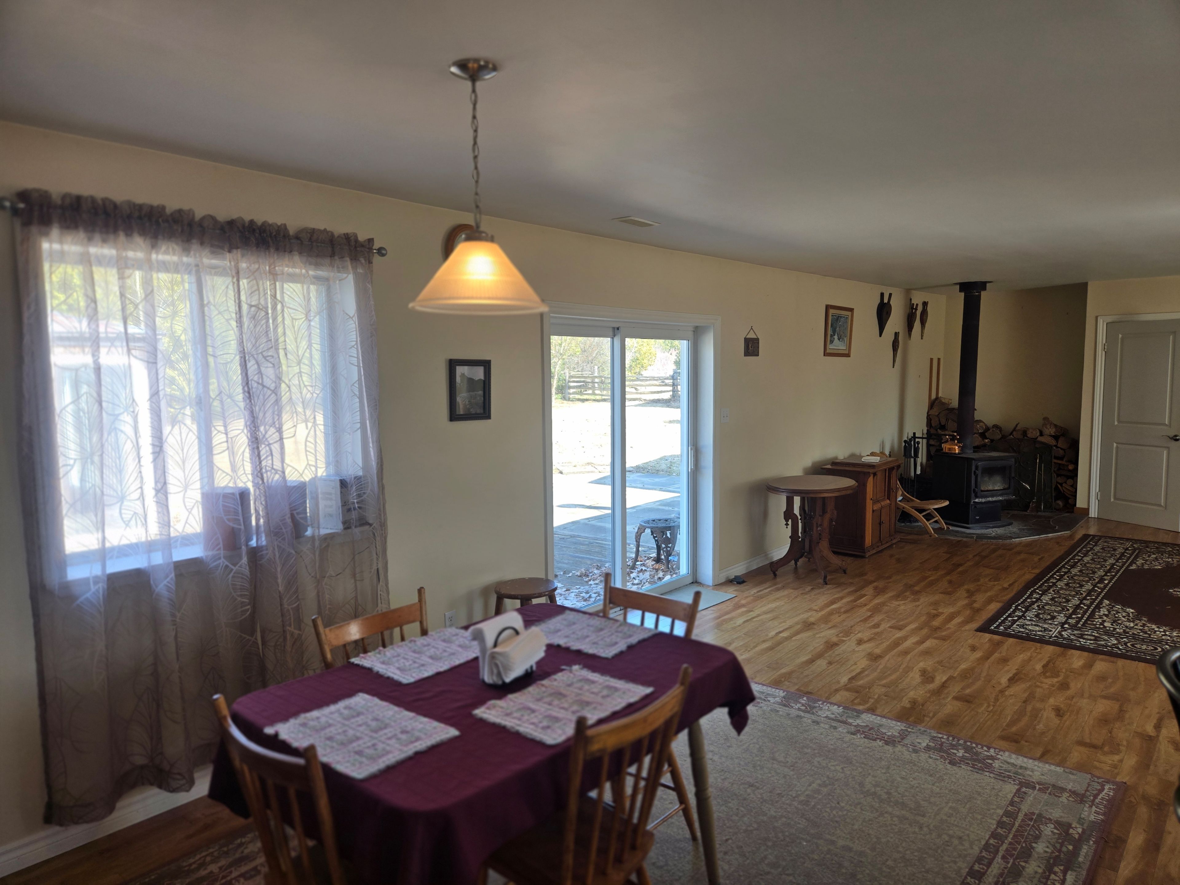 • Cozy woodstove and efficient in-floor heating throughout.