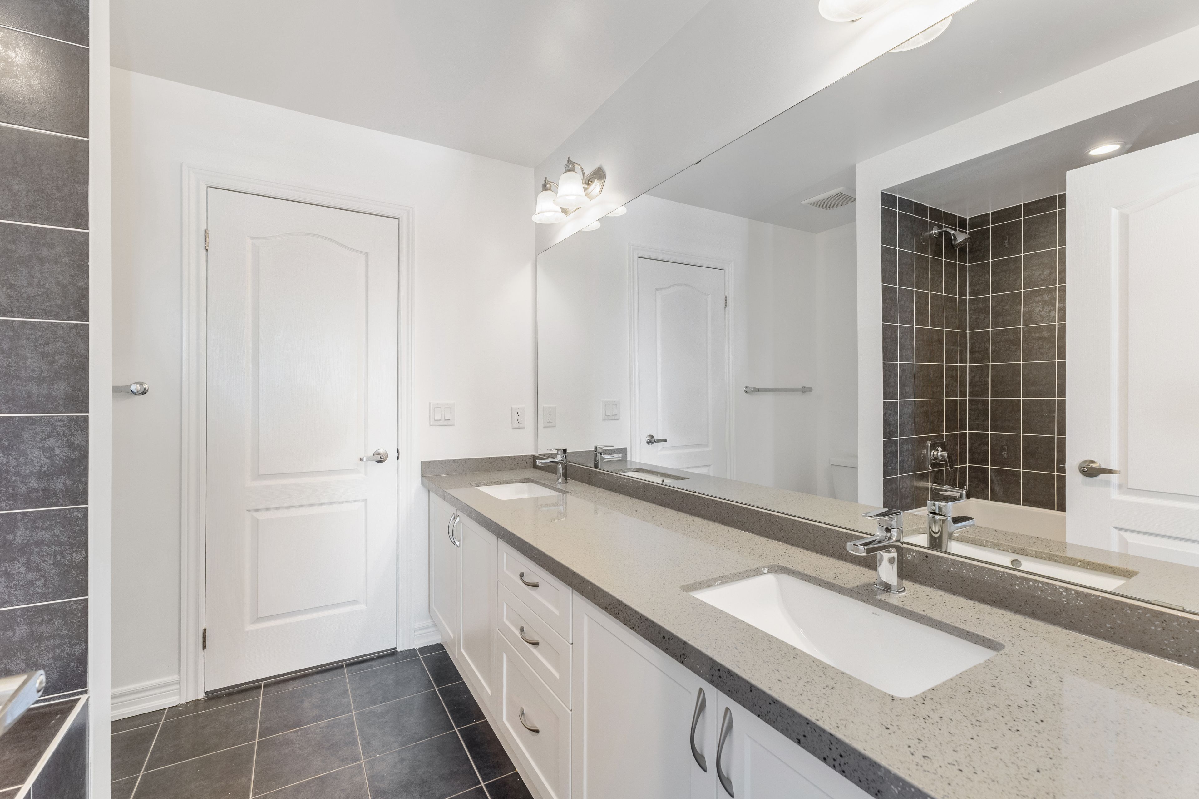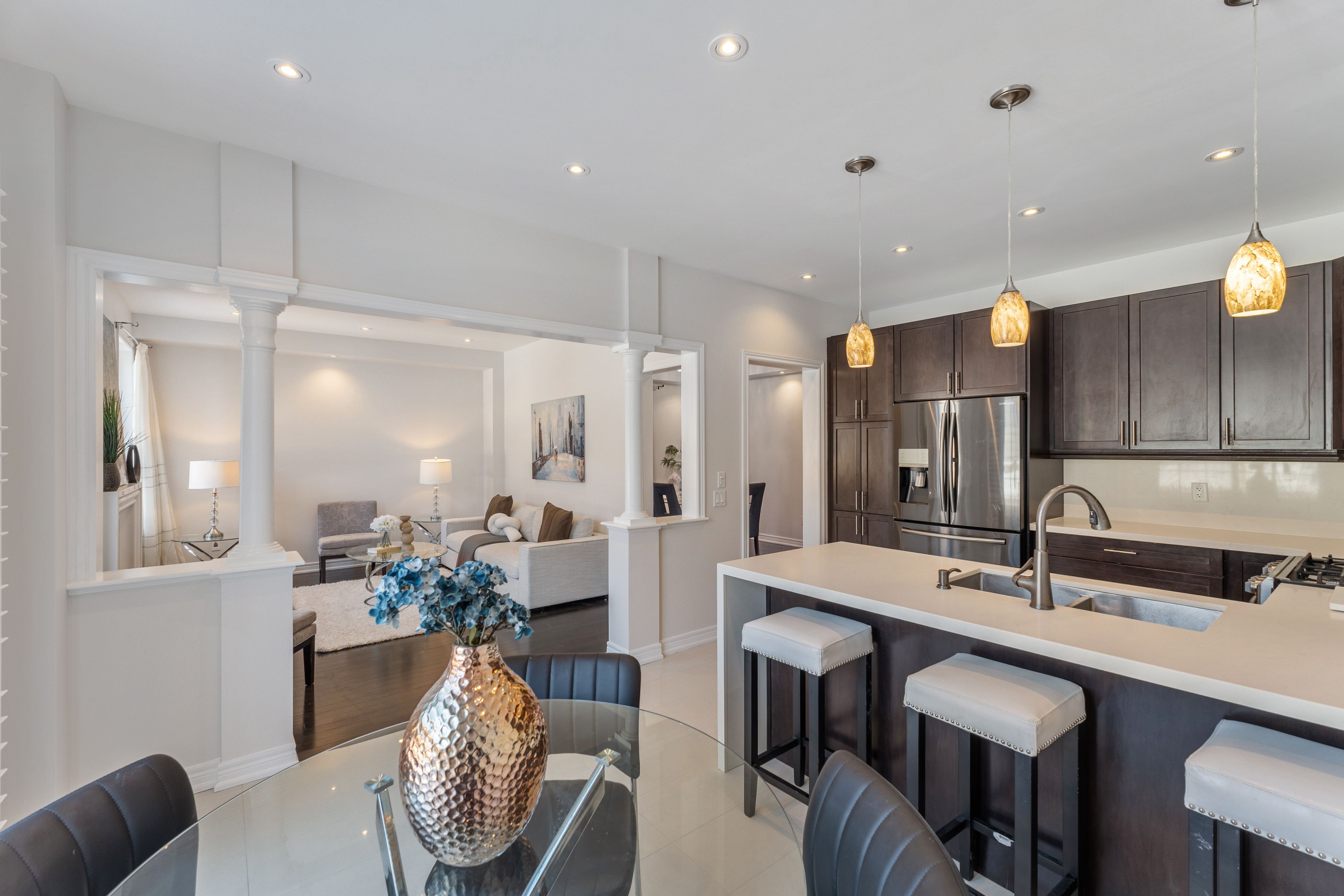 • Stylish kitchen with high-end appliances and a beautiful quartz waterfall countertop.