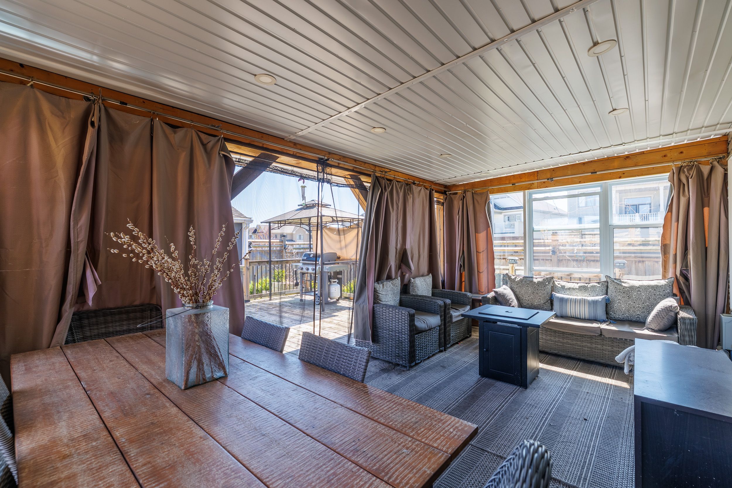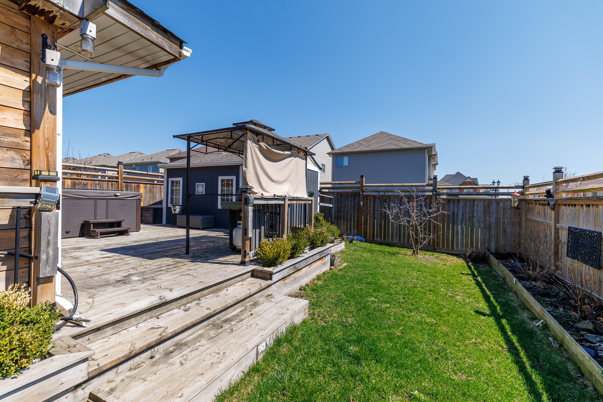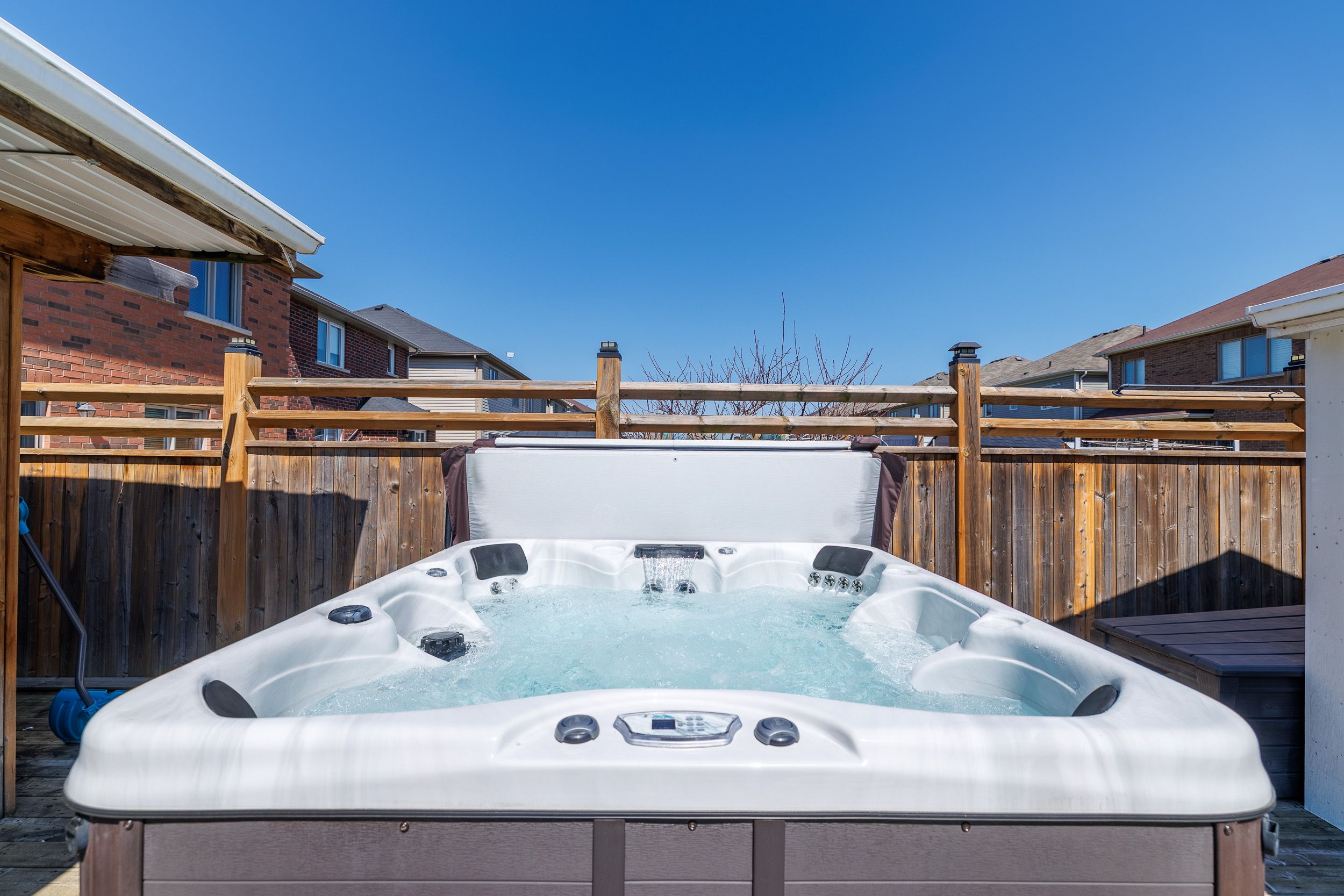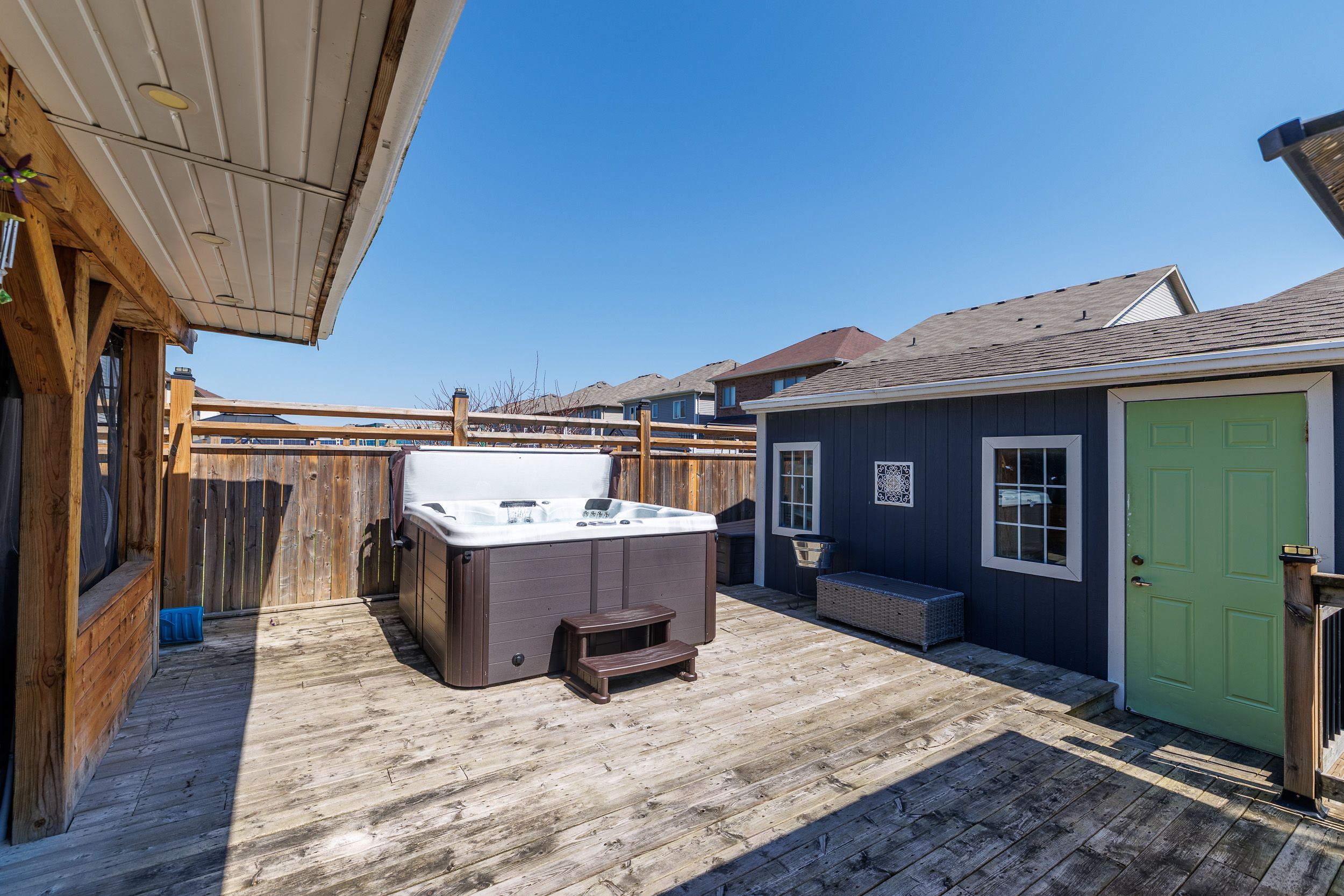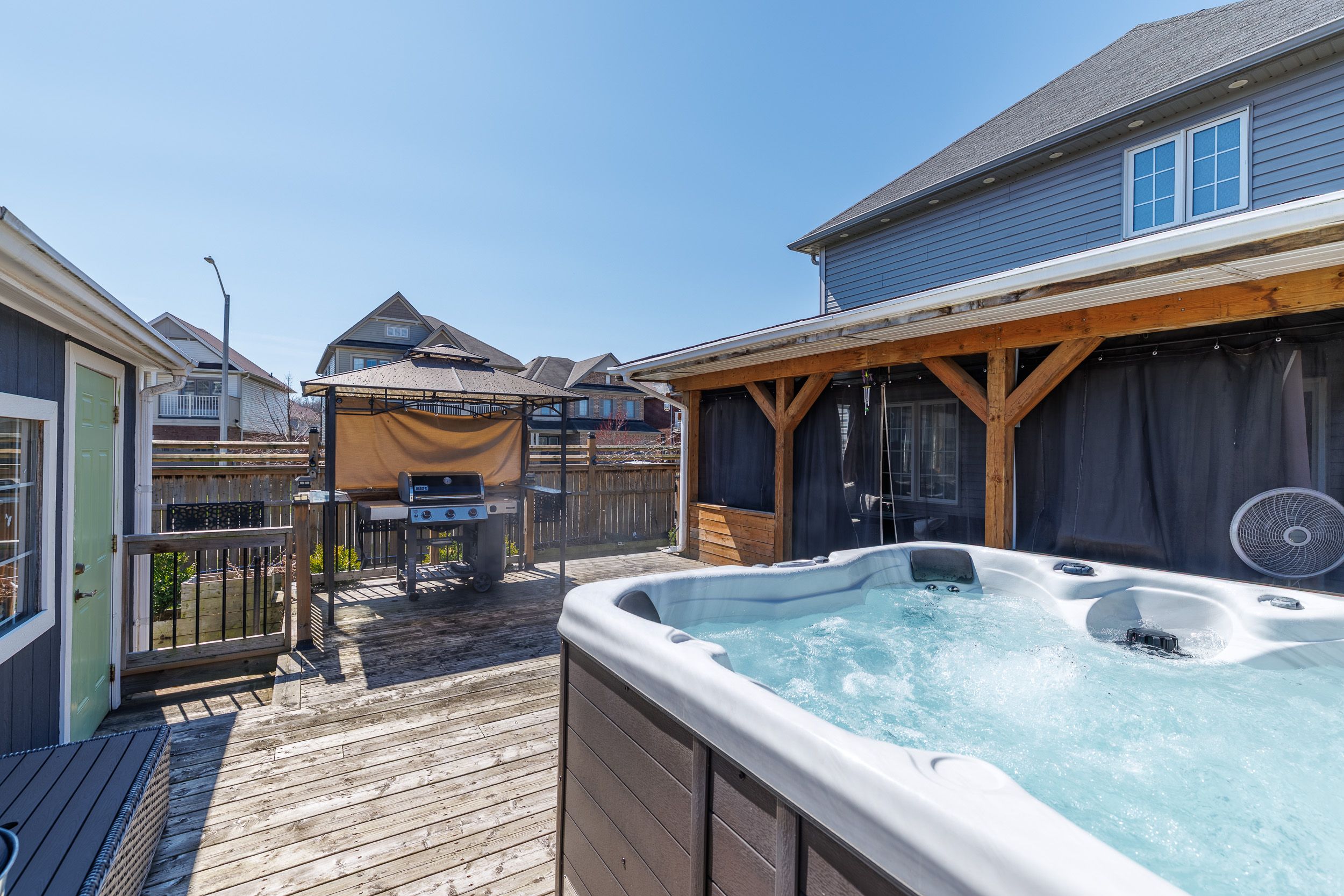 • Private covered deck and hot tub overlooking a fenced backyard.