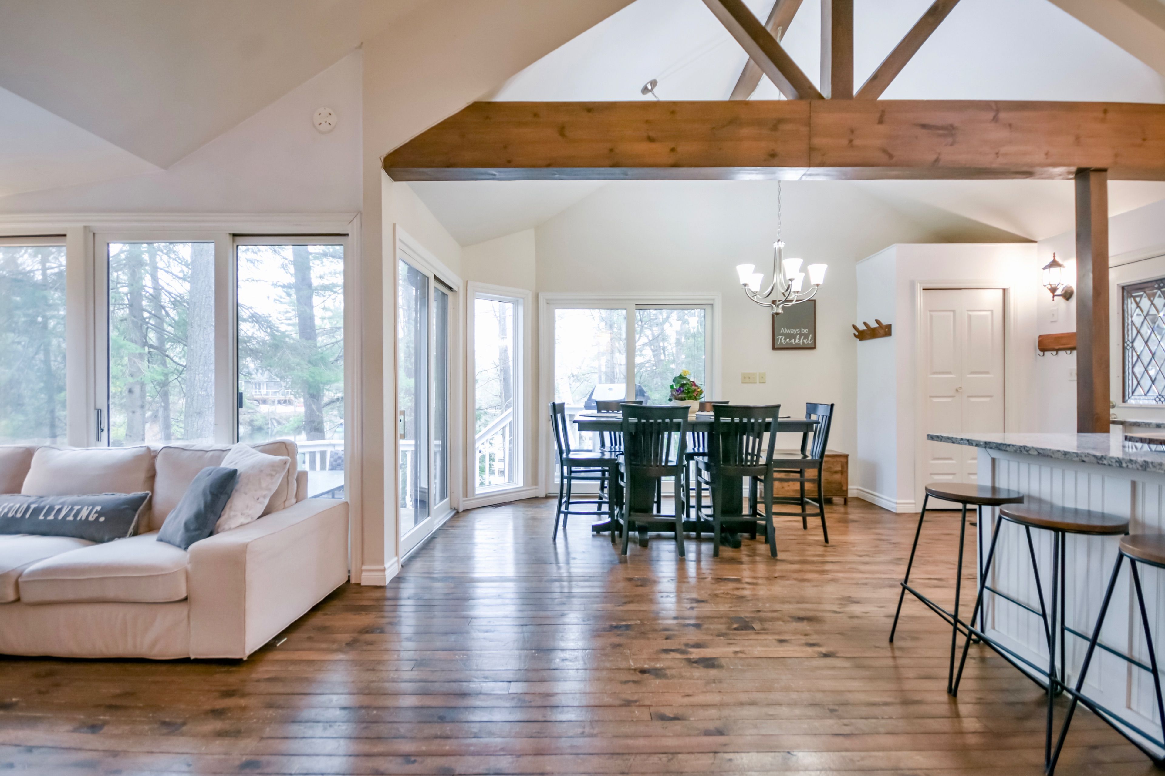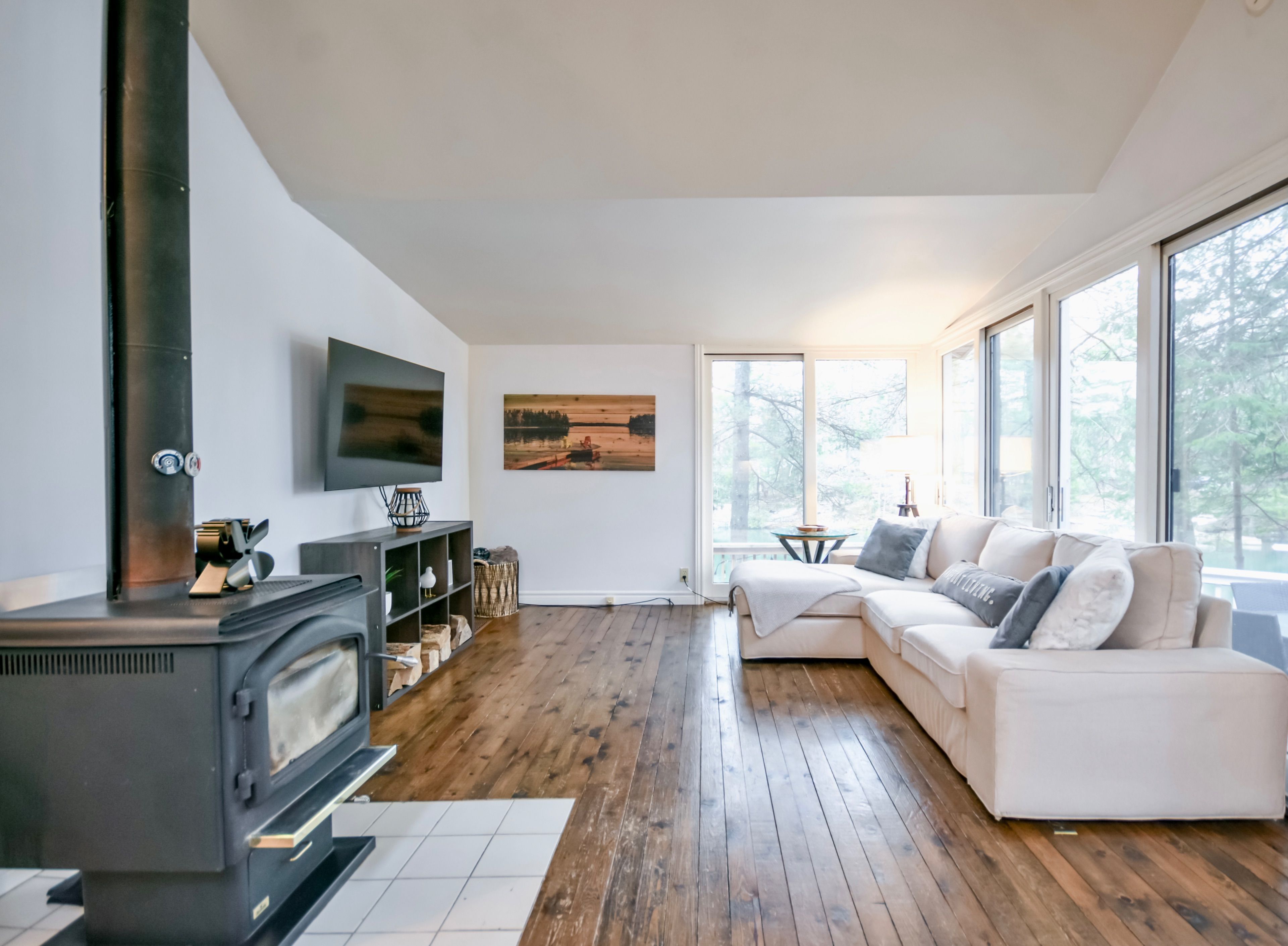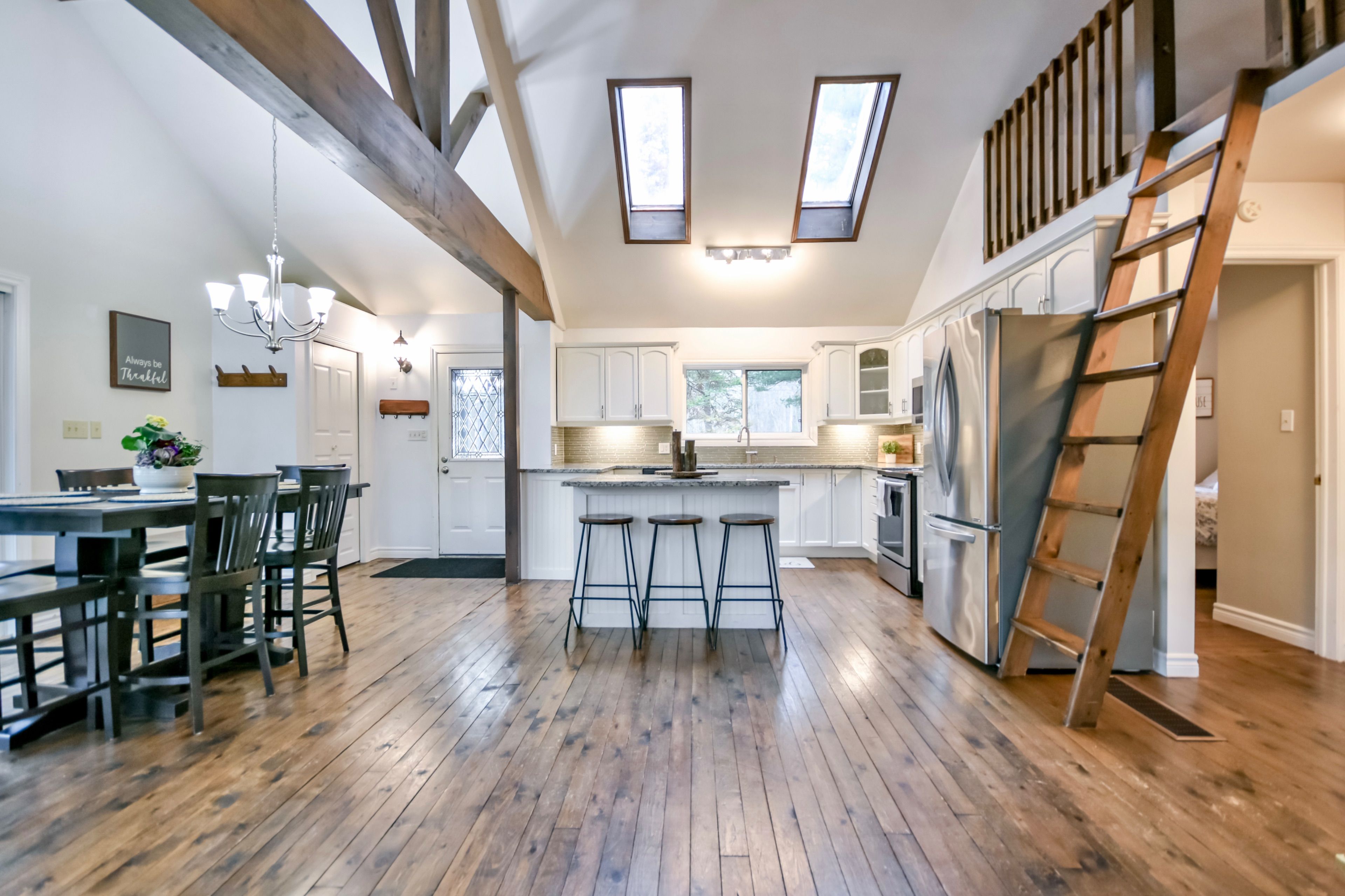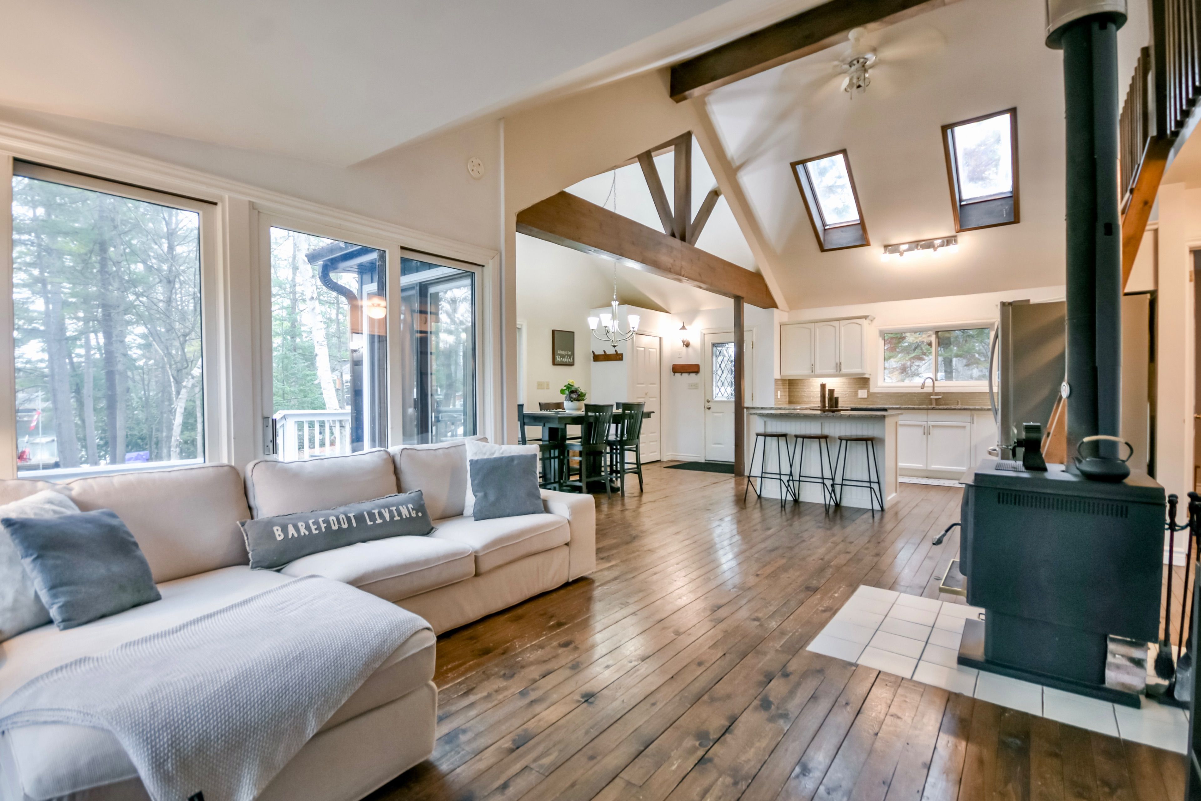 Welcome to your peaceful riverside escape on the beautiful green river. This charming 2 bedroom + loft, 1 bathroom home is perfectly positioned among mature trees with picturesque water views just steps from your door. Thoughtfully designed with a bright open-concept layout, the home features hardwood floors, large windows that flood the space with natural light, and a cozy wood-burning fireplace creating a warm and inviting atmosphere. The modern kitchen and adjoining dining area offer a comfortable space for everyday living as well as entertaining. Outside, enjoy your private dock with direct access to the green river, ideal for swimming, paddling, fishing, or simply taking in the tranquility of the water. Offering the perfect balance of nature and convenience, this property is located just minutes from highway 11 for nearby amenities, making shopping, dining, and everyday essentials easily accessible while still enjoying the serenity of waterfront living. Book your private showing today!